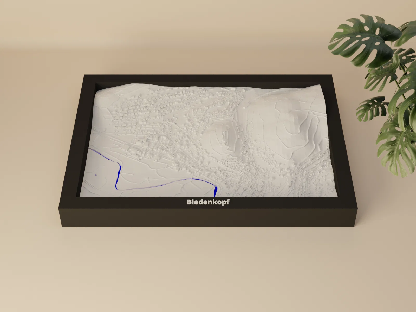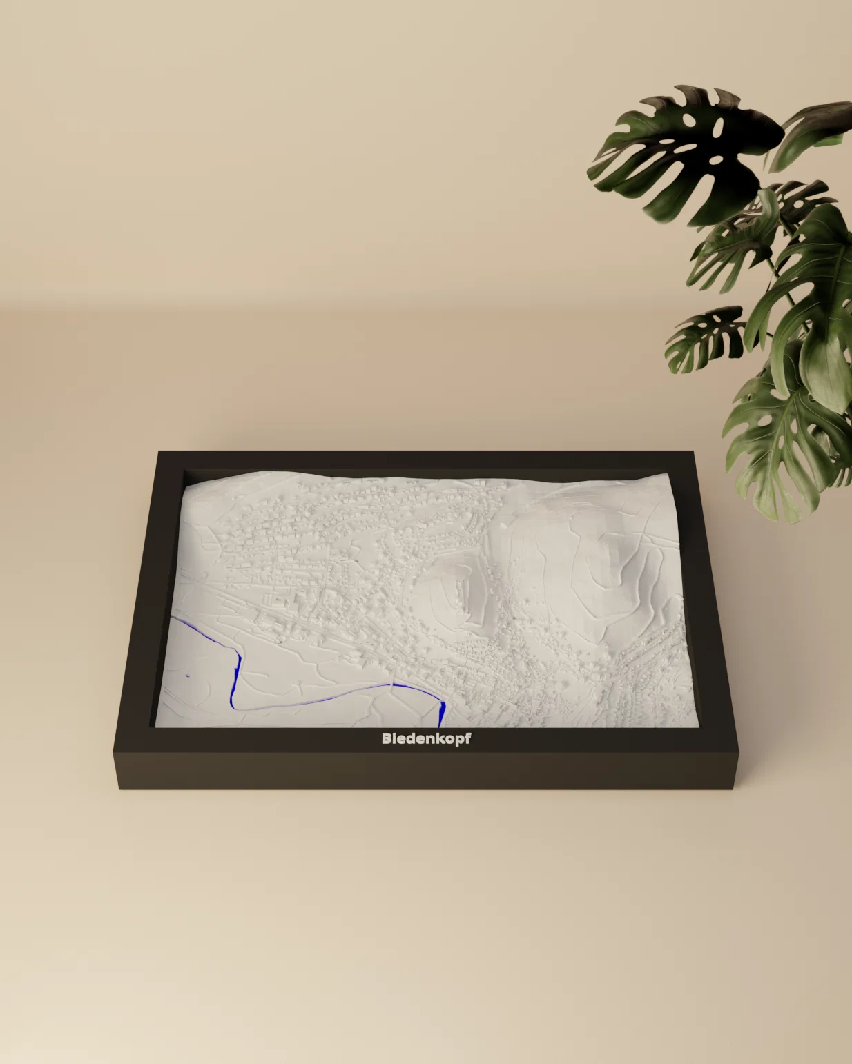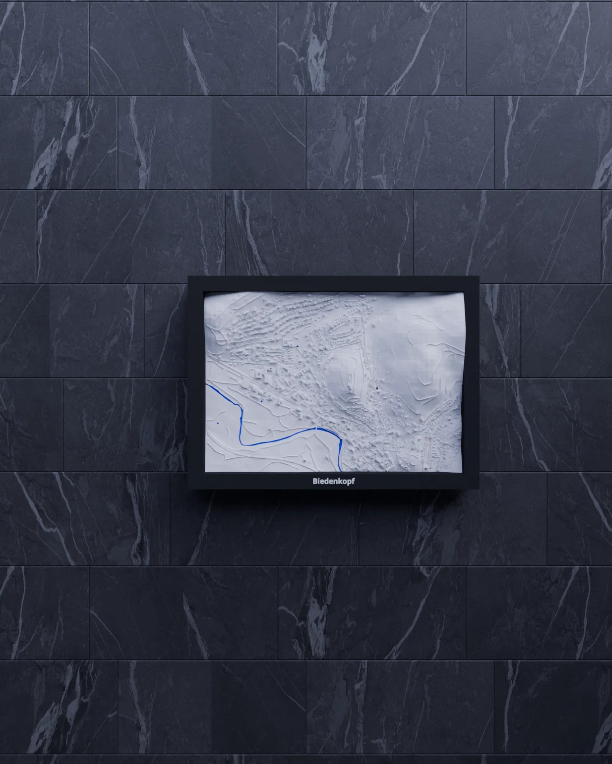Mô hình thu nhỏ địa hình (topographic) của Biedenkopf, Đức, dựng từ dữ liệu địa lý để in 3D chân thật. Kích thước 170.5 x 119.5 mm, có các frame kèm lỗ treo, phù hợp trưng bày, học tập và quà tặng.