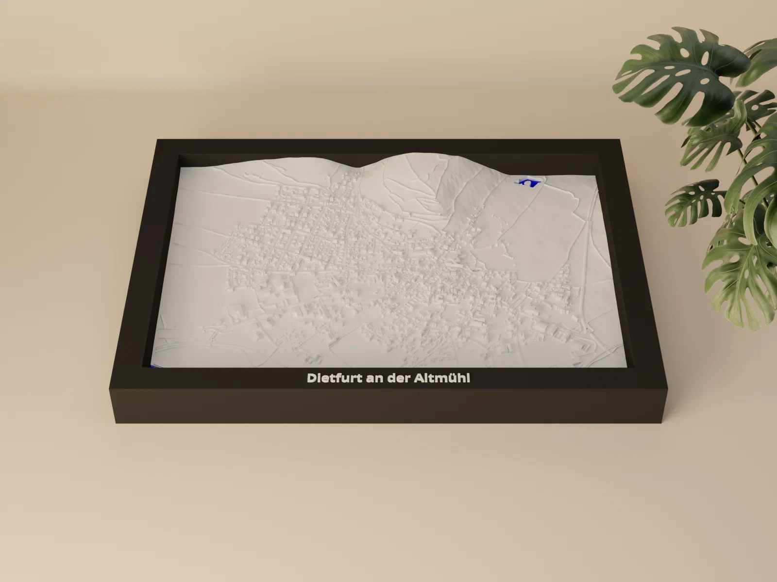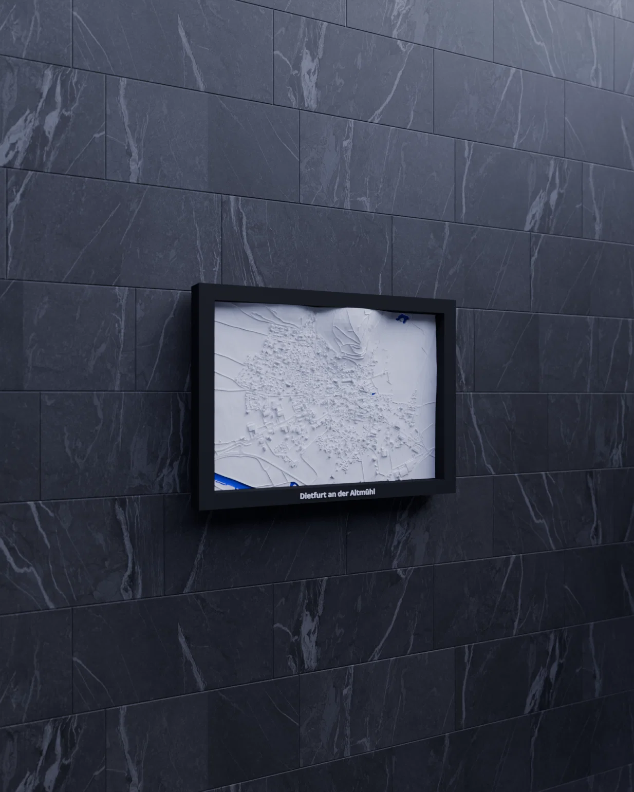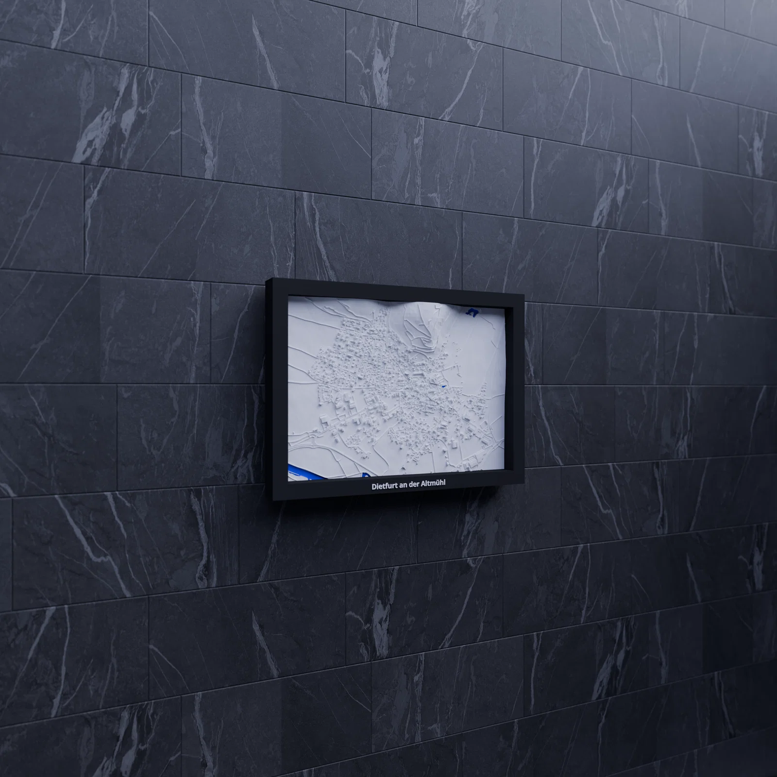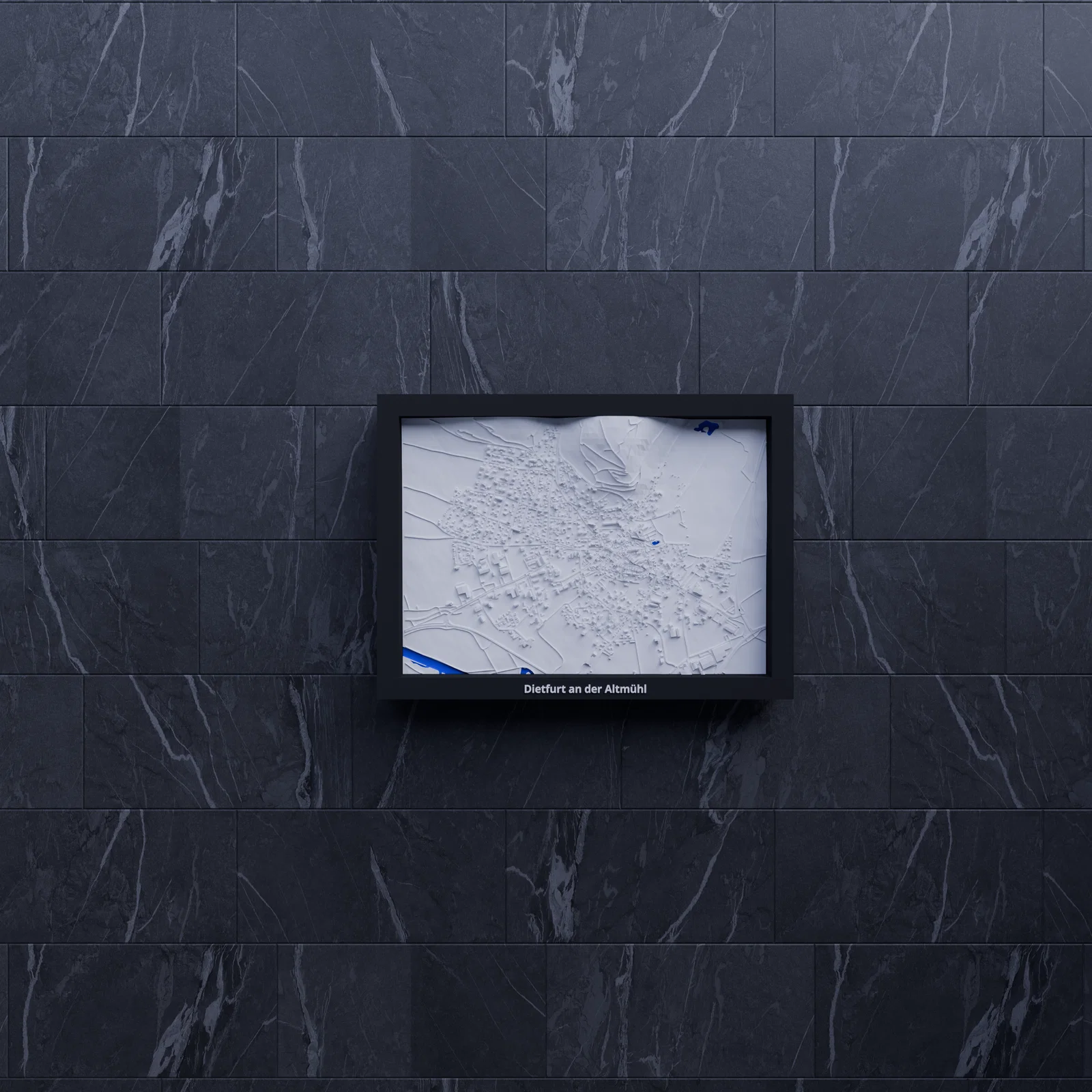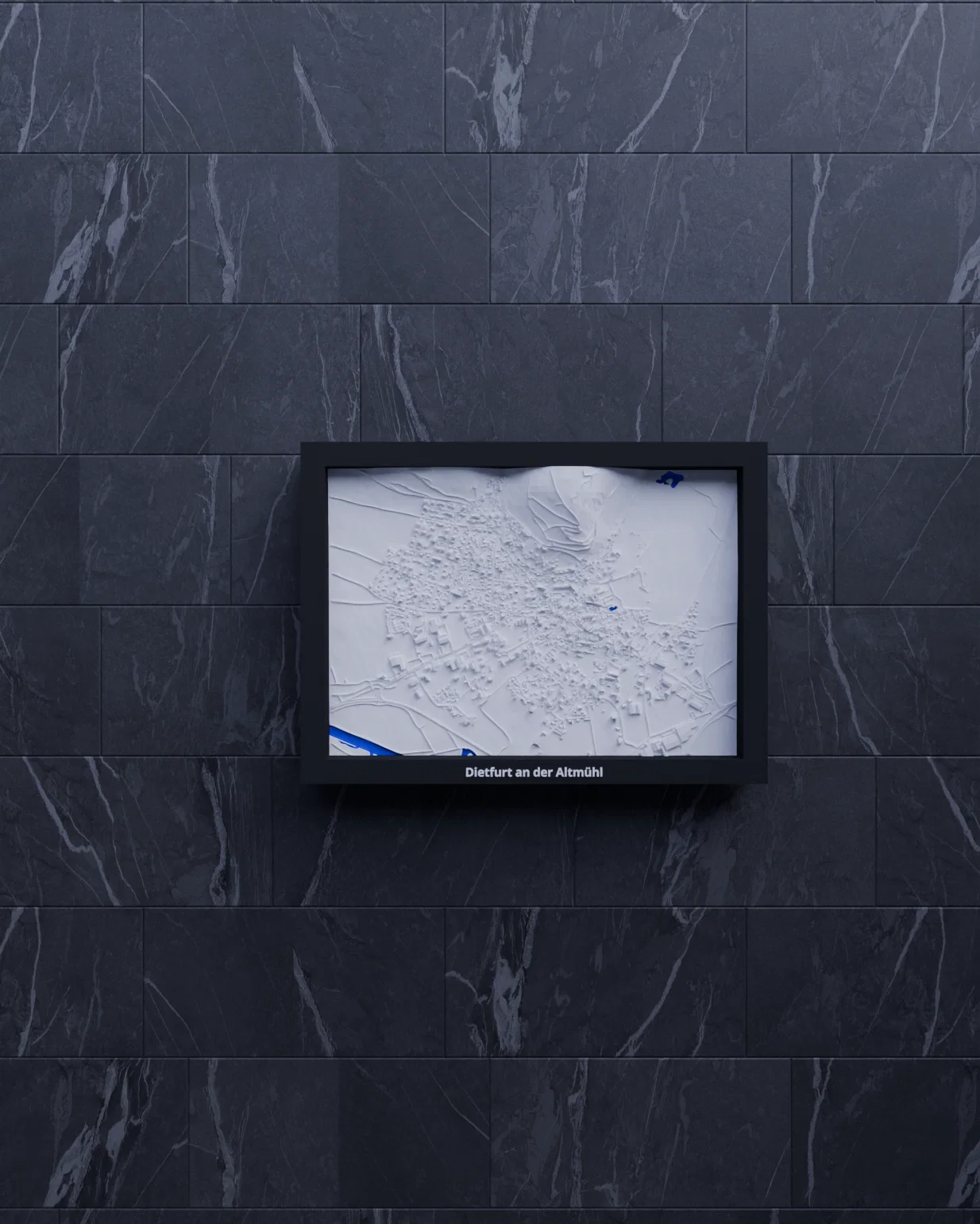 Miniature địa hình 3D tái hiện Dietfurt an der Altmühl (Đức) từ dữ liệu địa lý, thu nhỏ còn 170.5 × 119.5 mm, tỉ lệ ~12024:1. Có nhiều frame kèm lỗ treo, phù hợp in trang trí, học tập.