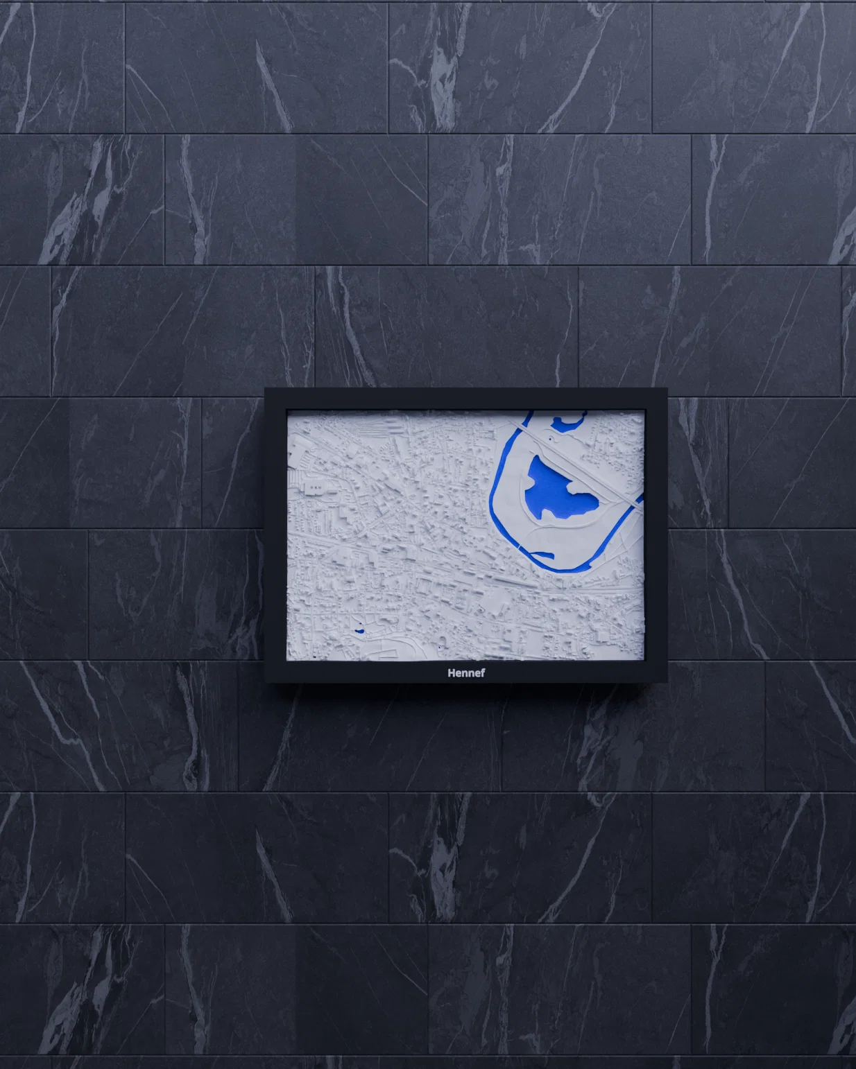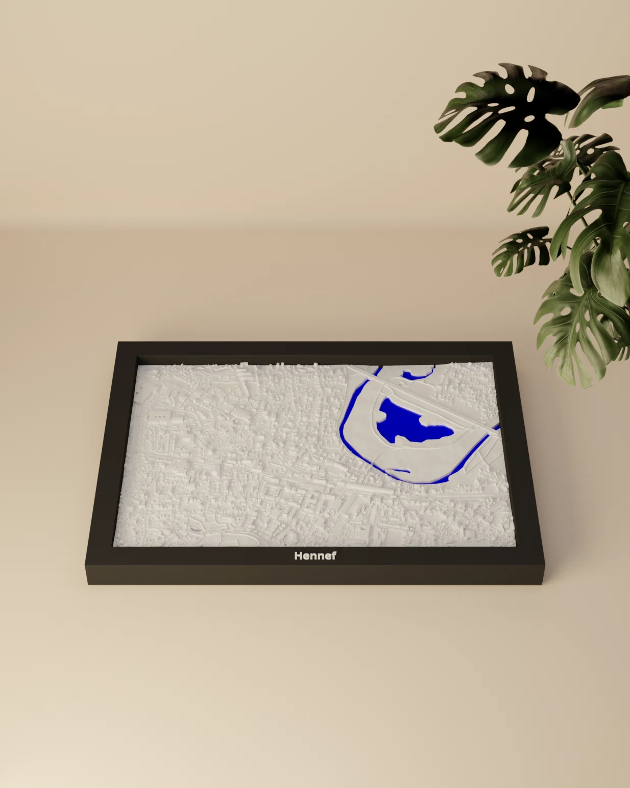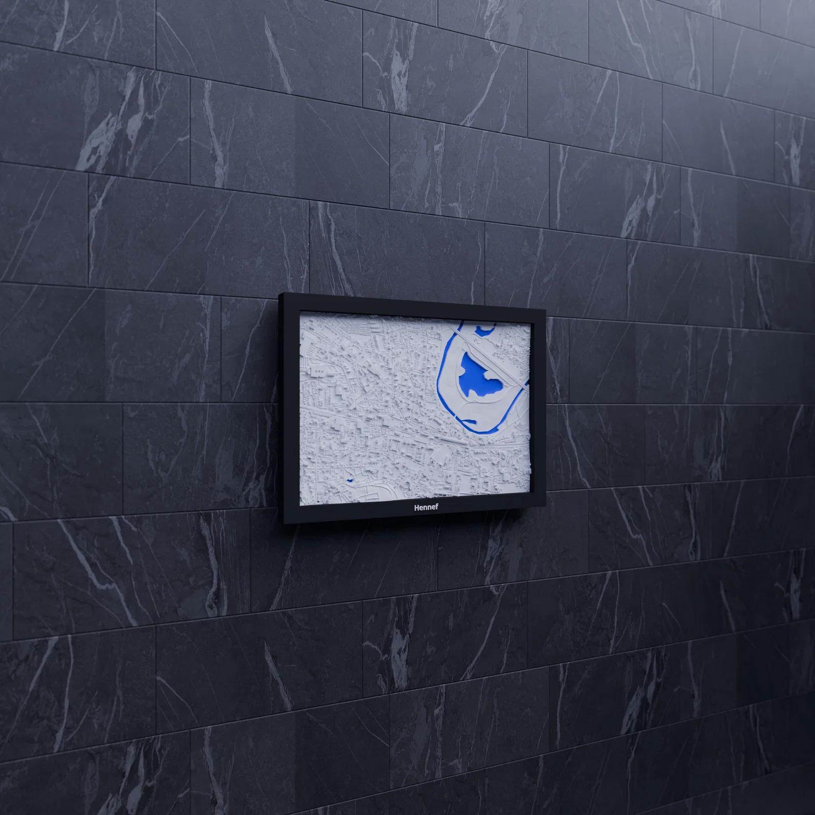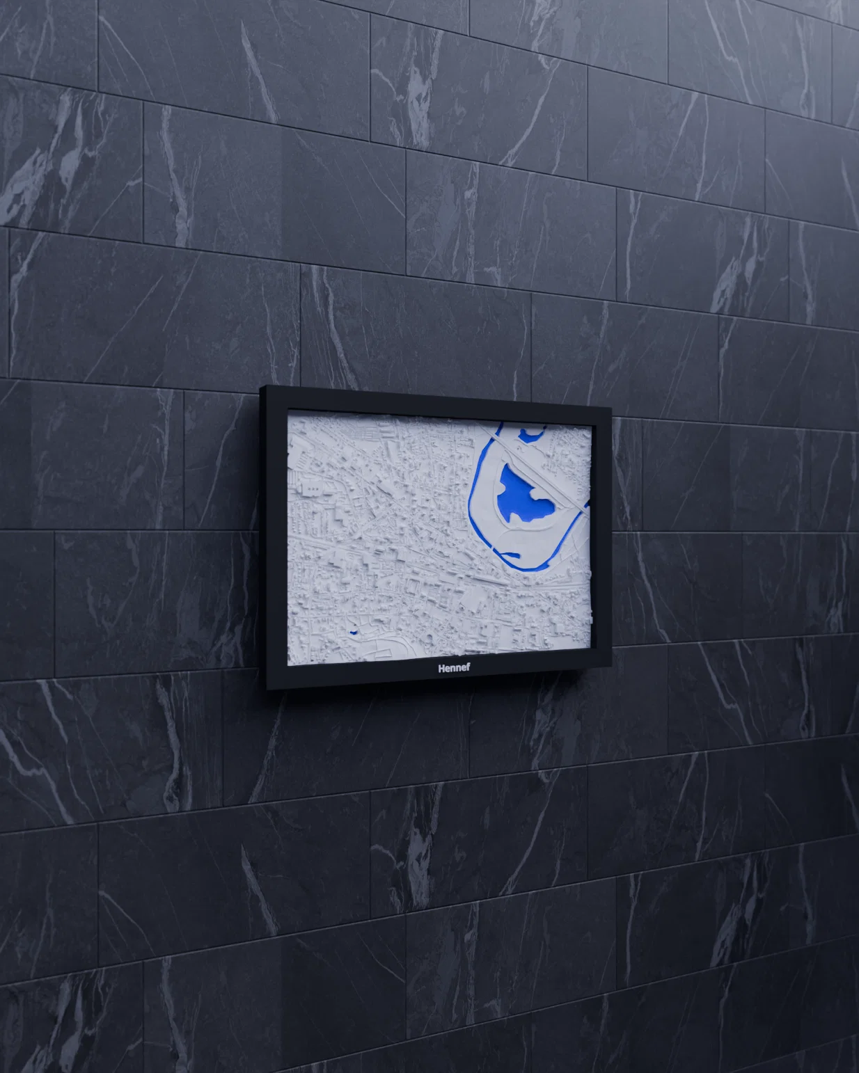 Mô hình địa hình thu nhỏ Hennef (Đức) dựa trên dữ liệu địa lý, thu nhỏ khu vực 2.050 km x 1.433 km xuống 170.5 x 119.5 mm. Có nhiều frame kèm lỗ treo, phù hợp in trang trí, học tập hoặc trực quan kiến trúc.