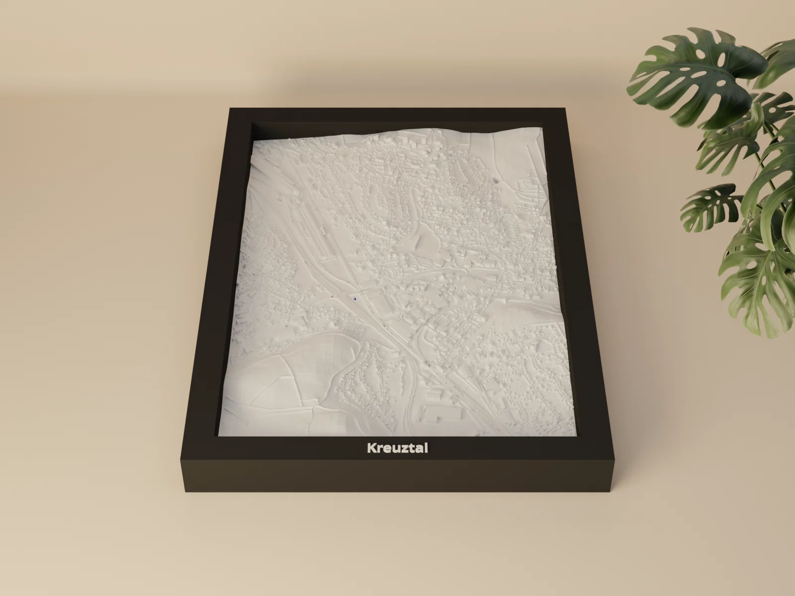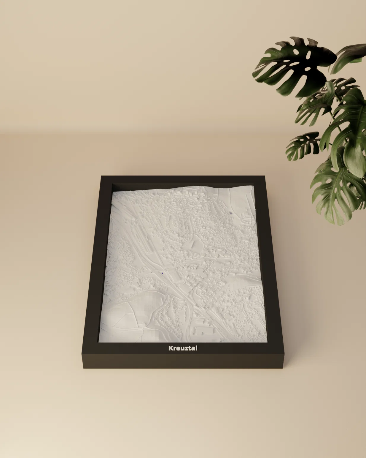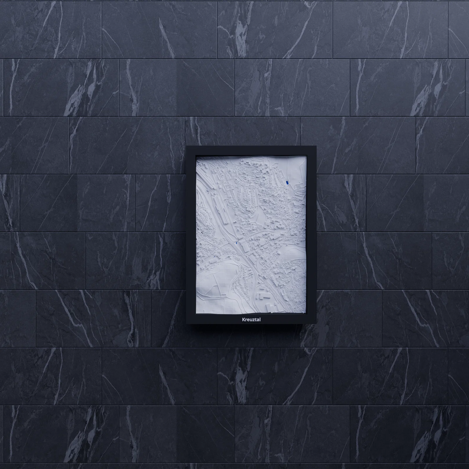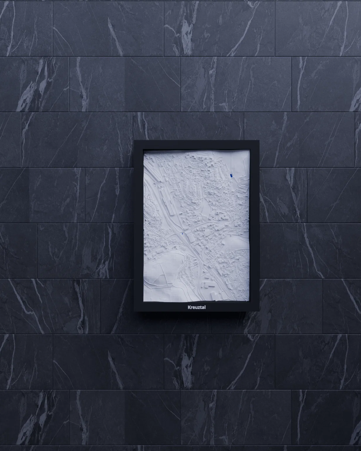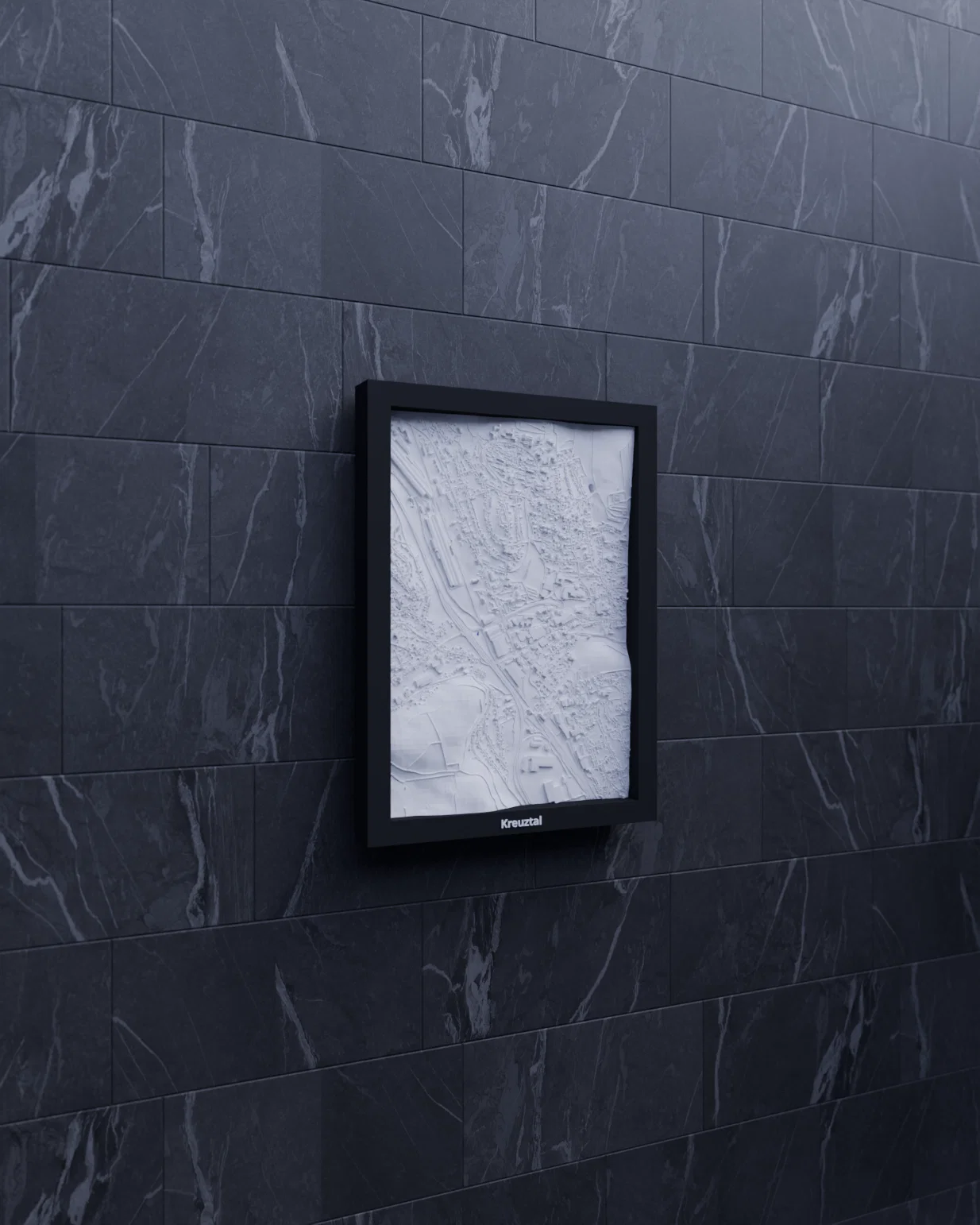 Bản thu nhỏ địa hình 3D của Kreuztal (Đức), dựng từ dữ liệu địa lý để tái hiện terrain chân thực. Khu vực 1.677 x 2.385 km được thu về 119.5 x 170.5 mm, kèm nhiều frame có lỗ treo.