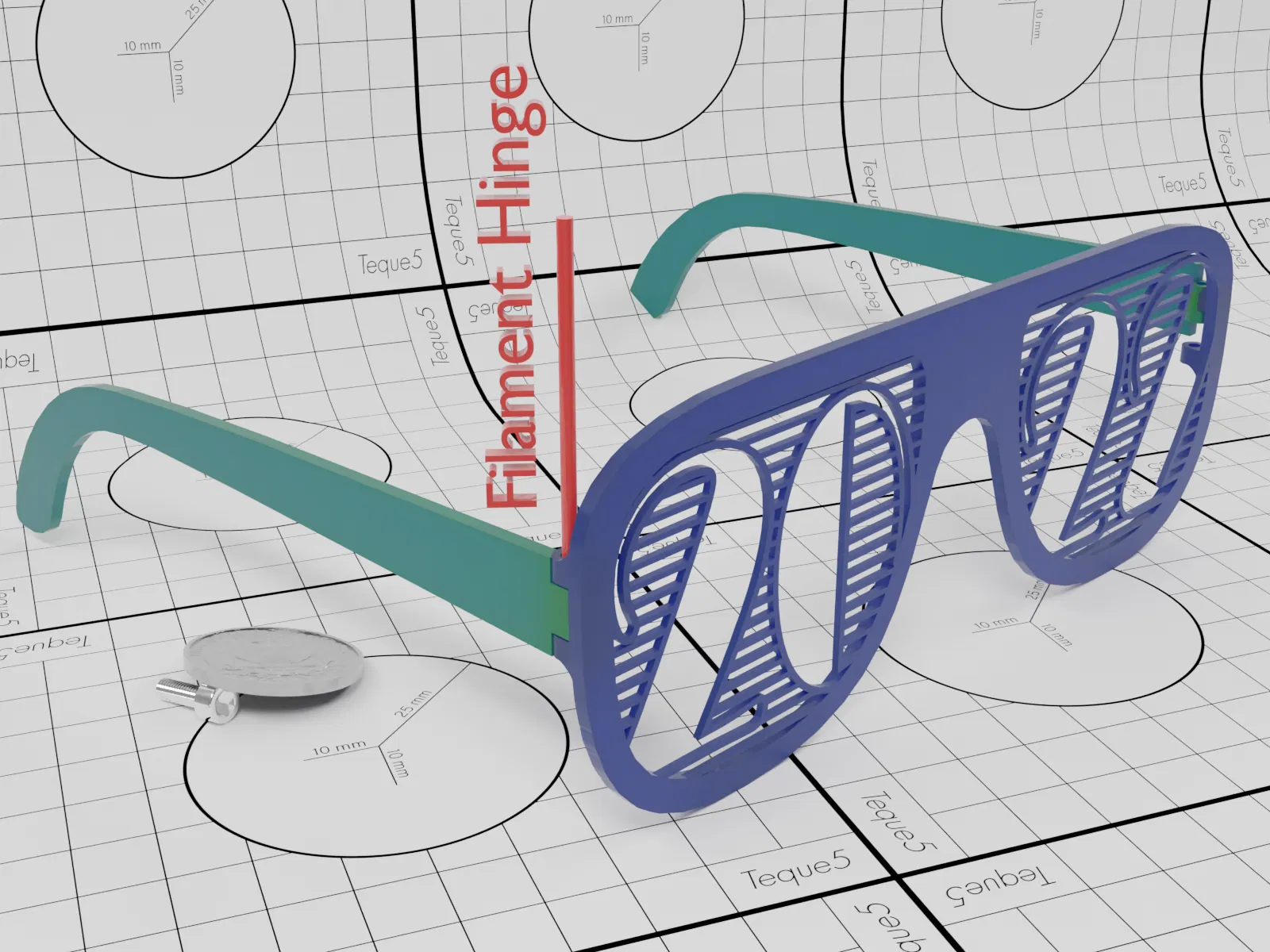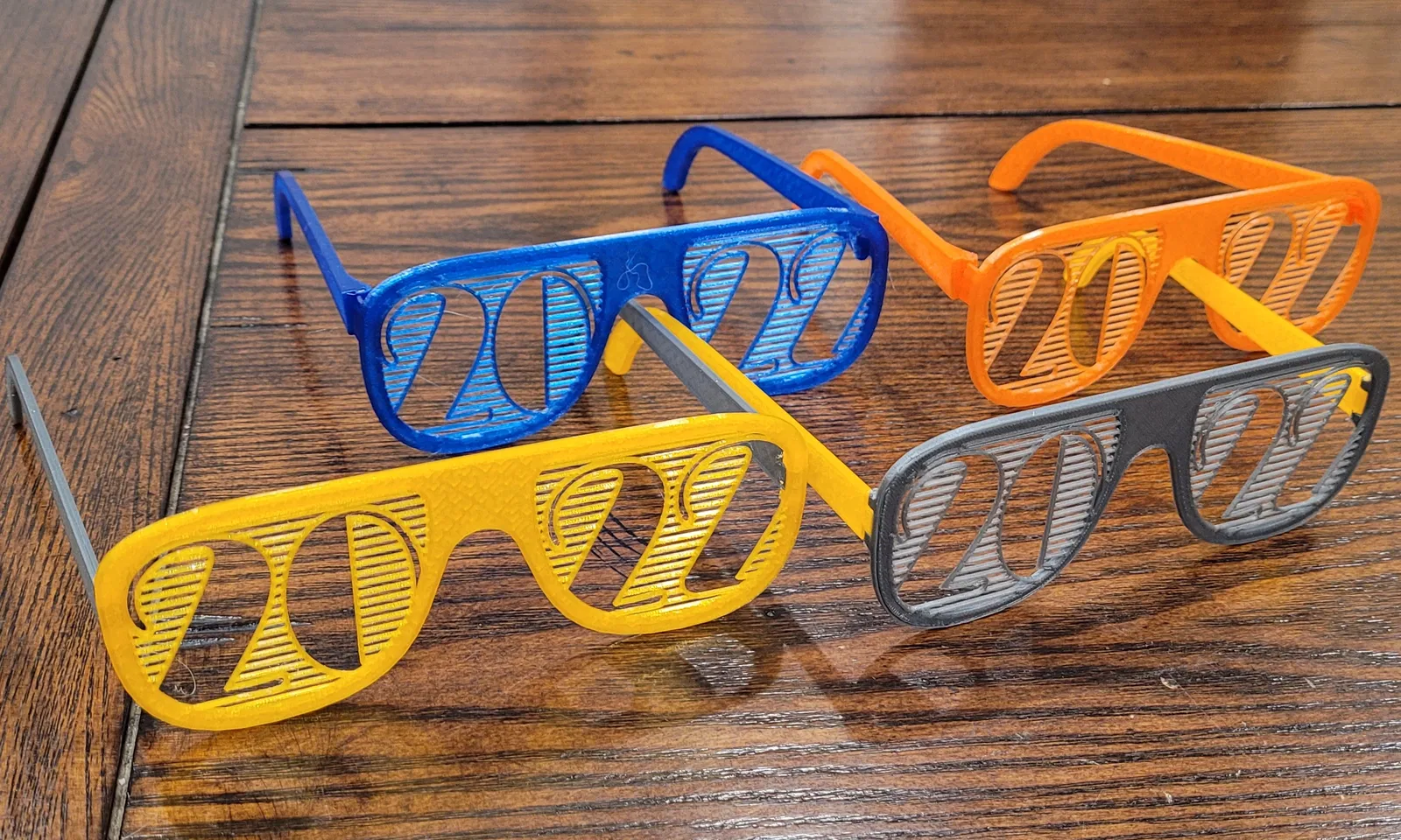 Mẫu kính in nhanh cho đêm giao thừa New Year's 2022, dùng chốt bản lề bằng filament 1.75 mm hơ nóng để cố định. Đã gia cố phần bản lề so với càng snap-fit dễ gãy; PLA dùng được, HTPLA/PETG sẽ bền hơn.