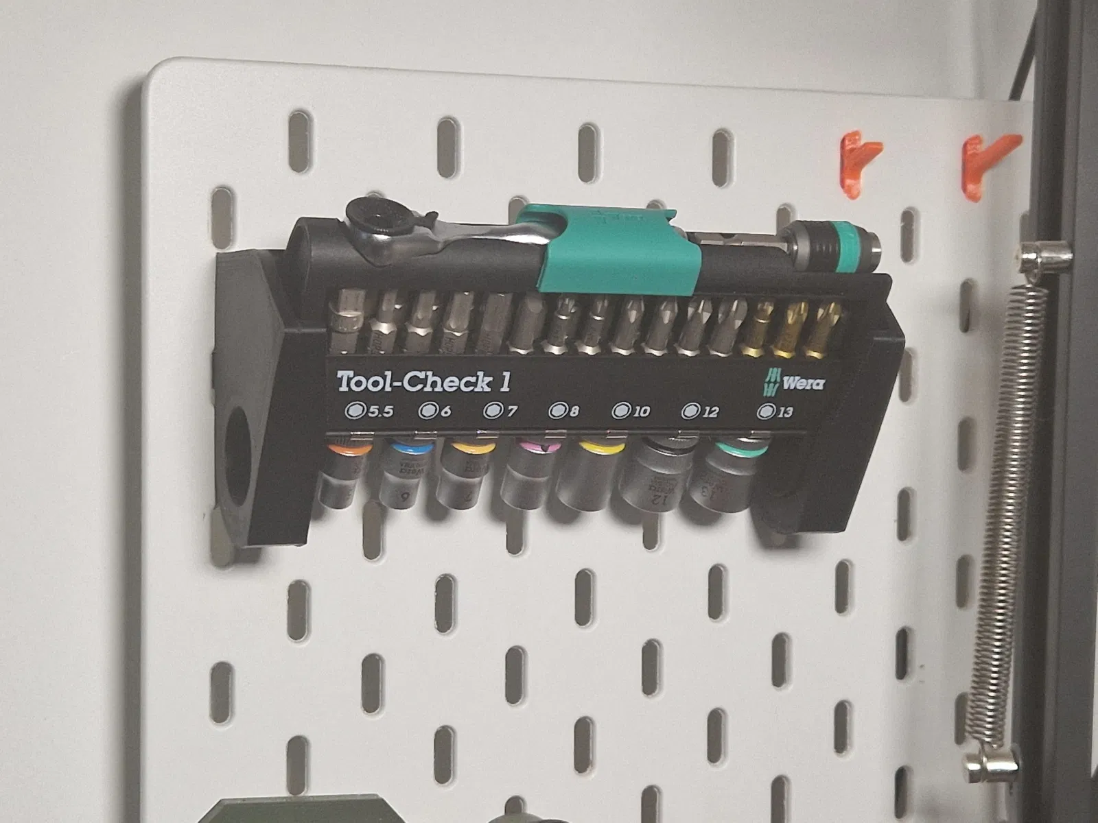Giá đỡ để gắn Wera Tool-Check 1 lên bảng Skadis (hoặc bề mặt tương tự), tương thích bản Tool-Check mới có khóa bên hông. Đã nới thêm 6mm và thu nhỏ phần in để tránh cấn bits. Không cần cài đặt in đặc biệt.