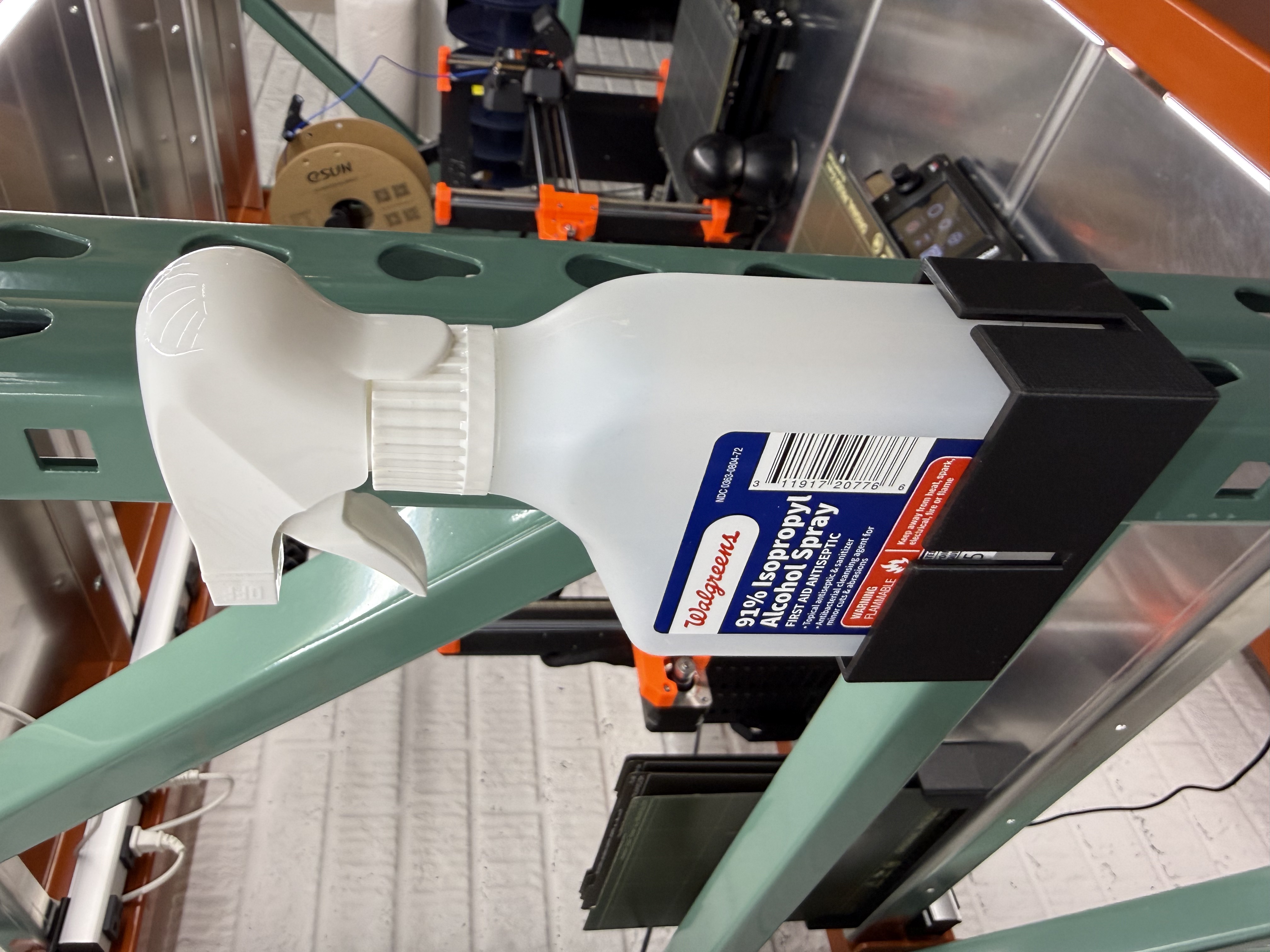 Giá giữ chai xịt nhỏ cho pallet racking kiểu Ridg-U-Rak Teardrop. Vừa chai IPA 39×84mm để vệ sinh build plate. Có tùy chọn gắn nam châm 5×4mm, kèm bản left/right theo vị trí lắp.