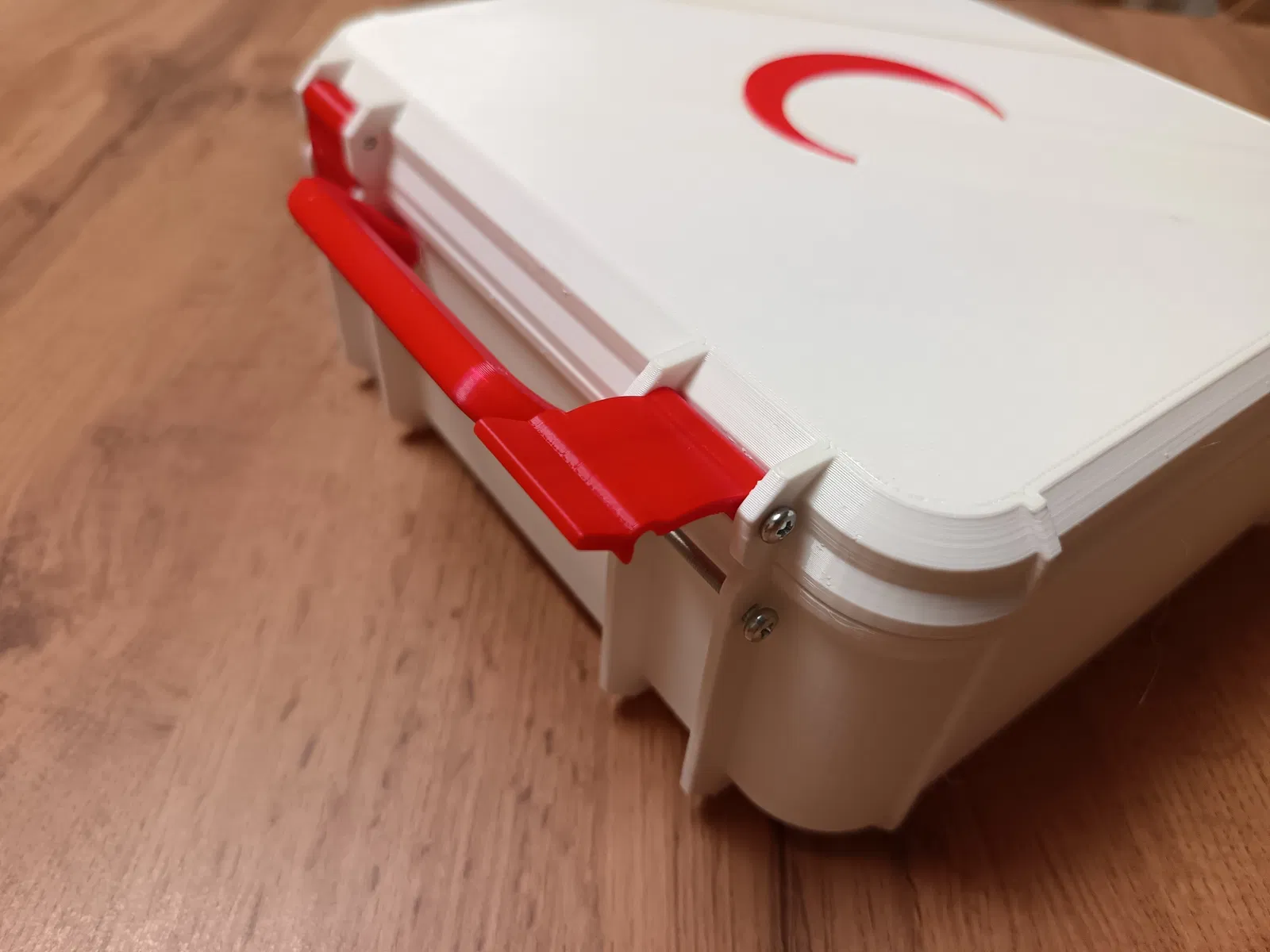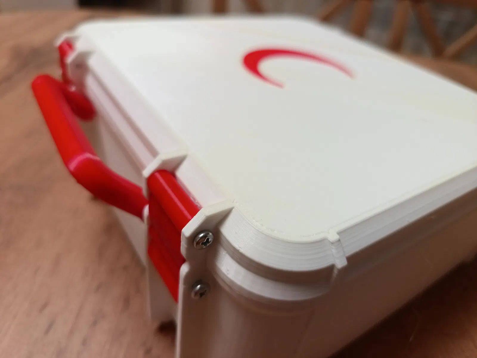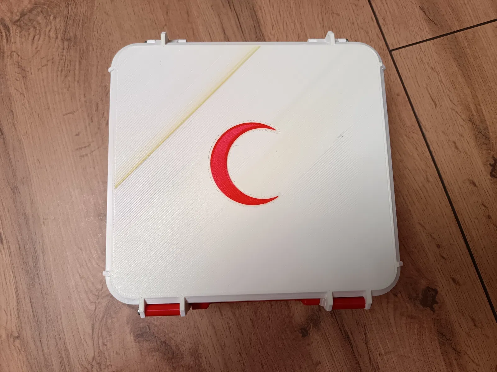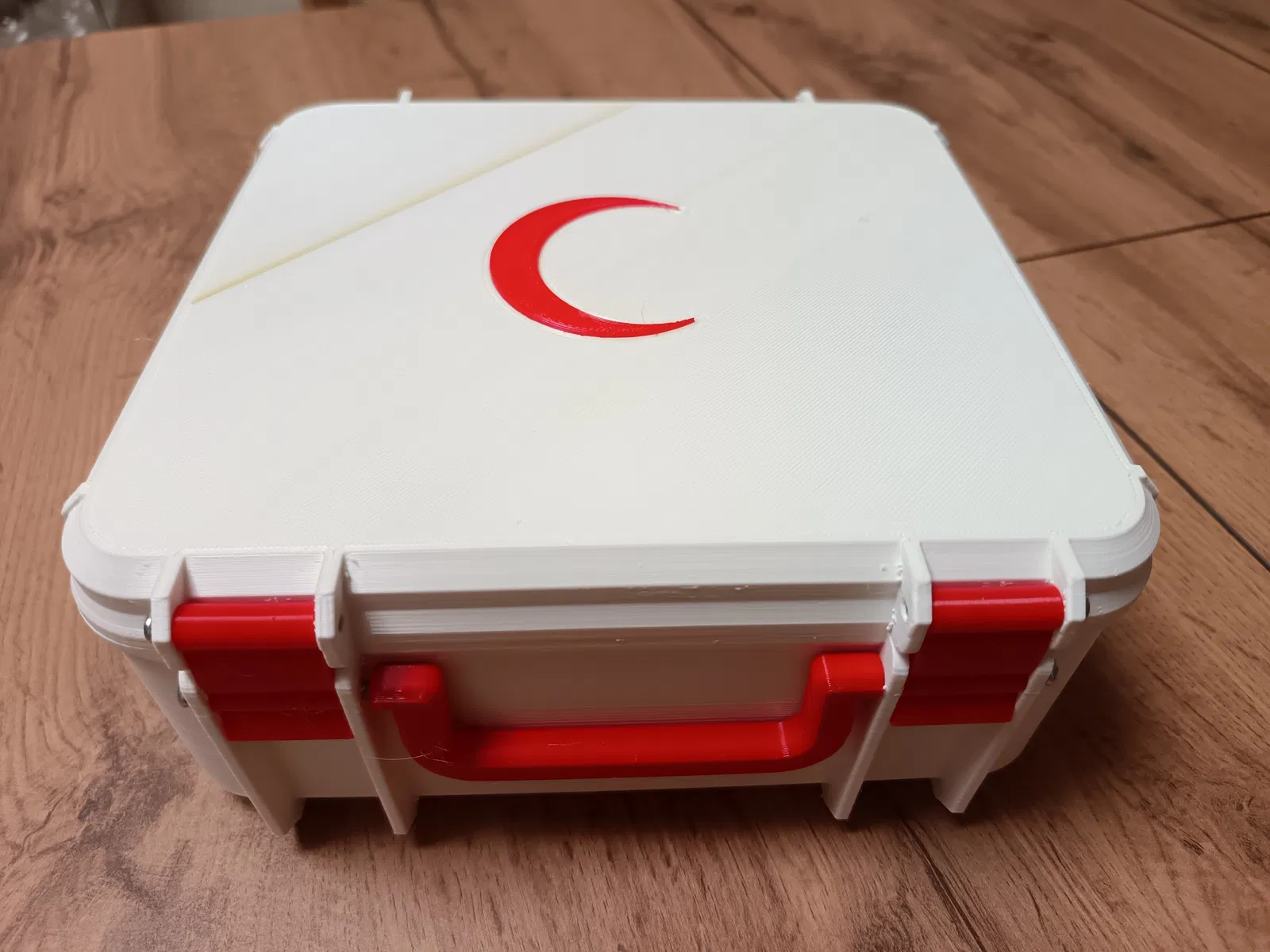Hộp/bộ sơ cứu dùng biểu tượng trăng lưỡi liềm thay cho dấu thập, kiểu thường gặp ở các quốc gia Hồi giáo. Các chi tiết thiết kế lắp khít không cần keo; có thể chỉnh “horizontal expansion” trong slicer nếu bị chật/lỏng.
