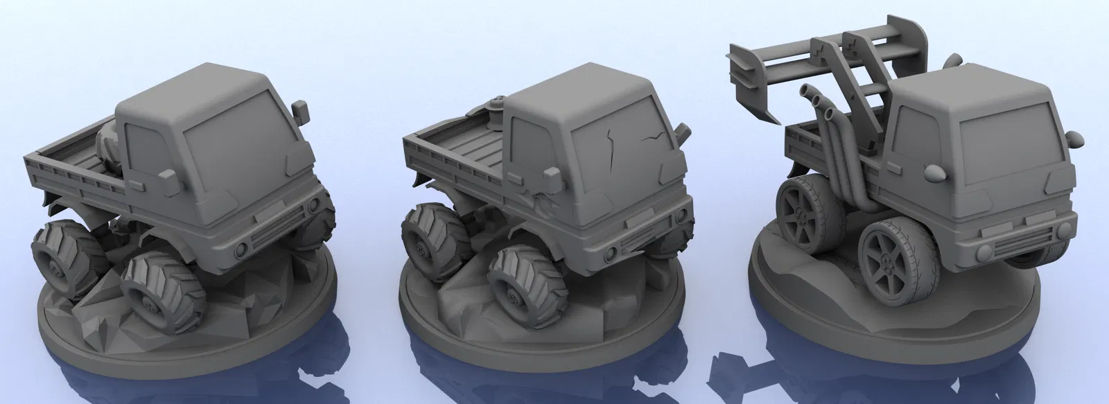 Bộ 3 biến thể Kei Truck cho contest game Crash Derby: Off-road, Off-road Damaged và Turbo. Model tách nhiều mảnh để in, cần dán keo (không dùng snap join). Có kèm mesh hoàn chỉnh để xem nhanh.