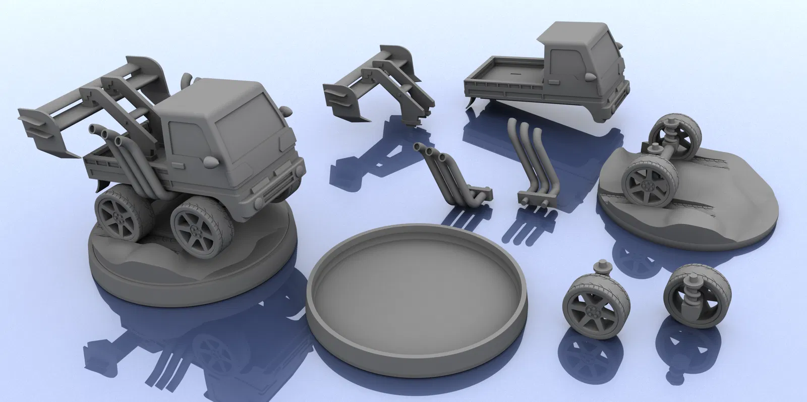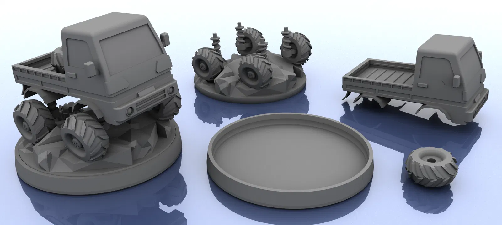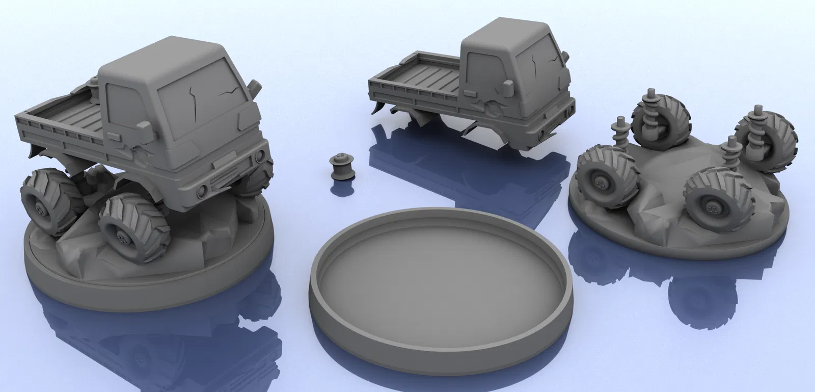 Đế tiêu chuẩn. Phần dưới (bánh xe và đất bám). Phần trên (chassis). Có bánh dự phòng như một chi tiết tuỳ chọn gắn phía sau.