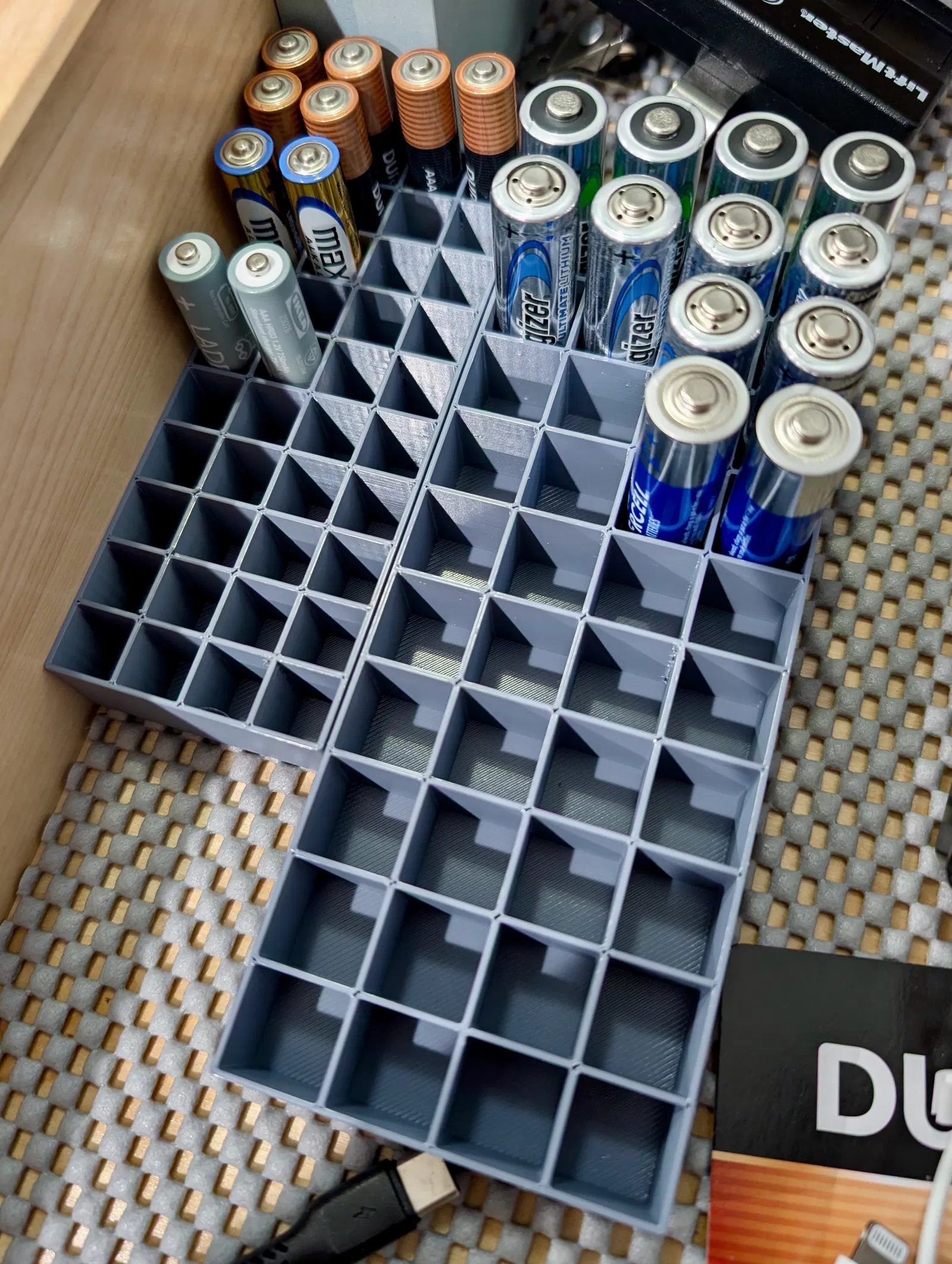 Mình cần vài cái khay/giá sắp xếp pin thật đơn giản để bỏ trong ngăn kéo bếp, nên mình làm mấy cái này. Đây là hai khay 4x10 (40 ô) với vách dày 1mm cho pin AA và AAA ở định dạng .stl, kèm theo file dự án Fusion .f3d và một file OpenSCAD để bạn tự generate theo ý.