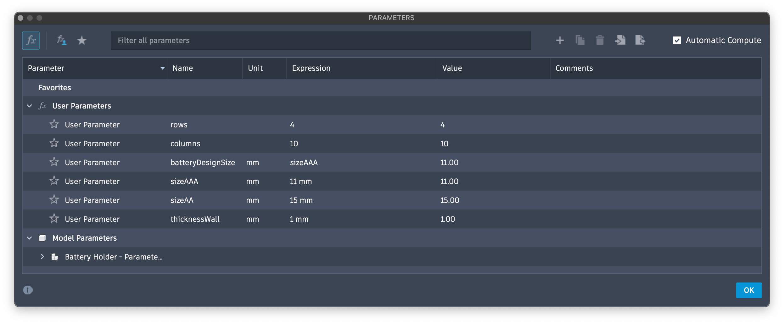 Giá đỡ pin đơn giản (AA & AAA) kèm Fusion tham số hóa và file OpenSCAD