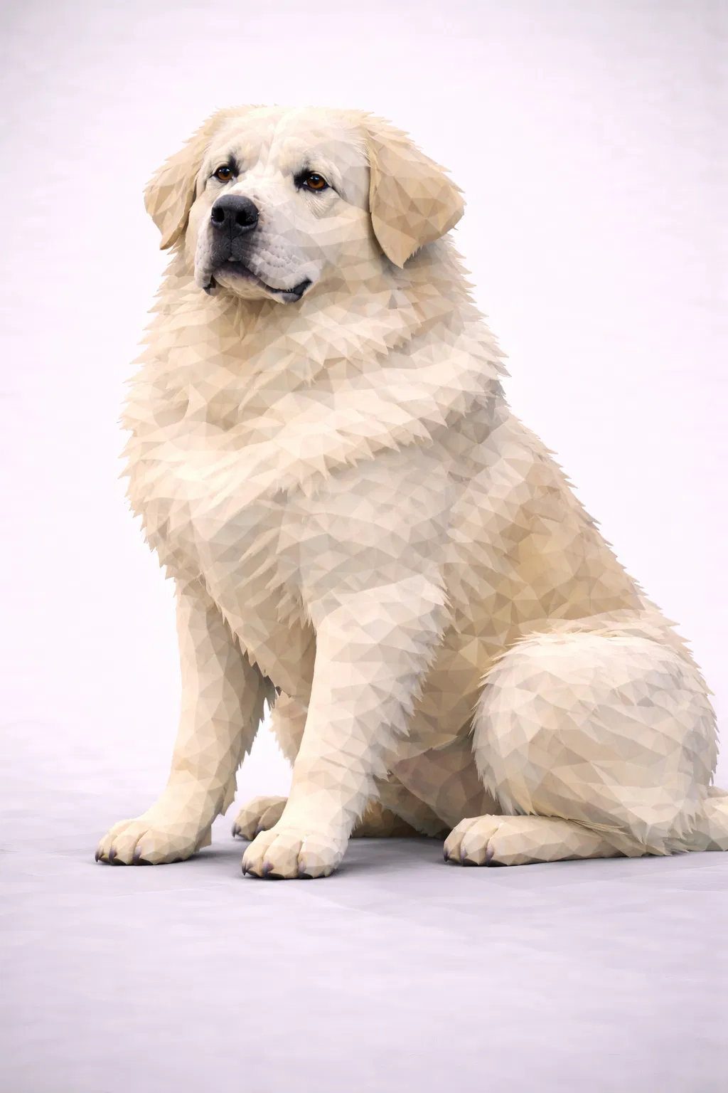 Mẫu 3D Chó Núi Pyrenees (Pyrenean Mountain Dog) theo phong cách Low Poly, phù hợp để in 3D làm mô hình trang trí. Thiết kế gọn, đường khối rõ ràng, dễ trưng bày.