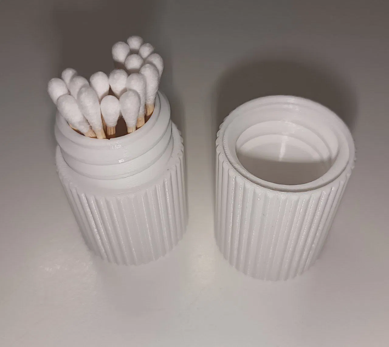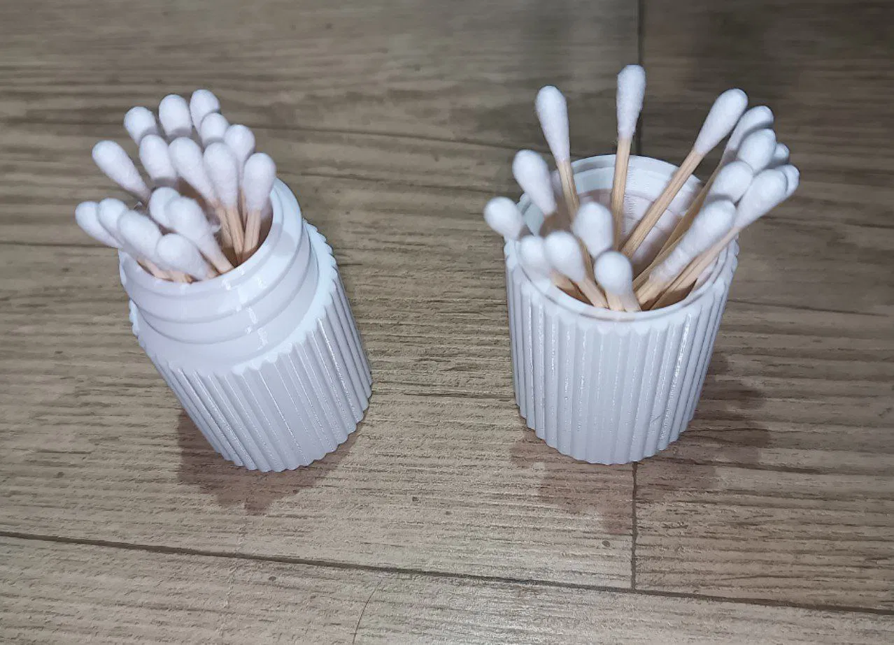 Hộp đựng Q-Tip TwistTop (vít trung tâm) đơn giản, gọn nhẹ, chứa khoảng 12–16 cây. Mỗi nửa hộp có thể dùng độc lập khi đang lấy Q-Tip, phù hợp để trong phòng tắm hoặc góc làm việc.