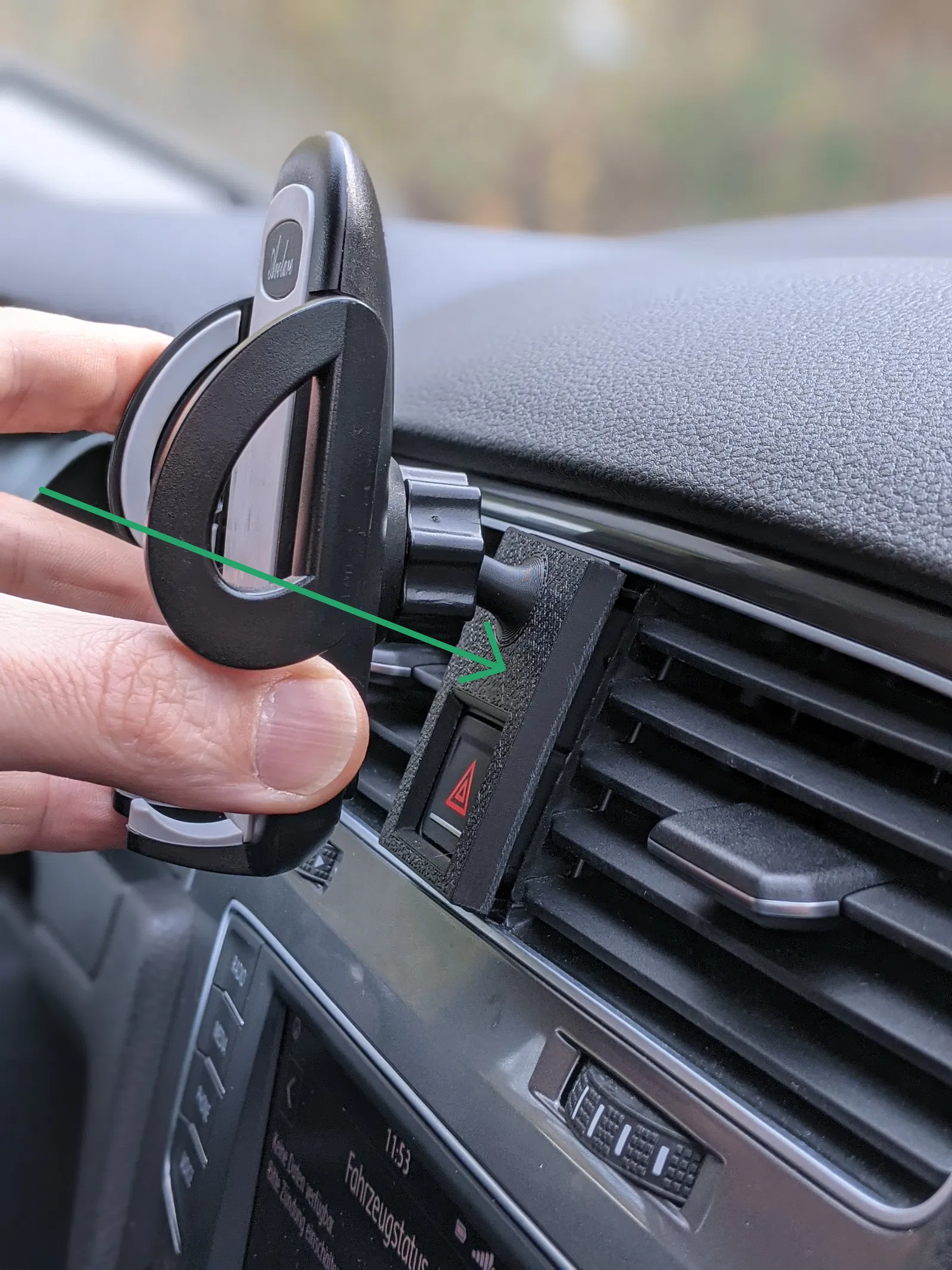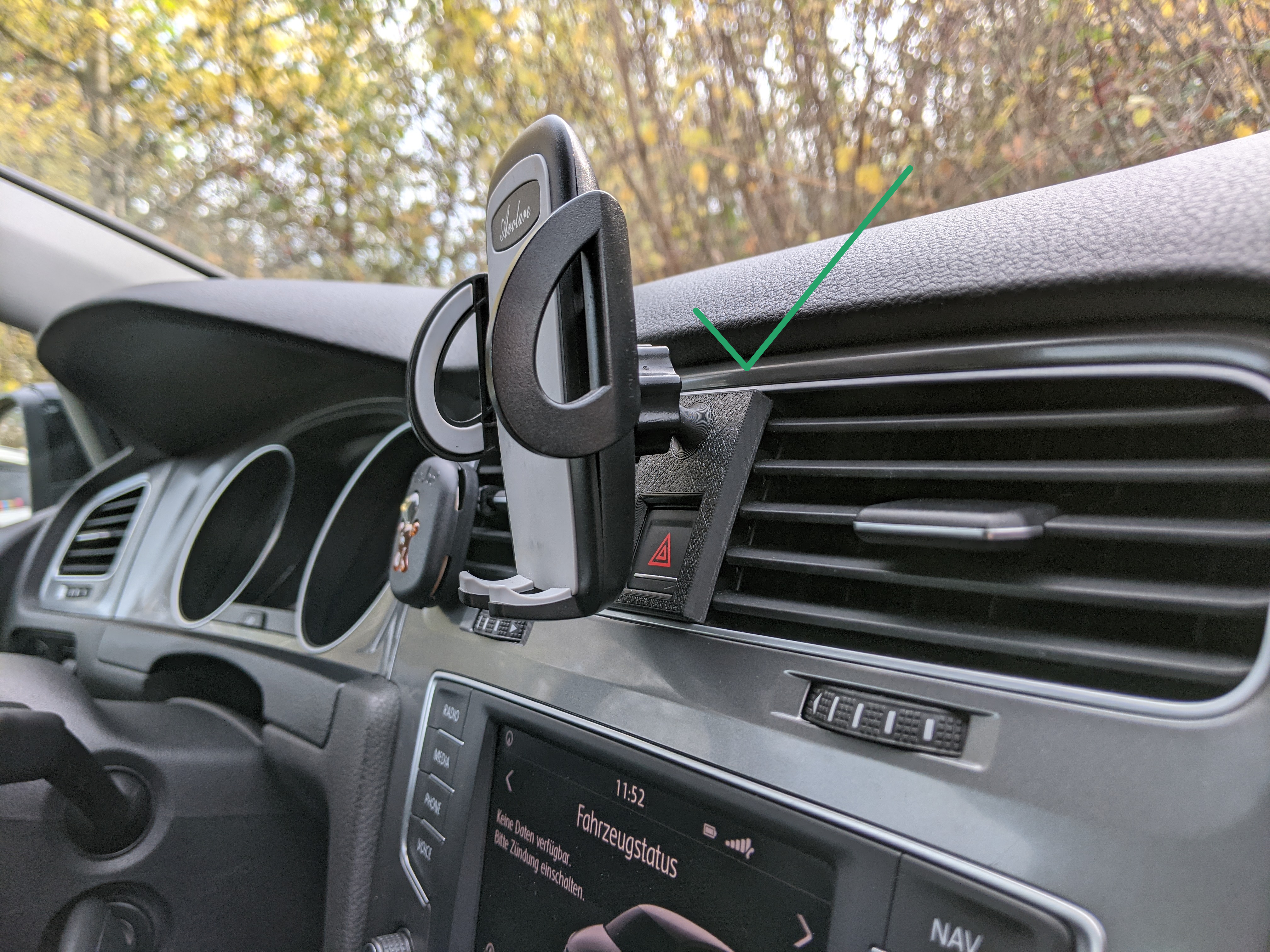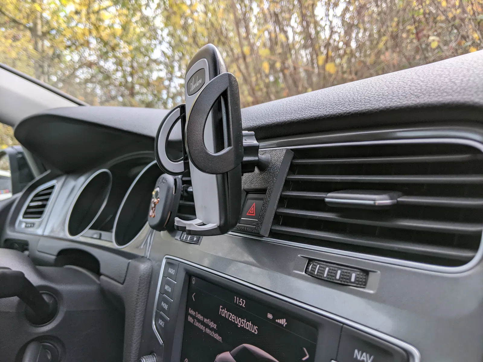 Adapter gắn kẹp điện thoại cho Volkswagen Golf MK7, lắp vào vị trí công tắc hazard. Có 2 bản: V4 ball joint thẳng và V5 ball joint nghiêng, đường kính ball joint 16,5mm. Khuyến nghị in PETG khi trời nóng.