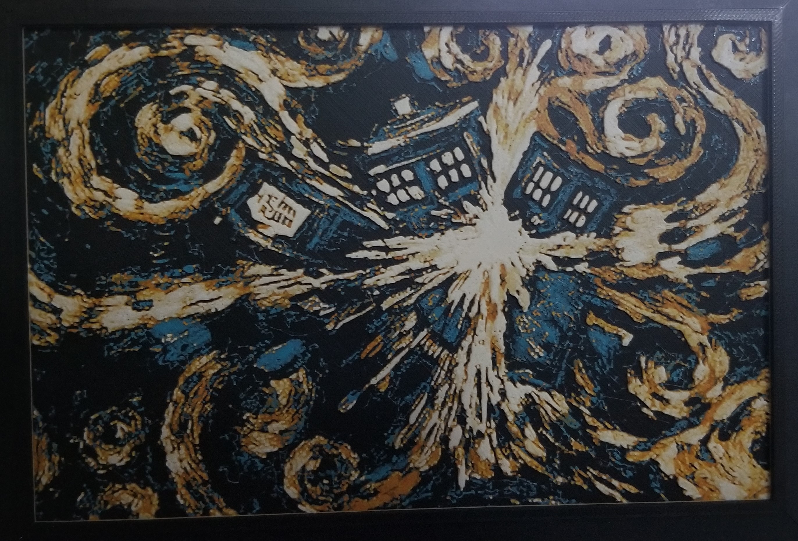 Mẫu Hueforge “Doctor Who Starry Night” (200x133.4mm) với hướng dẫn in 100% infill, layer height 0.08mm và thông tin độ dày. Kèm danh sách 5 loại PLA/PLA+ và lịch swap màu theo từng layer.