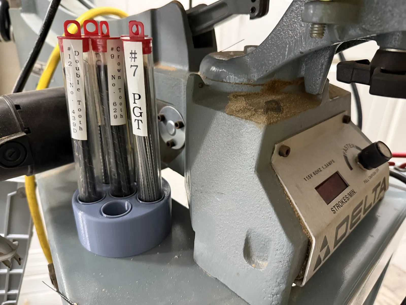 Mẫu này dùng để cất giữ nhiều ống đựng lưỡi cưa lọng (scroll saw blades). Bản thiết kế mình dùng có 3 phần, phù hợp với các ống đựng lưỡi cưa lọng mình đang xài: một đế nam châm, một phần holder thả vào đế, và các ống lót (sleeves) để giảm đường kính các hốc trên holder, giúp kẹp chặt các ống đựng lưỡi cưa lọng hơn.