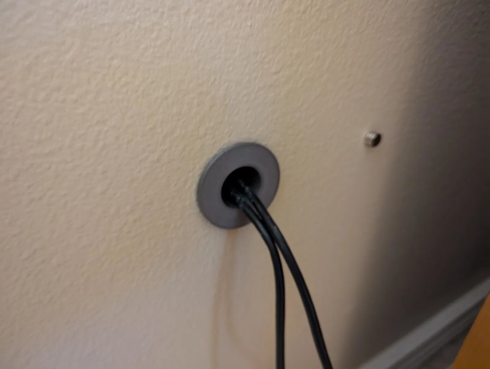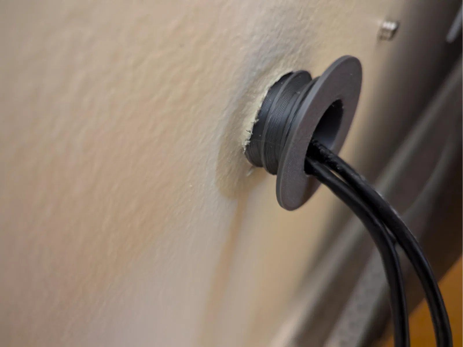Đây chỉ là một món passthrough đơn giản để luồn cáp xuyên qua vách thạch cao (sheetrock). Chỉ cần khoan một lỗ hơi nhỏ hơn kích thước cần thiết, rồi vặn ren vào là xong.