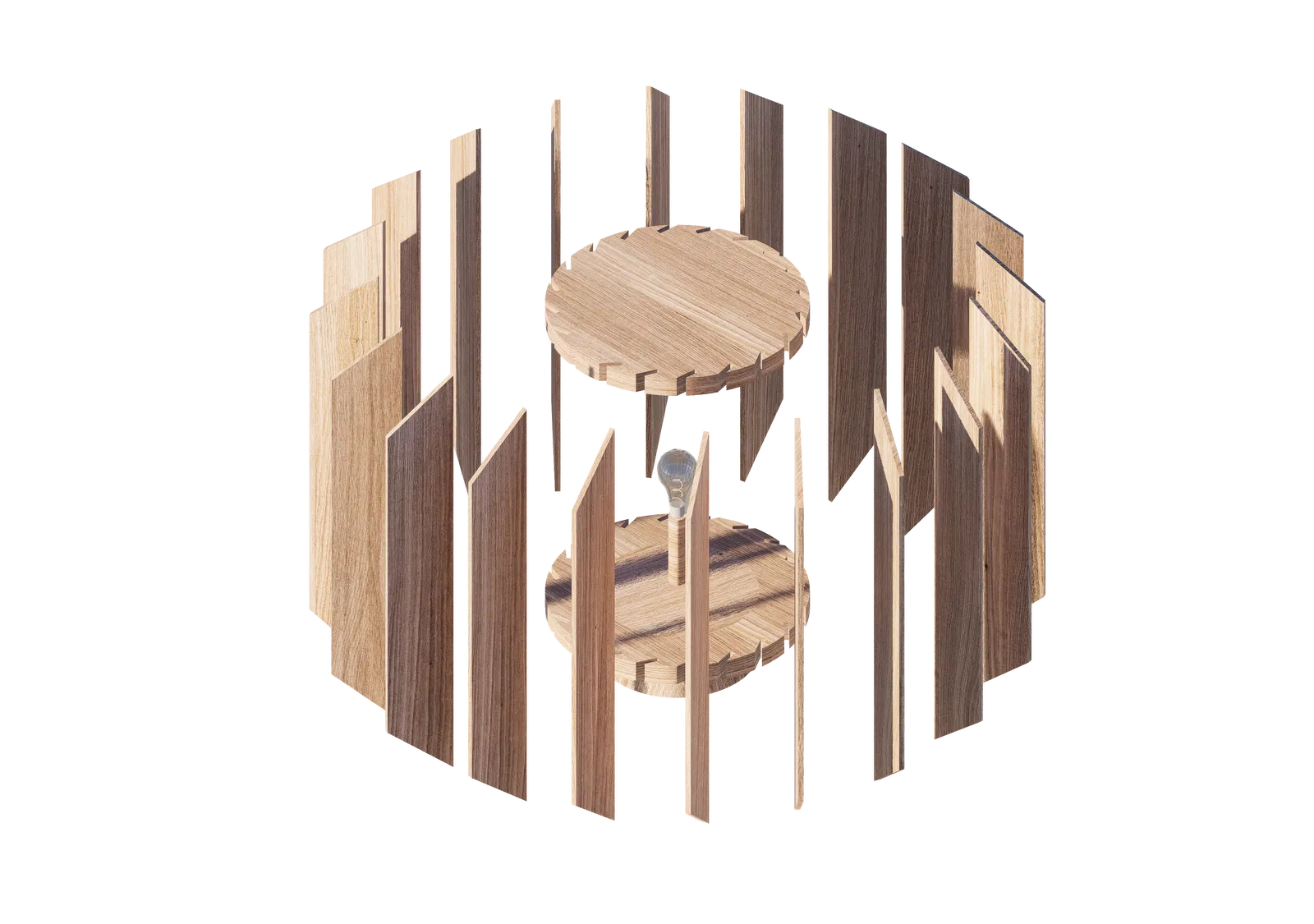Đèn này (chính xác hơn là chụp đèn) được cấu tạo từ 3 bộ phận đơn giản khác nhau, trượt vào nhau rất dễ dàng. Mục tiêu của thiết kế này là tạo ra một vật thể tĩnh nhưng cho cảm giác như đang chuyển động. Góc nghiêng của các “fin” được chọn có chủ đích để bóng đèn ở giữa không thể nhìn thấy từ bên ngoài, khiến người dùng bắt đầu đi vòng quanh đèn để tìm nguồn sáng, từ đó làm lộ rõ cảm giác chuyển động. 20 fin bao quanh bóng đèn tạo ra những mảng bóng đổ tinh tế mà đẹp mắt khắp căn phòng, trong khi ánh sáng của đèn mang lại cảm giác ấm áp cho khu vực xung quanh. Đèn được thiết kế để lắp vừa với một đế đèn giá mềm có thể mua trên Amazon (xem bên dưới). Mình có đính kèm hình ảnh chiếc đèn kích thước đầy đủ làm từ các miếng gỗ cắt CNC, cũng như một hình ảnh phiên bản in 3D.