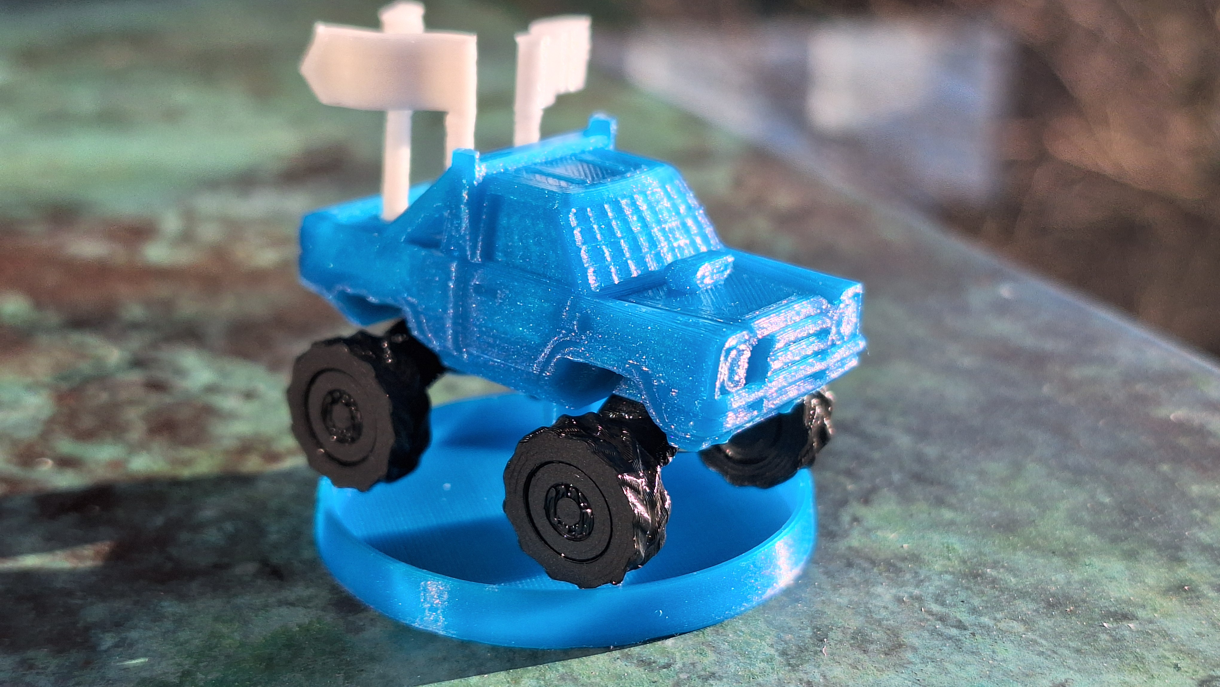 Bánh là dạng print in place và có thể xoay. Mình phải kẹp trục (axle) bằng kìm rồi dùng hai ngón tay xoay bánh, cần dùng lực kha khá mới làm nó quay trơn được. Có thể in phần rims (vành) khác màu để nhìn hiệu ứng hơn.