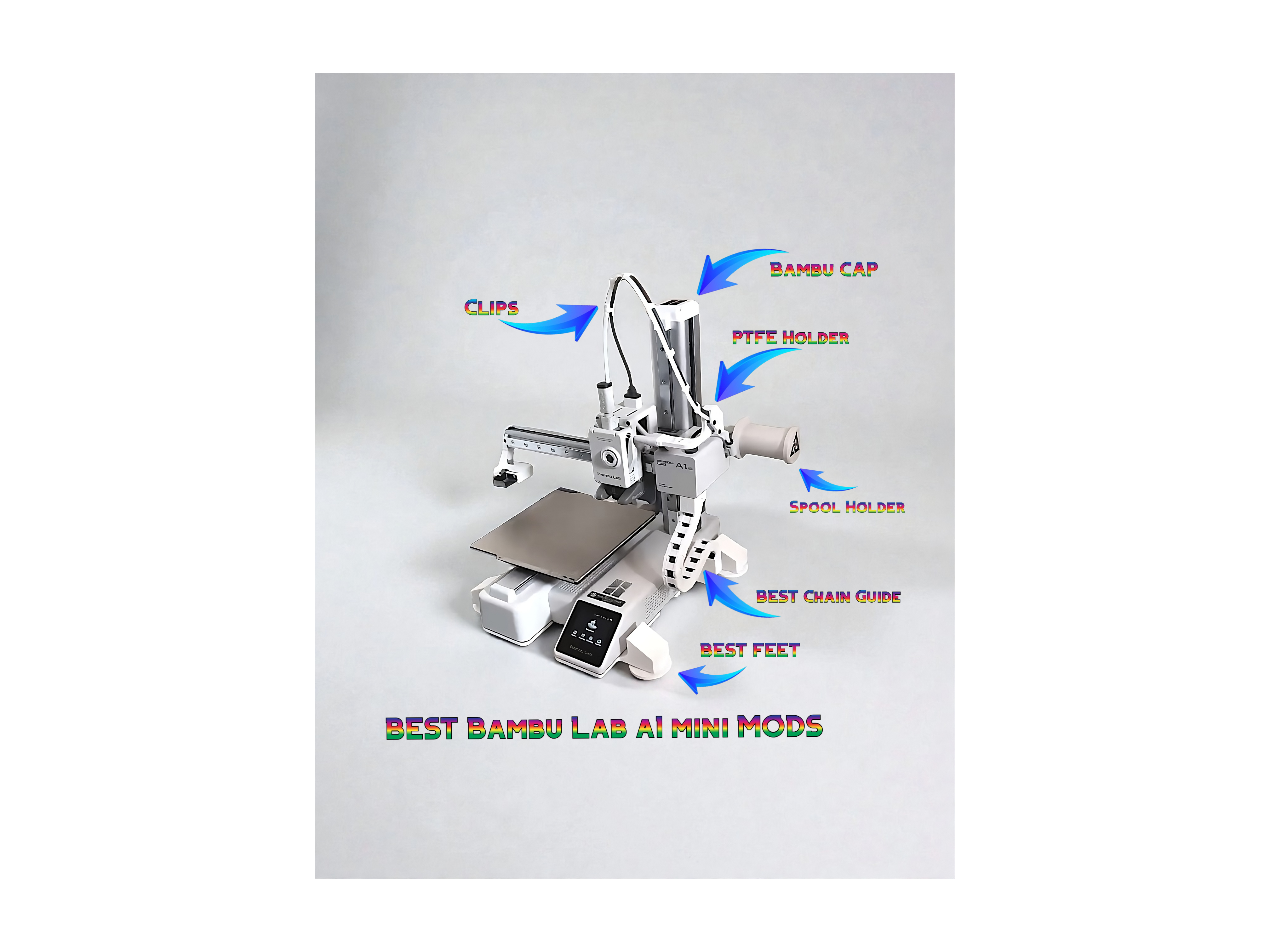 Bộ Best MODS cho Bambu Lab A1 mini gồm Bambu Cap, PTFE Holder, Spool Holder, Cable/Chain Guide, Best Feet và clips. Giúp in đẹp hơn, giảm rung, cấp filament ổn định và đi dây gọn. In được PLA hoặc PETG-GF.