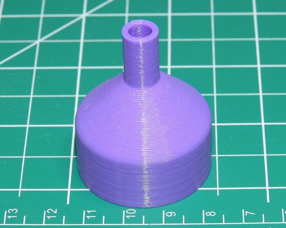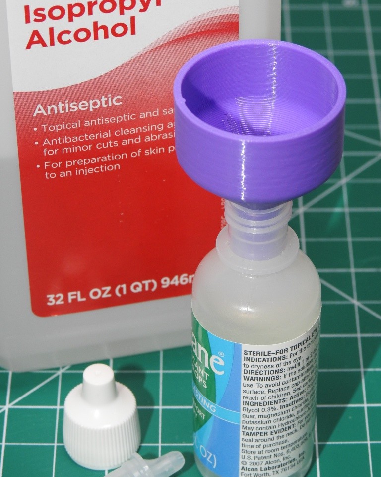 Phễu nhỏ dùng để rót một lượng cồn từ chai lớn sang chai bóp nhỏ để vệ sinh bed. Thiết kế để đặt/cất ngay trên miệng chai cồn, đầu nhỏ ôm khít. Model parametric trong Fusion 360, in nhanh, không cần support.