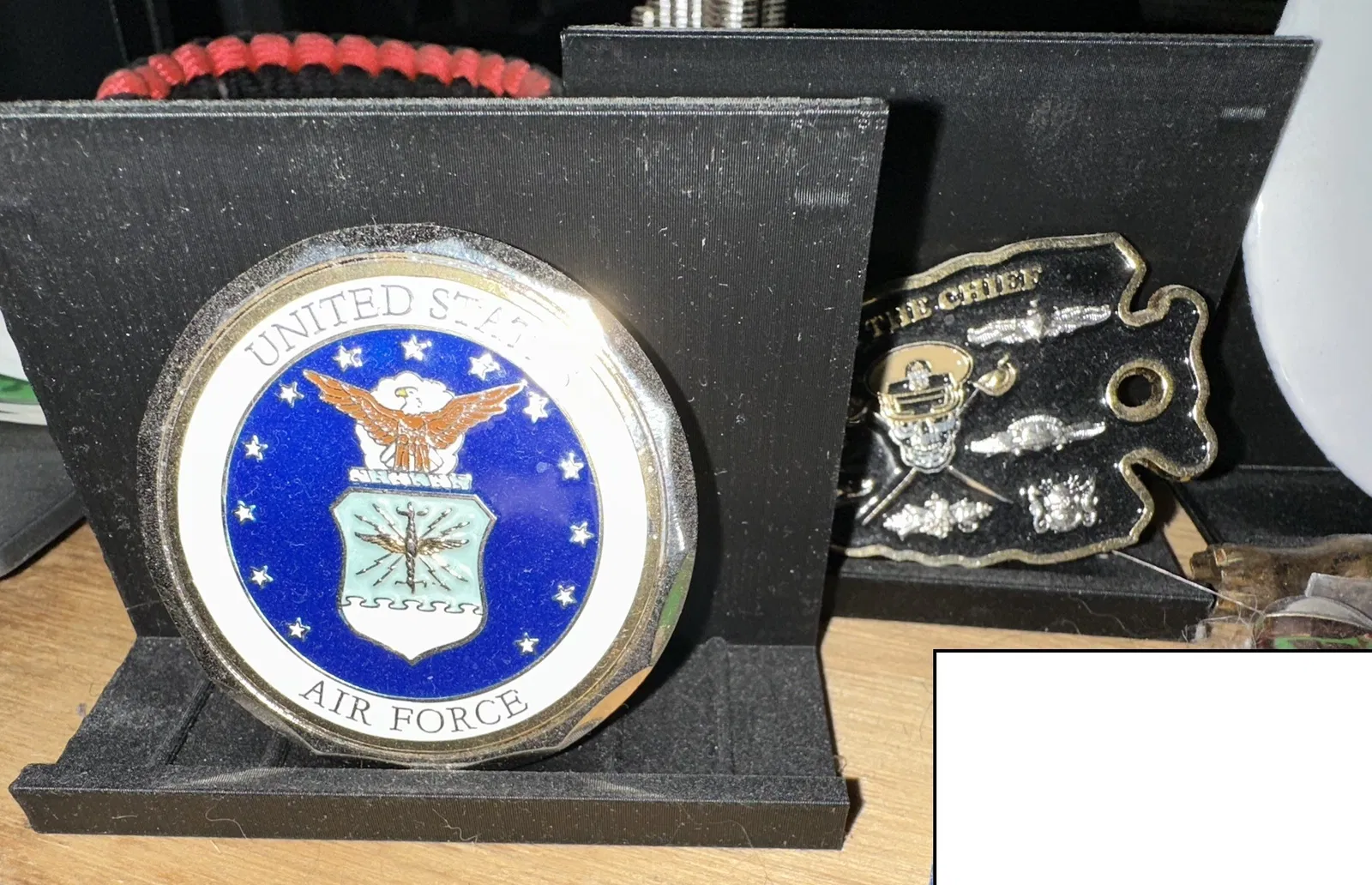 Kệ trưng bày modular cho challenge coin. Các chốt liên kết (interlocking pins) giúp ghép nhiều kệ lại với nhau từ phía sau và bên trong khay đáy. Bạn có thể muốn dán keo để cố định. Các gờ trong khay giúp giữ đồng coin đúng góc trưng bày như bạn mong muốn.