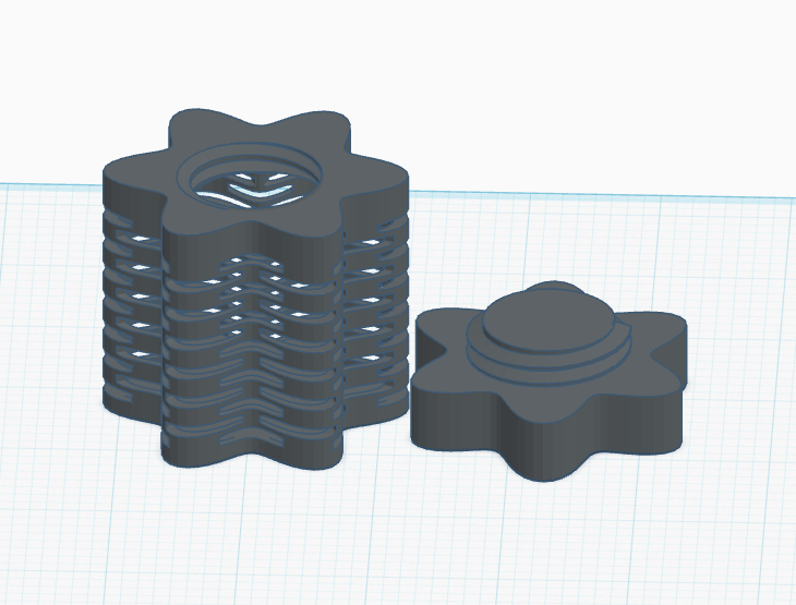 Một hộp đựng desiccant đơn giản với nắp vặn. Mình không tìm được mẫu desiccant holder nào trên đây thật sự hợp với nhu cầu của mình nên tự làm luôn. Model này rất cứng cáp nên không bị bung vỡ khi bạn di chuyển một thùng đầy cuộn spool, và kiểu dáng hình bông hoa giúp tăng diện tích bề mặt hơn so với một hũ tròn đơn giản.