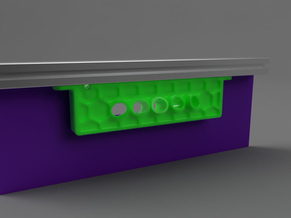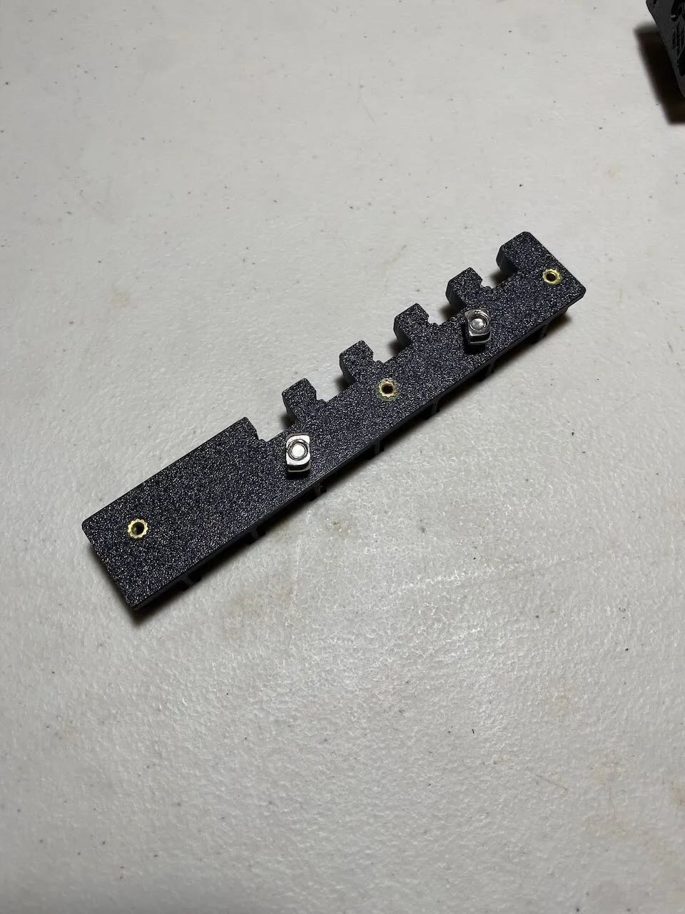 5 đường line dùng ECAS fittings; lỗ passthrough cho cáp 6.3mm; ngàm giữ piano wire 2.1mm (sâu 15–17mm); đồng thời thêm locating pins cho 2020 extrusion ở base module để dùng “sướng” hơn; tránh tình trạng T-nuts bị trượt dưới phần top.