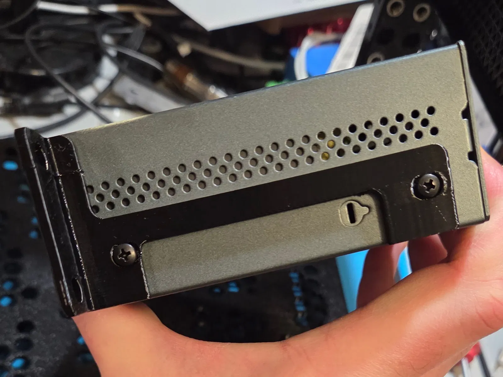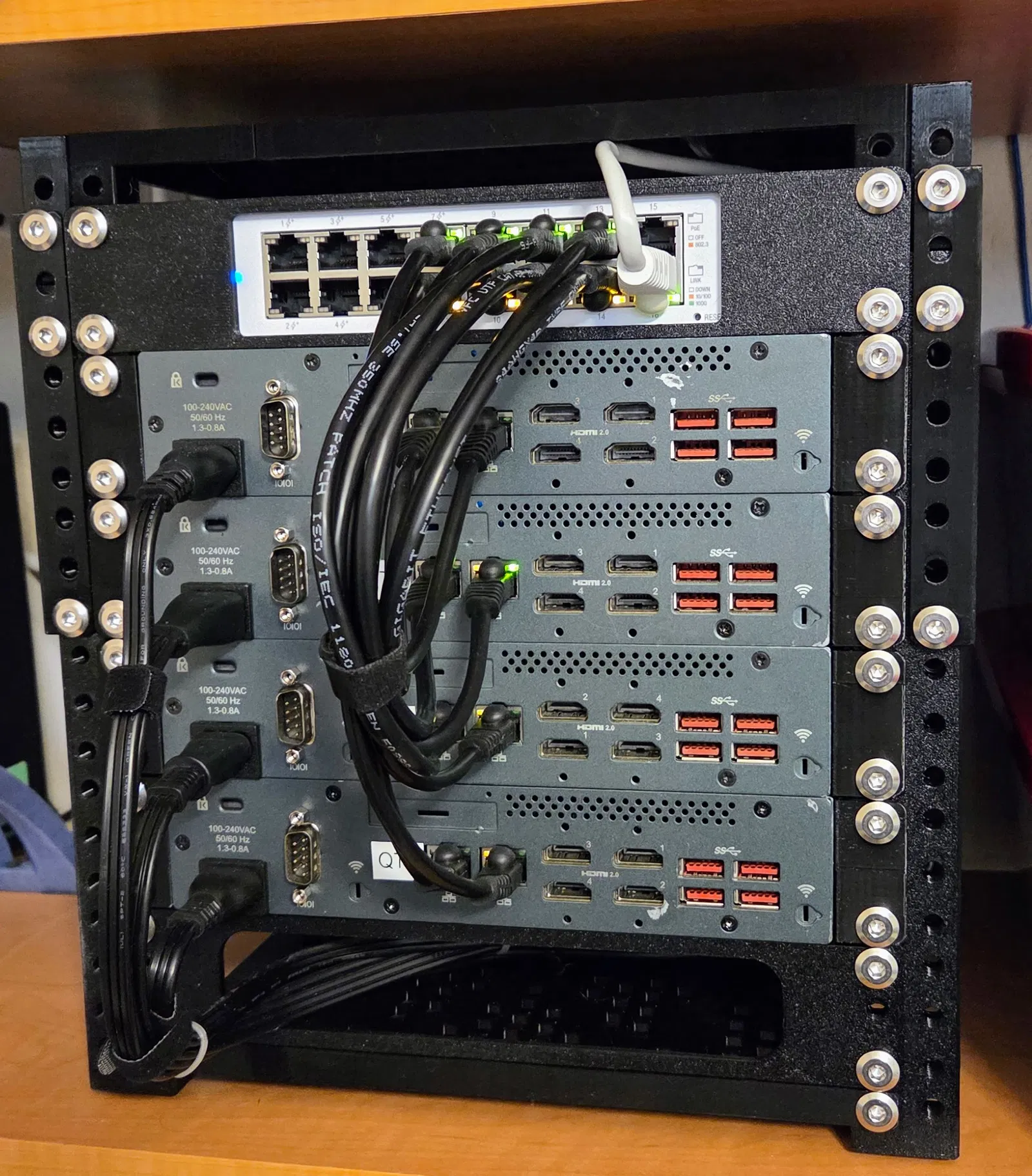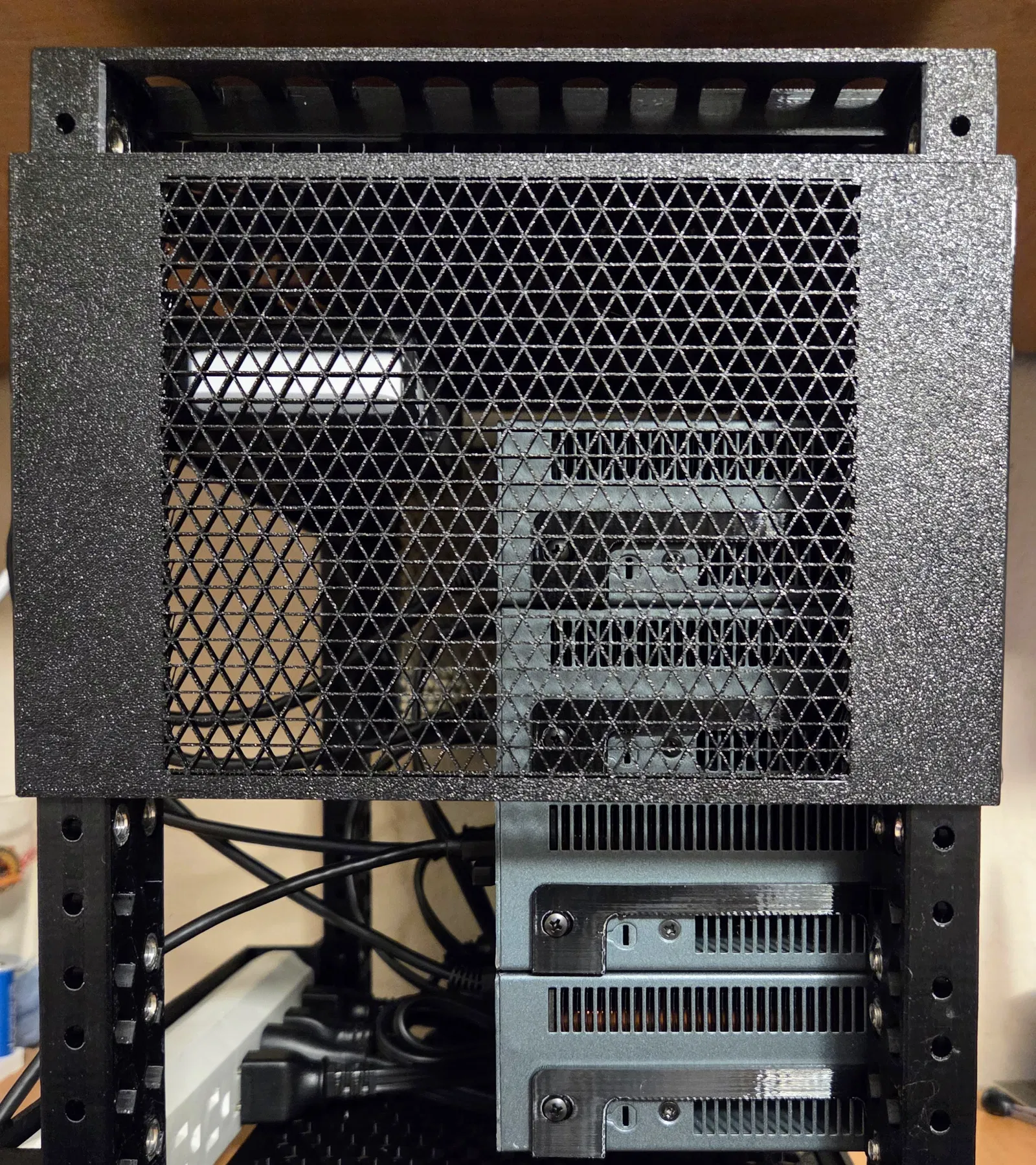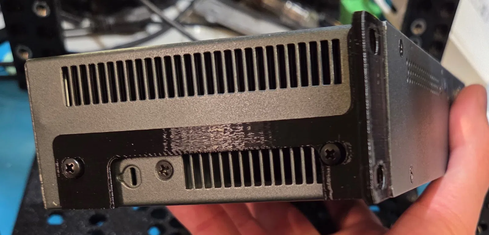 Dùng 4 con ốc M3x6mm đầu tròn (pan head) để bắt. Trong đa số rack, đây là fit khá sát nên ốc đầu trụ (cap head) có thể không vừa. Đừng dùng ốc dài hơn 6mm vì phần dài hơn có thể chạm vào các phần “điện đóm” của power supply và chập xuống mass (ground).