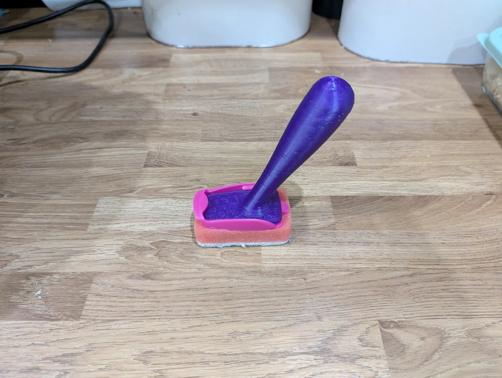 Tay cầm cho miếng bọt biển rửa chén, thiết kế để dùng với loại bọt biển thay thế mua nhầm kích thước. In PETG khoảng 35g, không cần support; gợi ý 0.28 layer height, 3 bottom/4 top, 25% cubic.