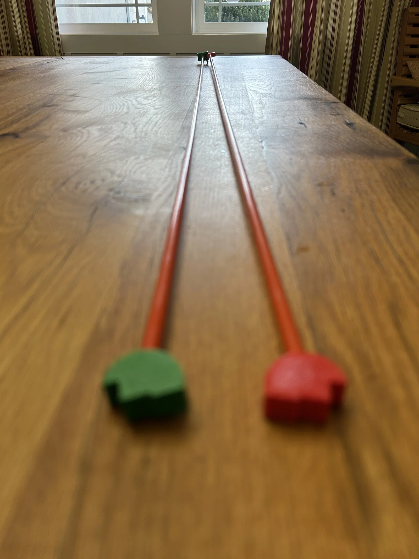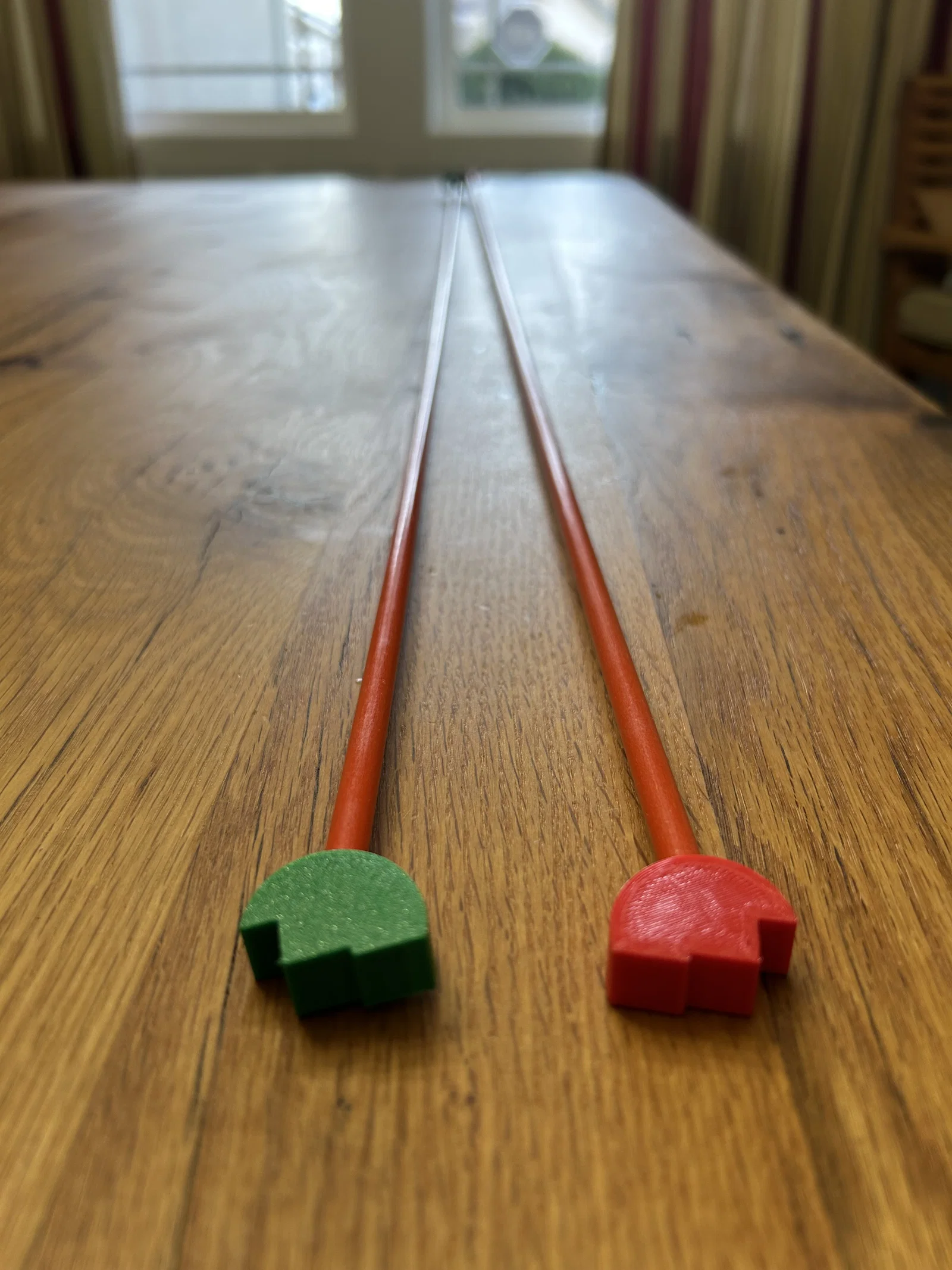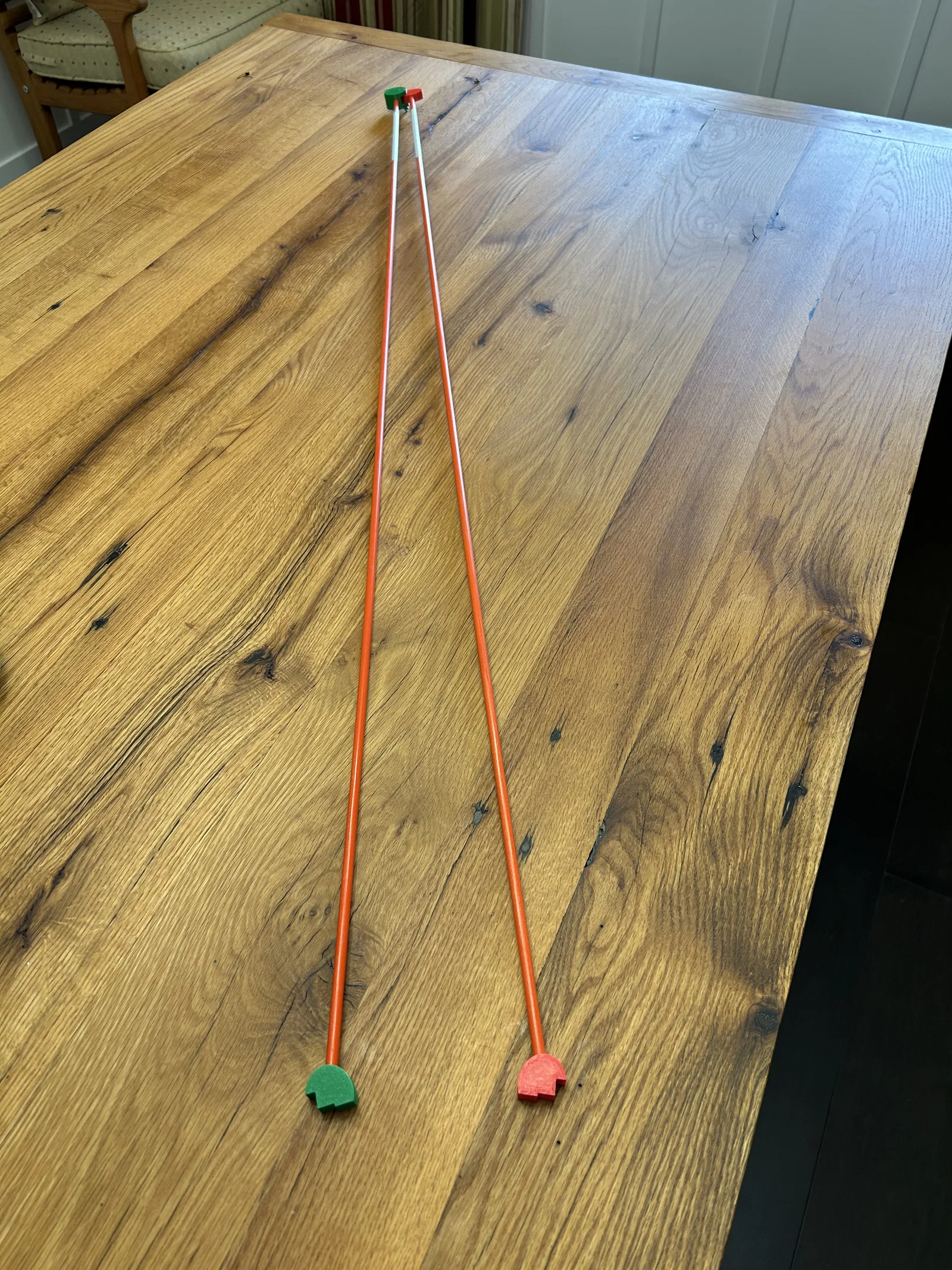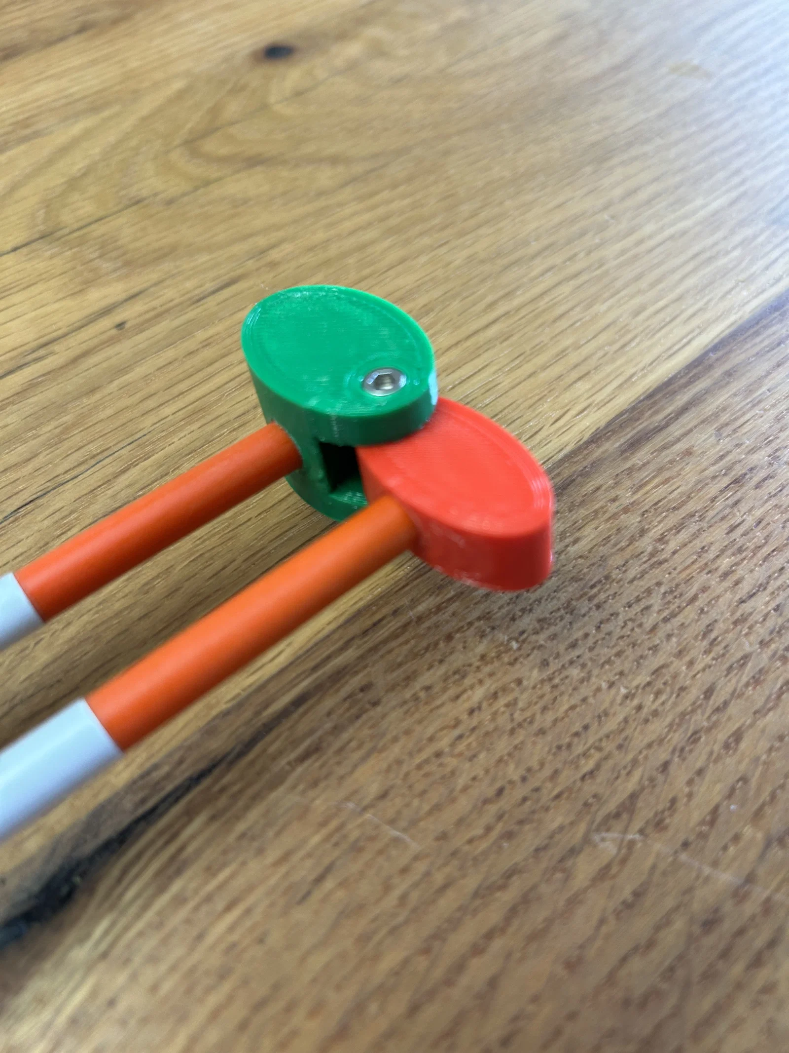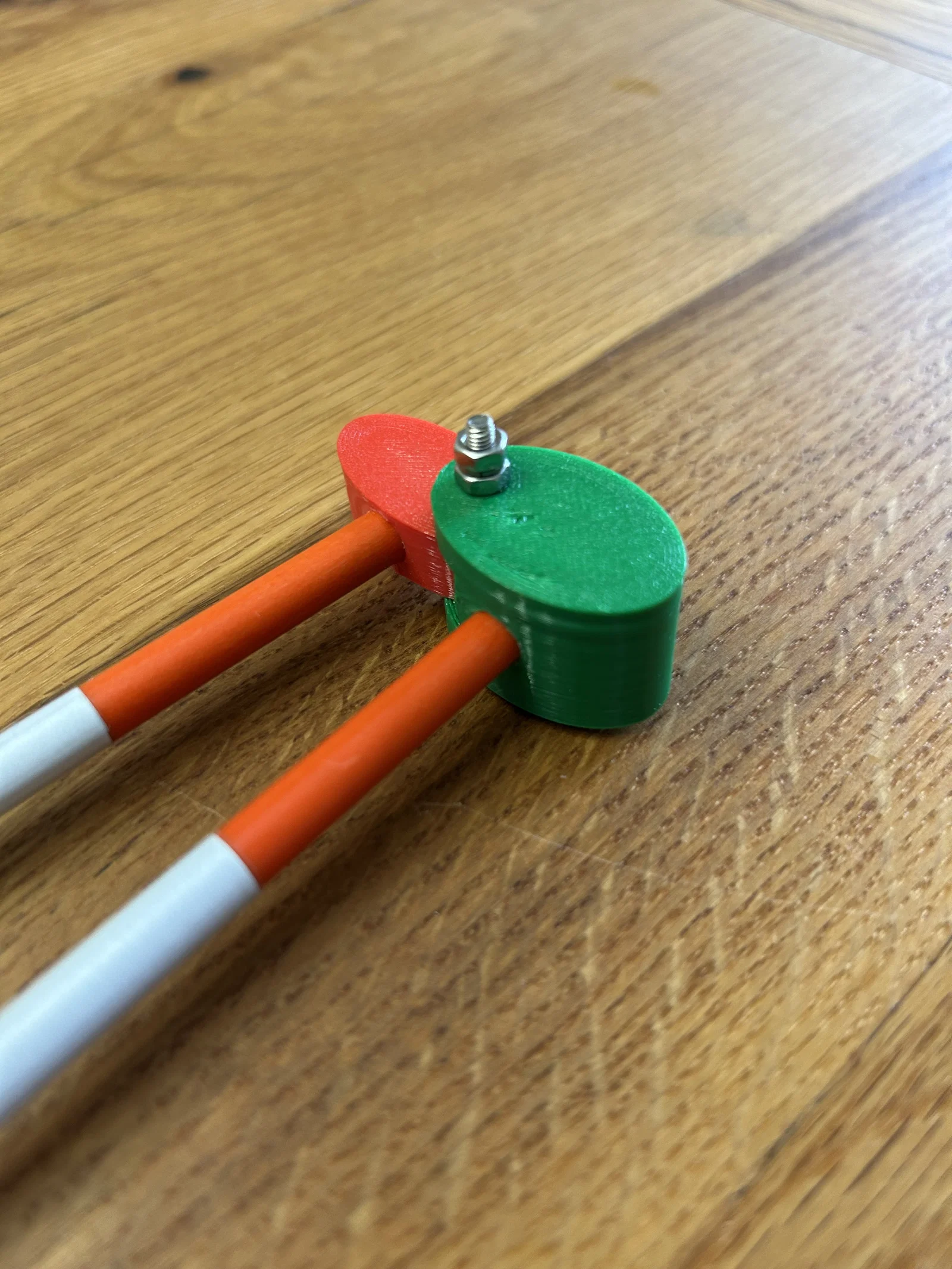 Mình đã thiết kế và in một A-frame jig 3D dùng thanh fiberglass đường kính 6.65mm (loại rod cắm đánh dấu mép đường/driveway edge marker rods) làm chân, và một bu lông cap head 24mm x 3mm làm điểm pivot. Hai đai ốc và một long đền khóa (lock washer) được siết lại với phần bu lông nhô ra khoảng ~2mm.