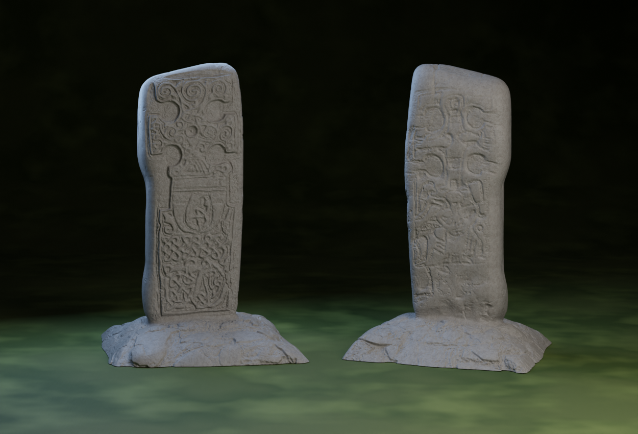 Đây là bản tái tạo 3D của Kilmorie Stone, một phiến đá dạng “cross-slab” từ thế kỷ 10 ở Galloway, Scotland. Phiến đá này là ví dụ tiêu biểu cho nền văn hóa lai của nhóm 'Gall-Ghaidhil' (Foreign Gaels) trong Thời đại Viking. Các chạm khắc phù điêu thể hiện sự hòa trộn độc đáo giữa các niềm tin: một mặt khắc cảnh Chúa Giê-su bị đóng đinh theo Kitô giáo, còn mặt kia có hệ biểu tượng thường gắn với truyền thuyết Bắc Âu về Sigurd Kẻ Diệt Rồng—cụ thể là mô-típ kềm của thợ rèn và những chú chim biết nói. Dáng thánh giá đặc trưng kiểu “hammer-head” là nét riêng chỉ thấy ở trường phái chạm khắc Whithorn.