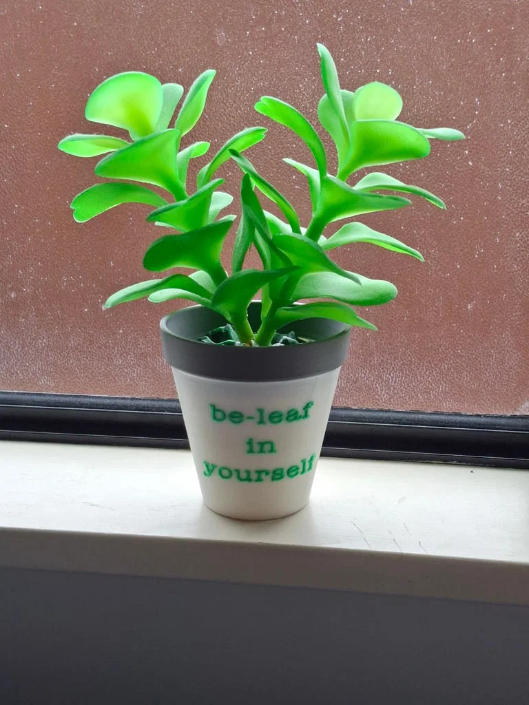 Chậu cây: câu khẳng định tích cực “be-leaf in yourself”.