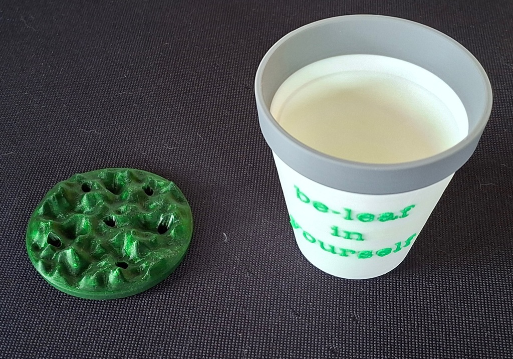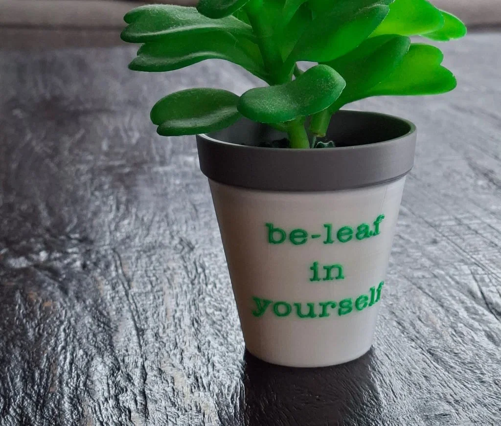 Mẫu chậu cây kèm phần lót/đất giả, có câu “be-leaf in yourself” mang ý nghĩa động viên tích cực. In không cần supports; gợi ý 3 walls, concentric wall pattern khi in multi-colour, có thể scale lớn hơn.