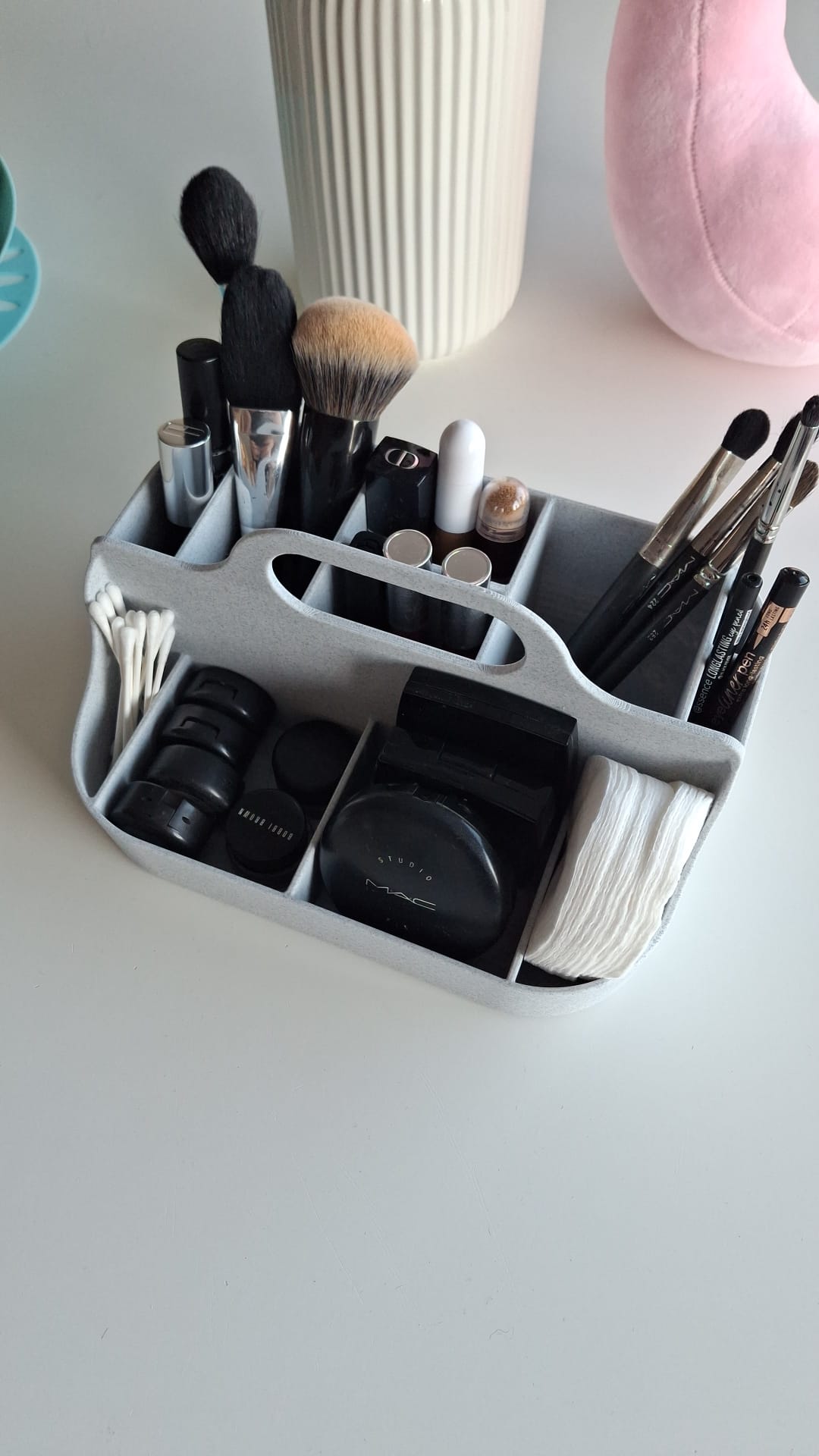 Hộp đựng đồ trang điểm in 3D gọn gàng, có vách chia ngăn. Gợi ý thiết lập: nozzle 0.4 mm, layer 0.2 mm (first layer 0.25), infill Gyroid 10%, brim 5 mm. Có kèm file Fusion để tuỳ biến ngăn.