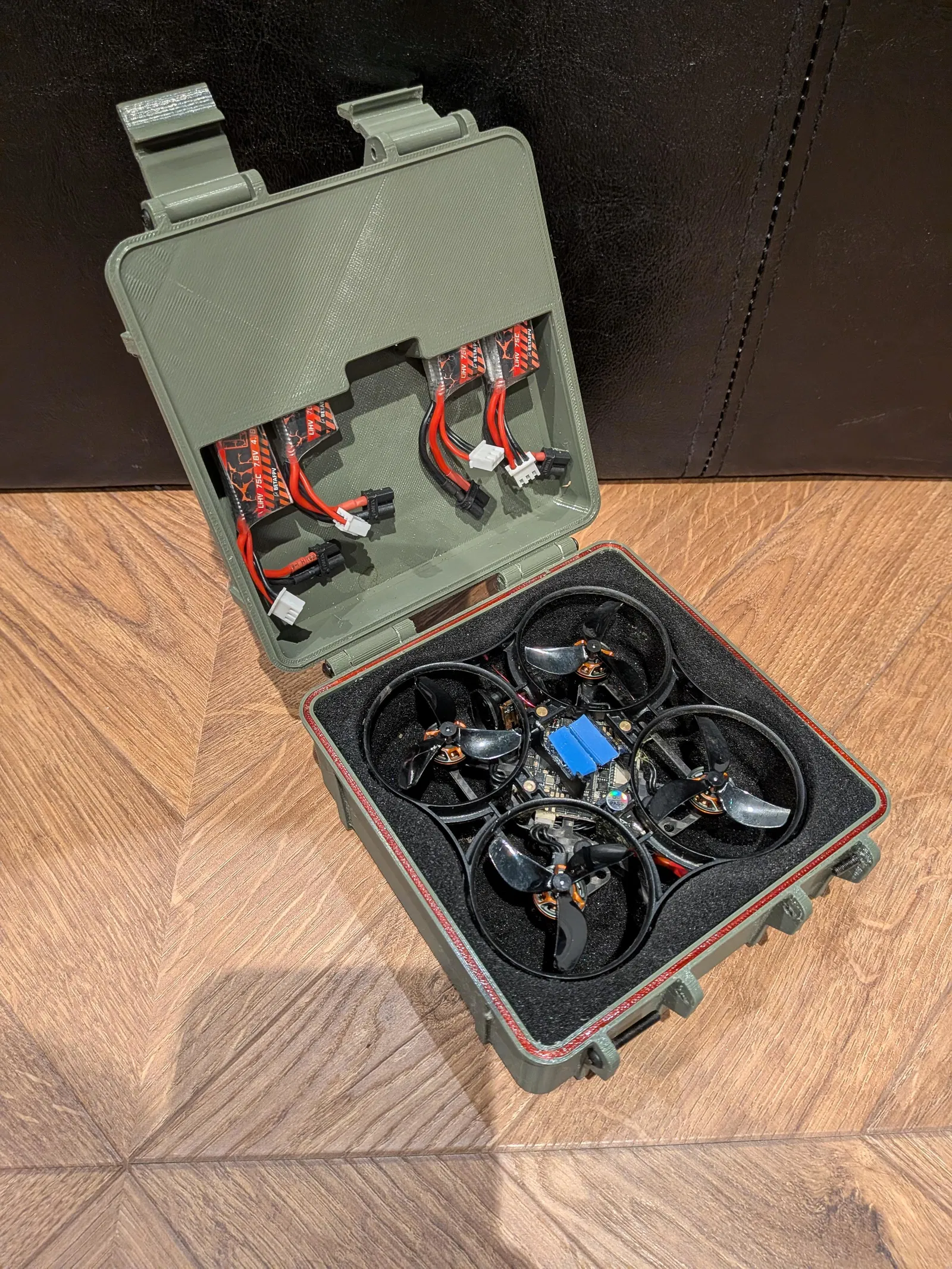Hộp đựng nhỏ gọn, chắc chắn cho BetaFPV Pavo Pico II, tận dụng foam từ hộp đóng gói. Nắp vừa 4 pin LAVA 2S (hoặc tương đương), ngăn chính sâu thêm vài mm để để cánh quạt dự phòng.