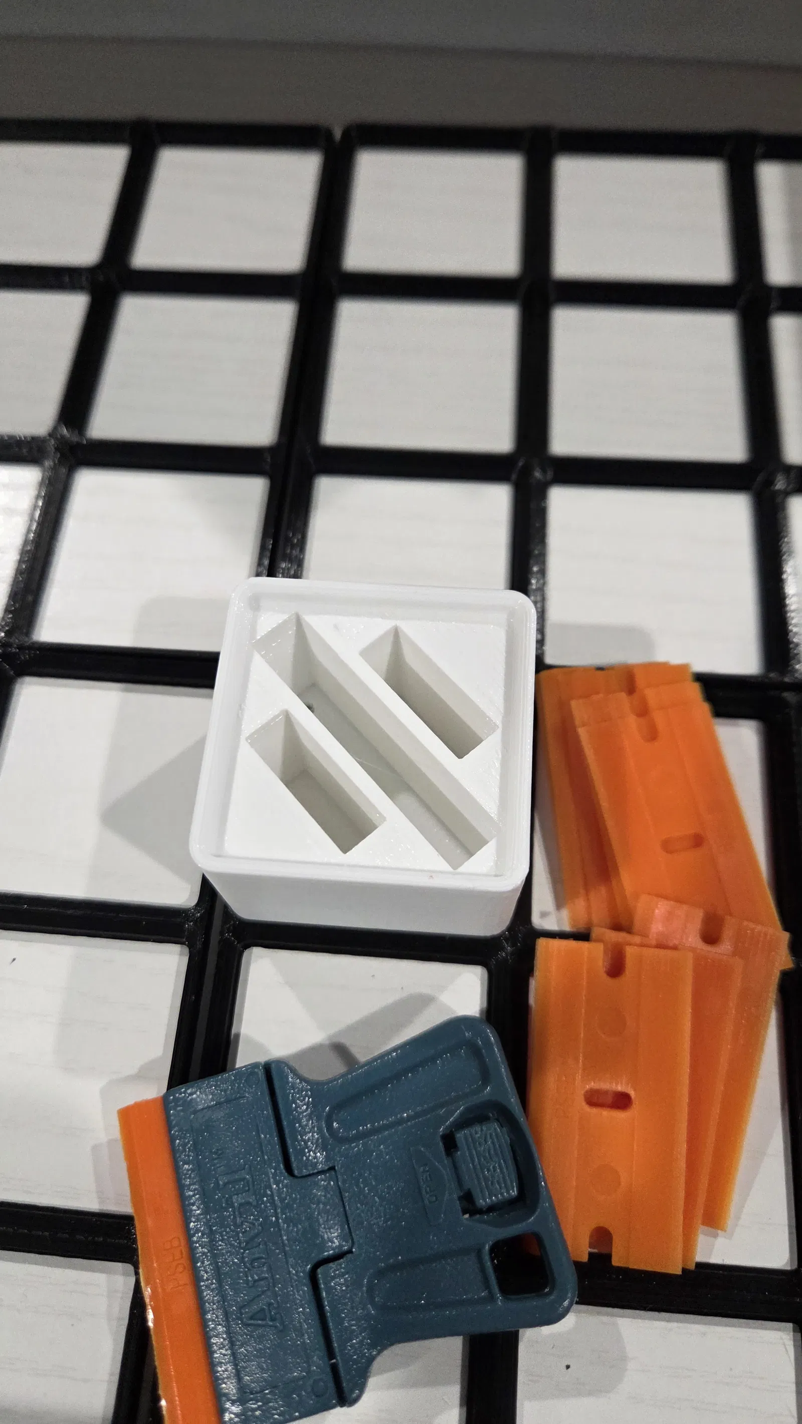 Khay Gridfinity kích thước 1x1 để cất cây Anvil 1.5 in. Mini Razor Scraper kèm theo lưỡi. Có thể chứa tối đa 11 lưỡi (5 lưỡi mỗi ngăn bên hông và 1 lưỡi gắn trong cây scraper).