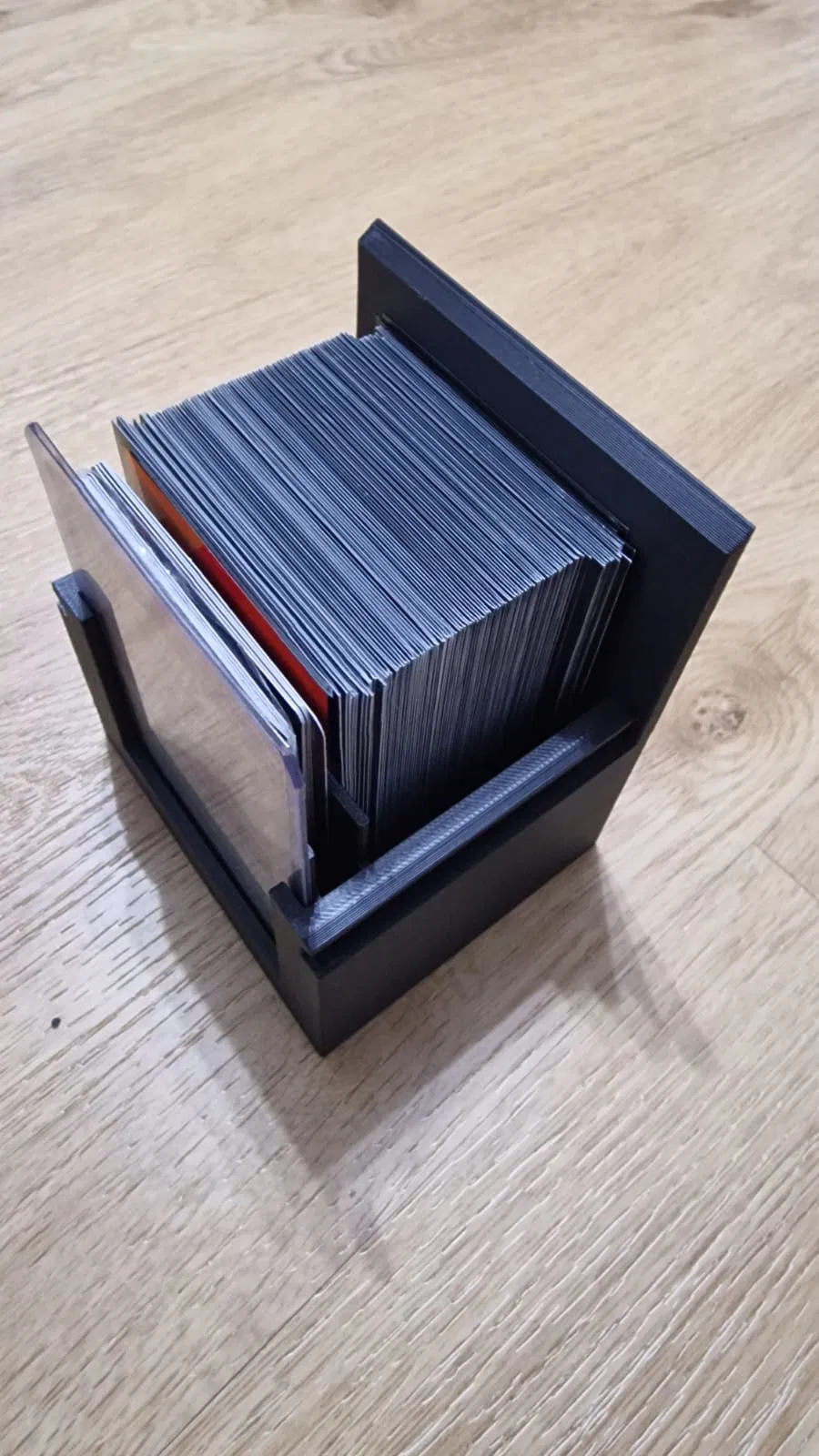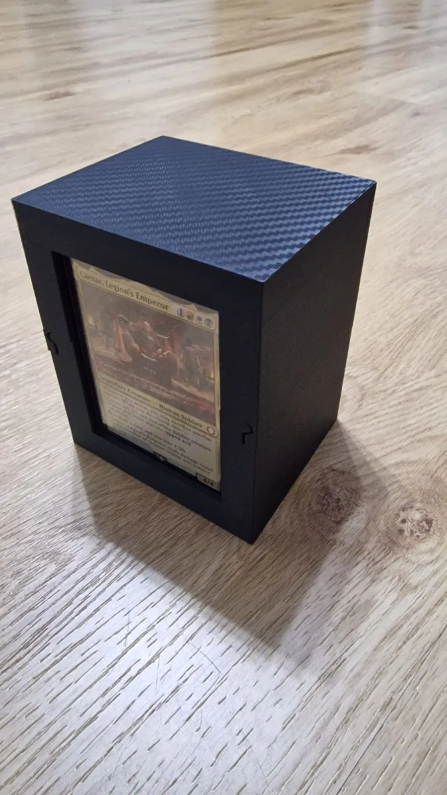 Hộp deckbox cho Magic: The Gathering Commander, chứa tối đa 100 lá single sleeved, có ngăn riêng cho token (khoảng 10–20 token sleeved) và chỗ để commander trong toploader phía trước. In gần như không cần support.