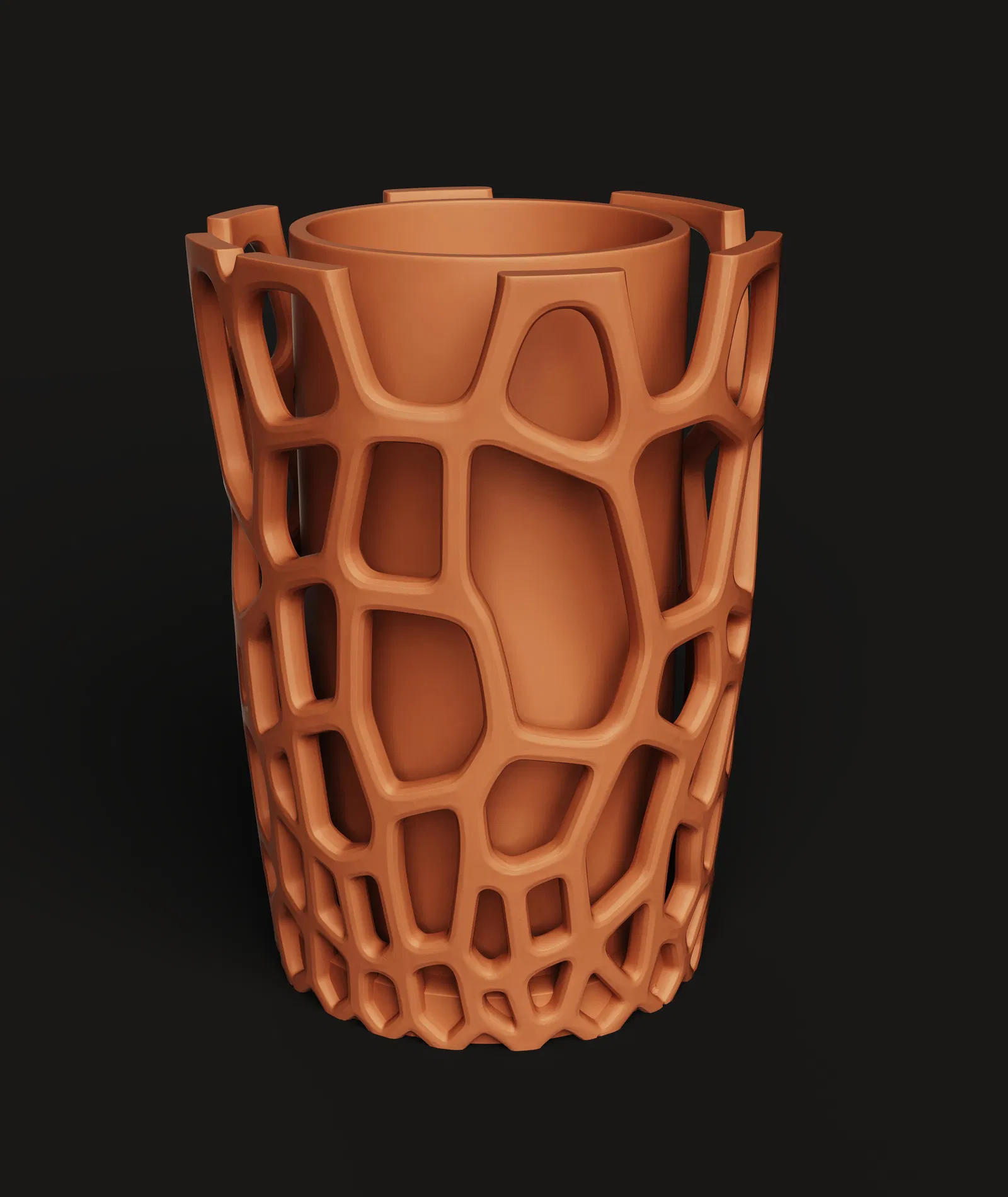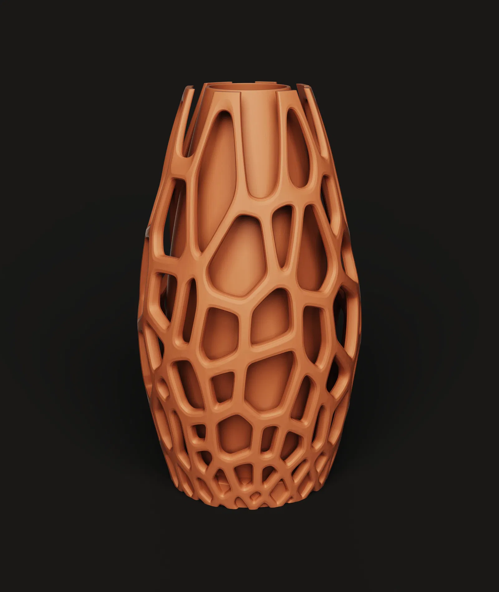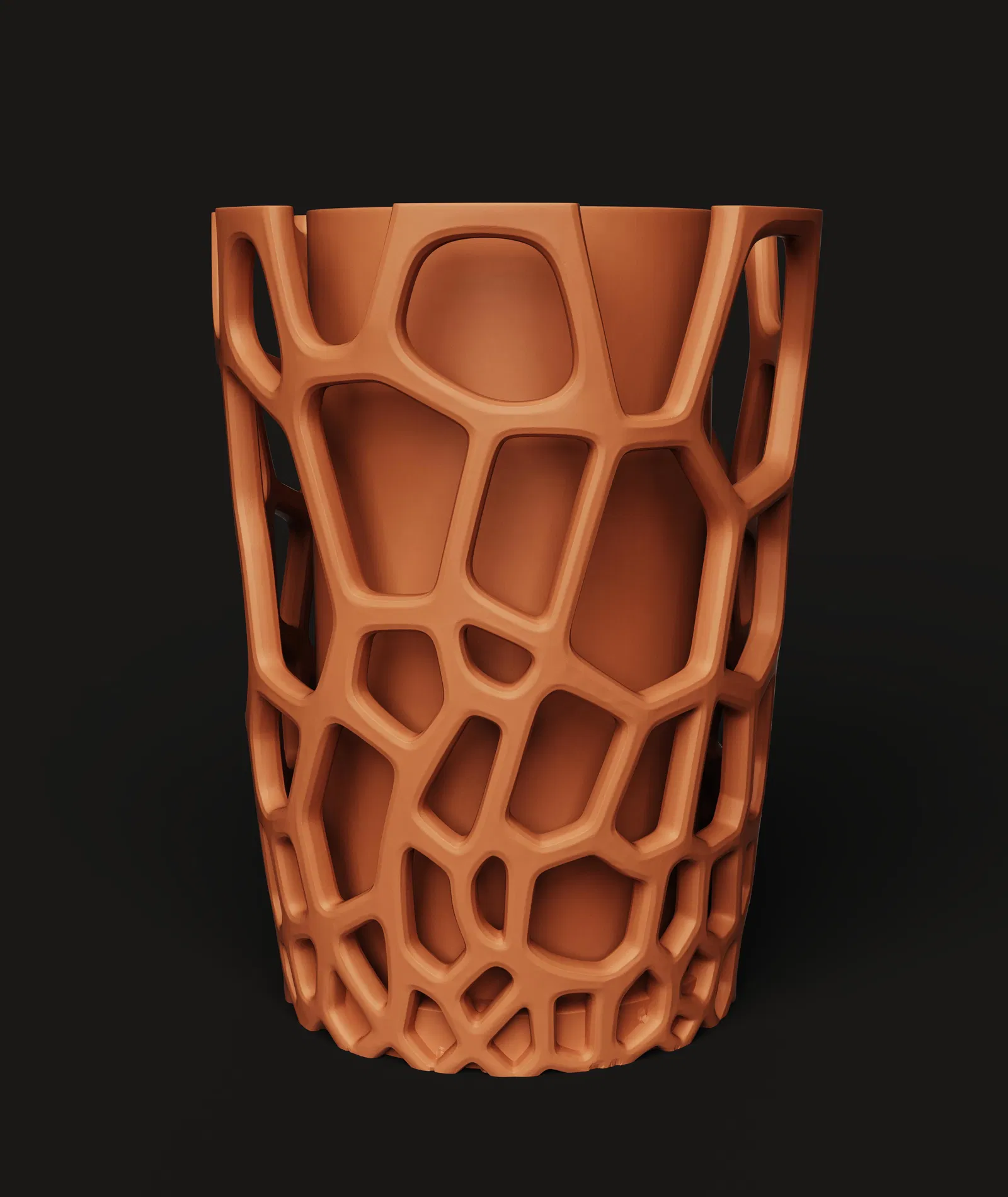 Bộ chậu Voronoi hình học với thiết kế lưới organic tạo hiệu ứng ánh sáng–bóng đổ đẹp mắt, giúp succulent và cây nhỏ nổi bật như decor nghệ thuật hiện đại. In FDM PETG, có Vase Mode hoặc bản mesh, kín nước.