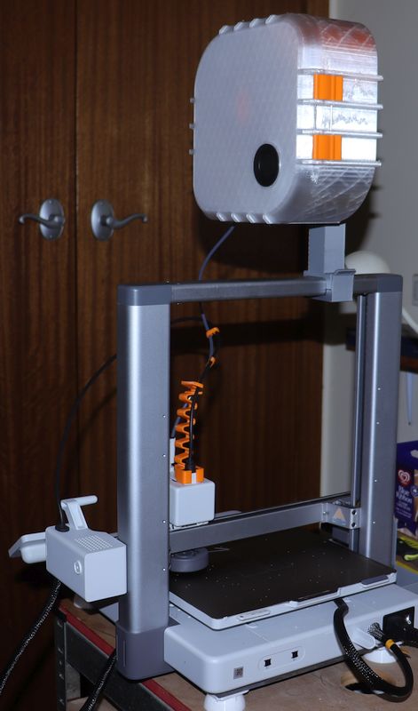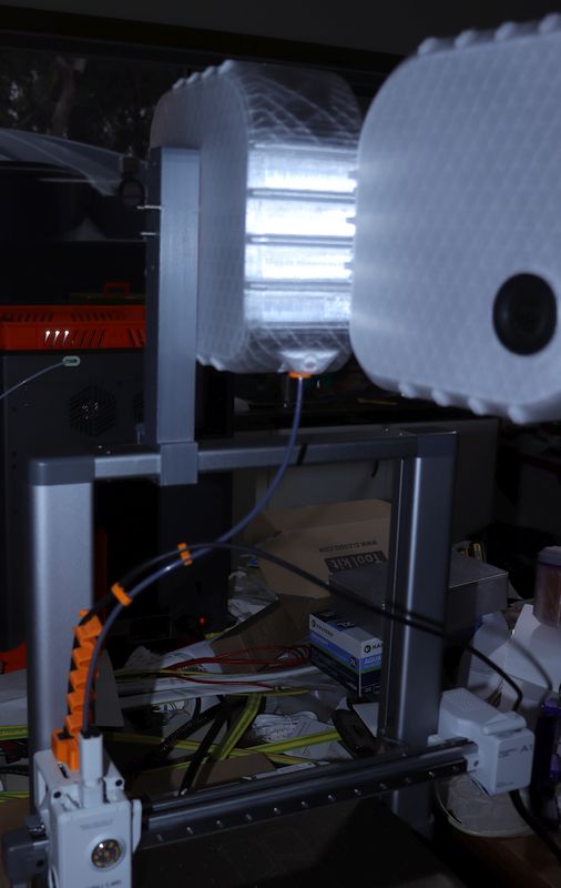 Dry box bản tiêu chuẩn có thể lắp vừa mà không cần chỉnh sửa. Ngoài ra, bạn có thể lật ngược hộp để đường đi của filament ngắn hơn. Nếu muốn lắp hộp theo kiểu lật ngược, bạn sẽ cần khoan lỗ mới trên hộp để nâng cuộn spool lên. Hộp có thể gắn ở bên nào của tay đỡ cũng được, tuỳ bạn chọn.