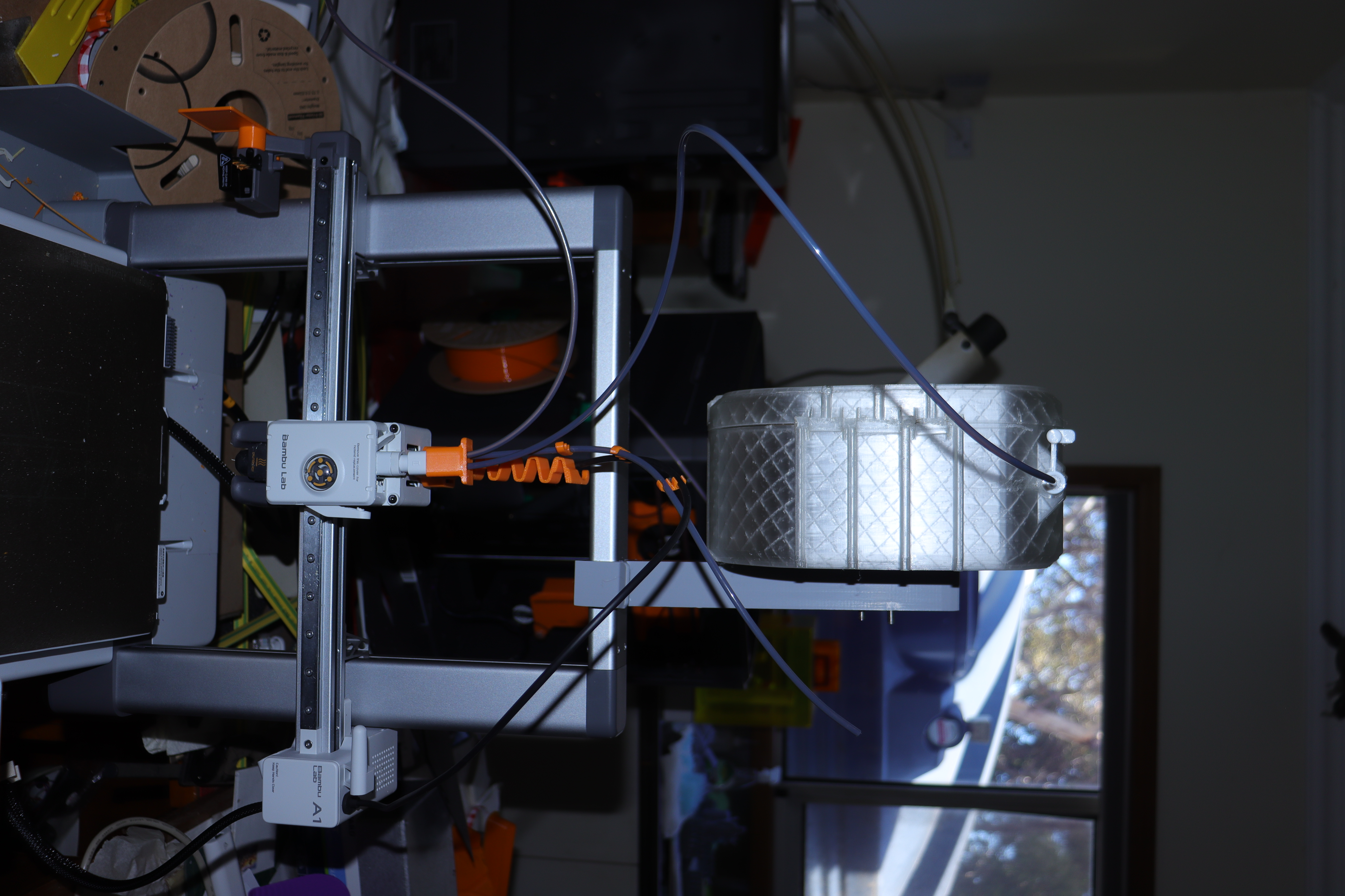 Đây là một tay đỡ (arm) và kẹp (clamp) để gắn dry box của Robert Samples lên khung máy in BambuLab A1.