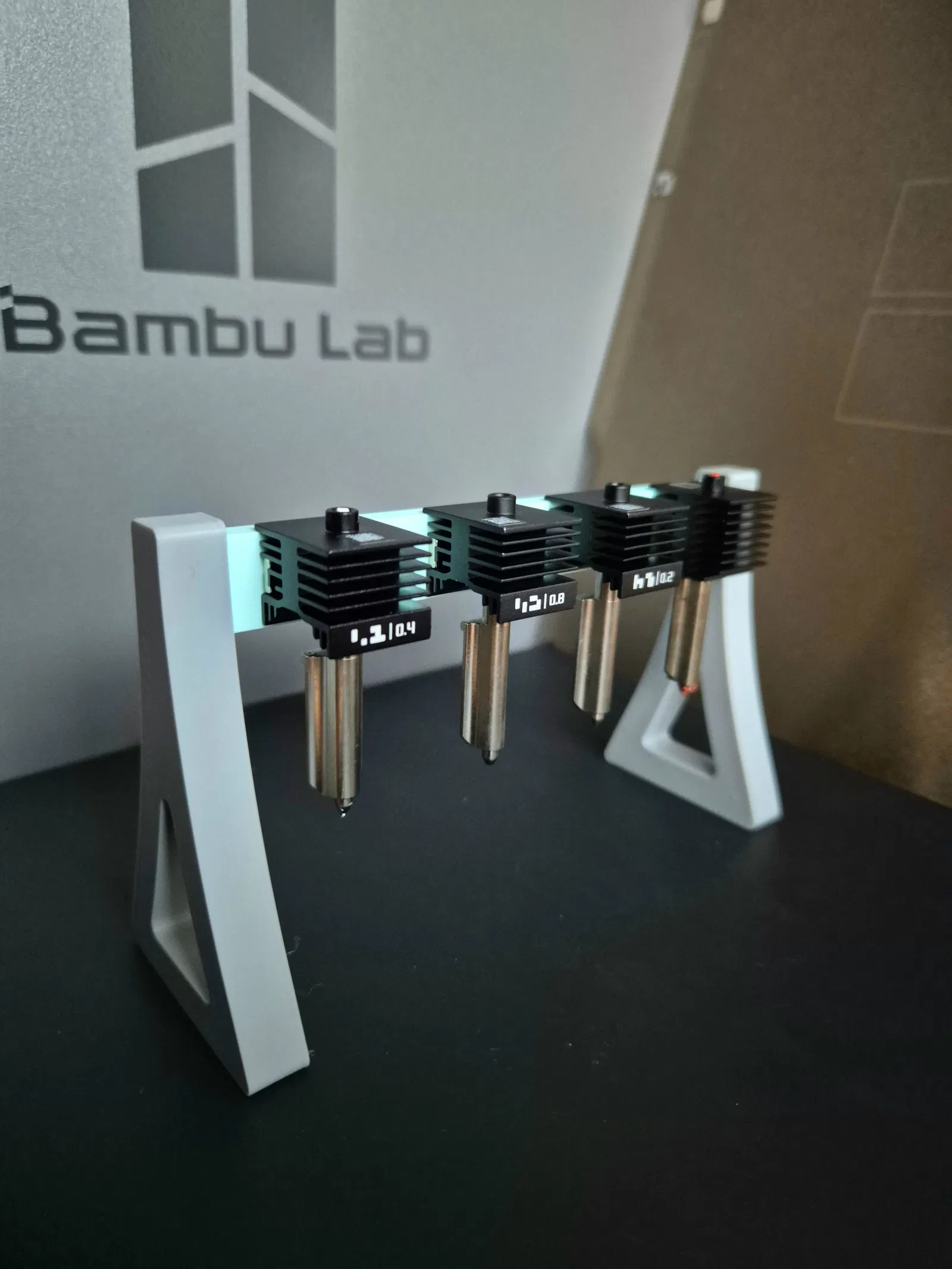 Mình đang tìm một cái hộp ổn để đựng hotend cho P2, mà mấy cái mình thấy chưa ưng. Nên mình bắt đầu nghĩ xem có cách nào thiết kế đơn giản để cất chúng không. Nhanh chóng mình nhận ra nam châm dùng để giữ nozzle áp vào toolhead cũng có thể tận dụng cho mục đích này. Mình tưởng tượng ra một cái stand mà các hotend sẽ “lơ lửng” trên không. Và đây là thứ mình làm ra...
