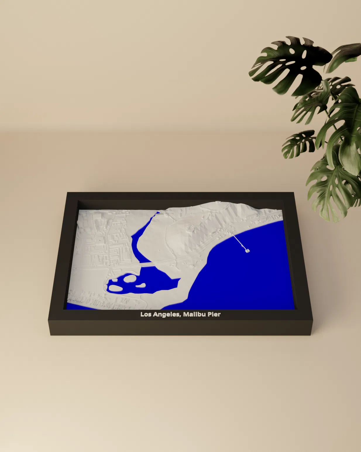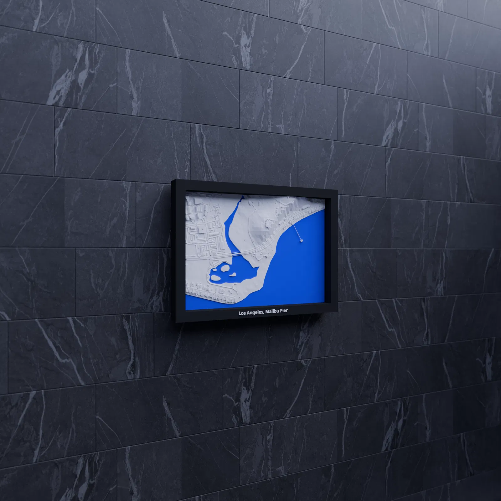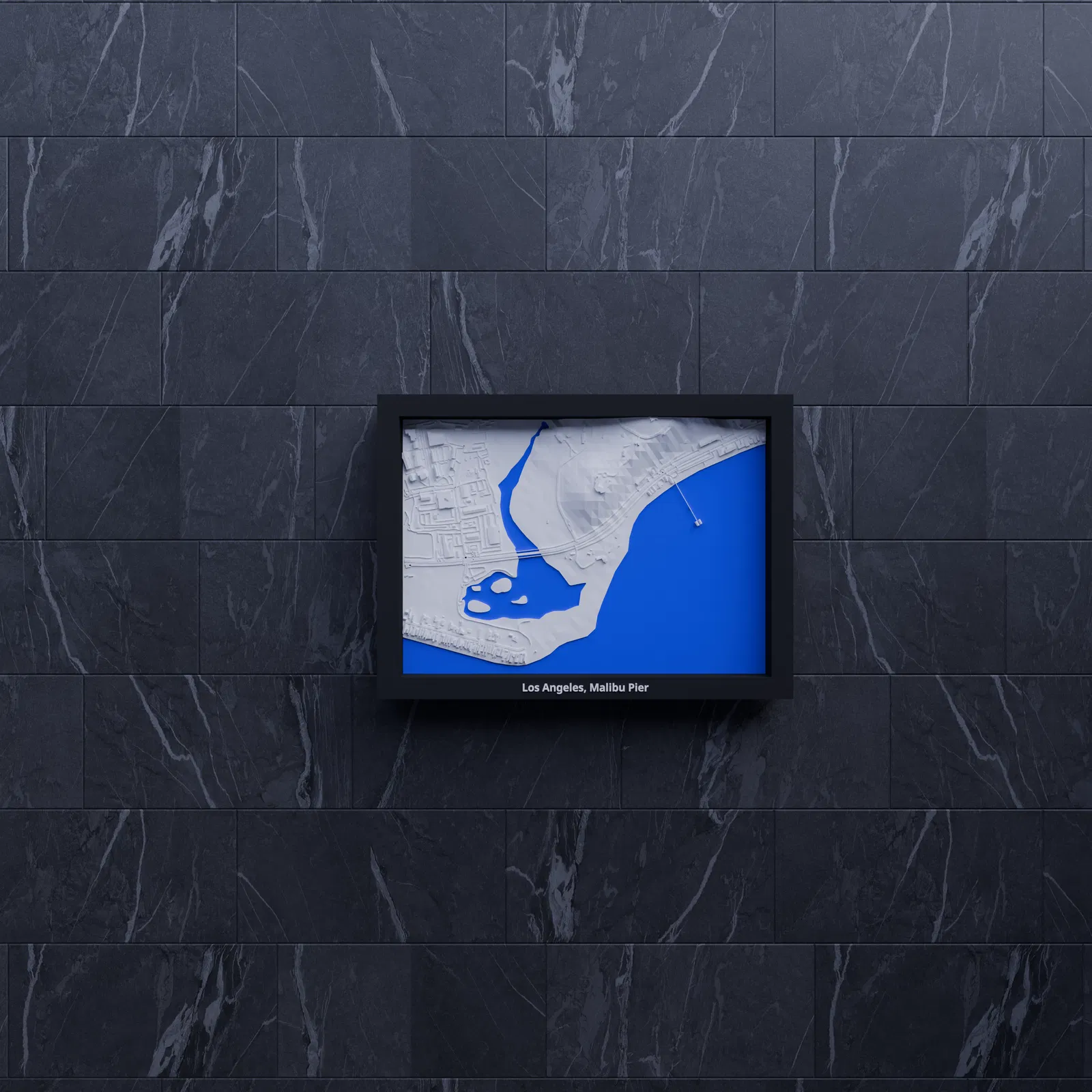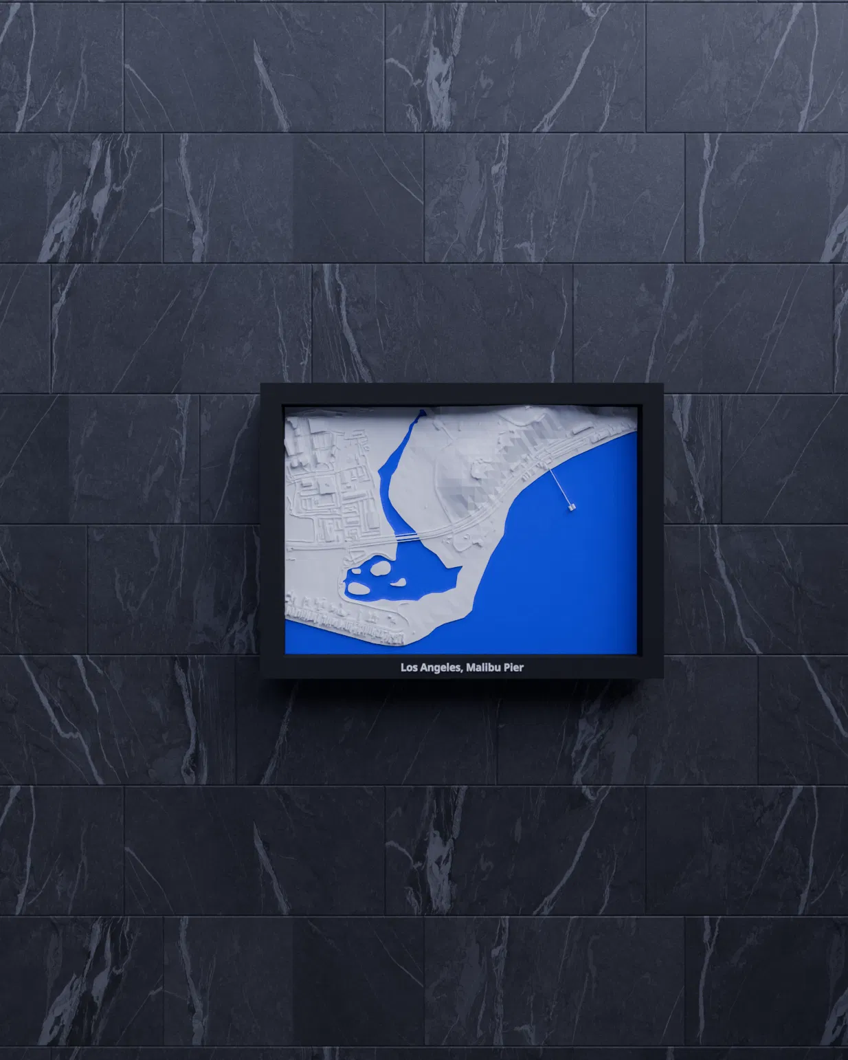 Miniature địa hình 3D tái hiện khu vực Los Angeles, Malibu Pier (Hoa Kỳ) từ dữ liệu địa lý, thu nhỏ còn 170.5 x 119.5 mm. Phù hợp in 3D để trang trí, học tập, trực quan hóa kiến trúc; kèm nhiều frame có lỗ treo.