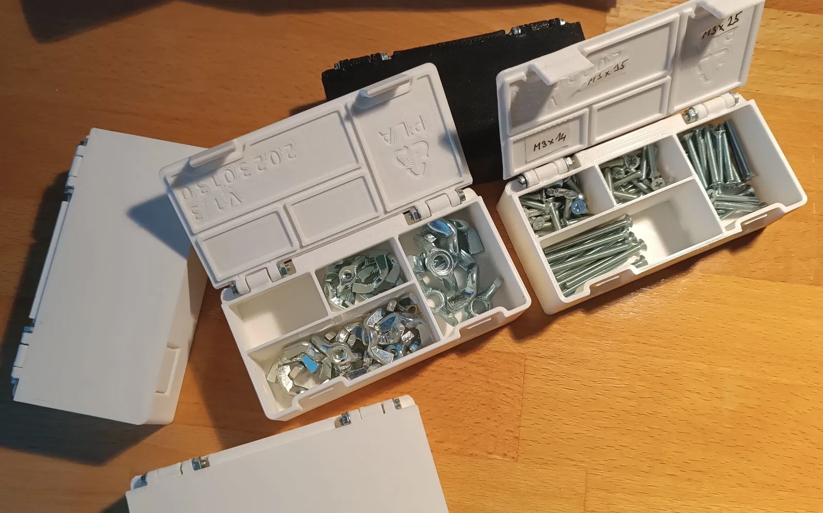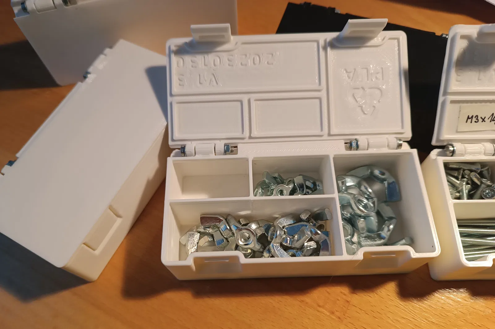 Kích thước hộp: 100x50x28.5 mm, độ dày thành 1.8 mm. Bản lề dùng ốc M2.5 x 20 mm. Cũng có thể dùng một đoạn filament rồi nung chảy hai đầu để làm chốt. Phiên bản tiêu chuẩn có phần bên trong chia thành 4 ngăn.