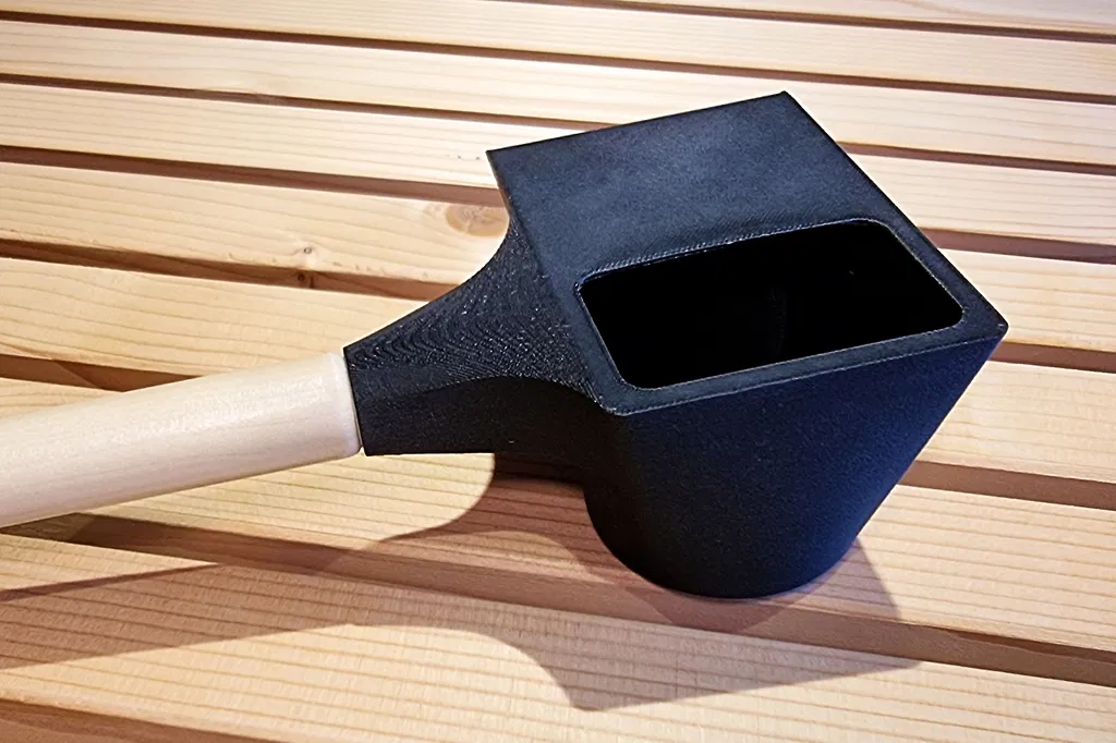 Muỗng múc nước sauna lắp lên cán gỗ 17 mm và cố định bằng vít gỗ nhỏ. Đầu vòi có lỗ 1 mm cho tia nước mịn hơn. Có thể in carbon fiber, PLA hoặc PETG vì chi tiết thường ngâm trong nước nên khó bị chảy.