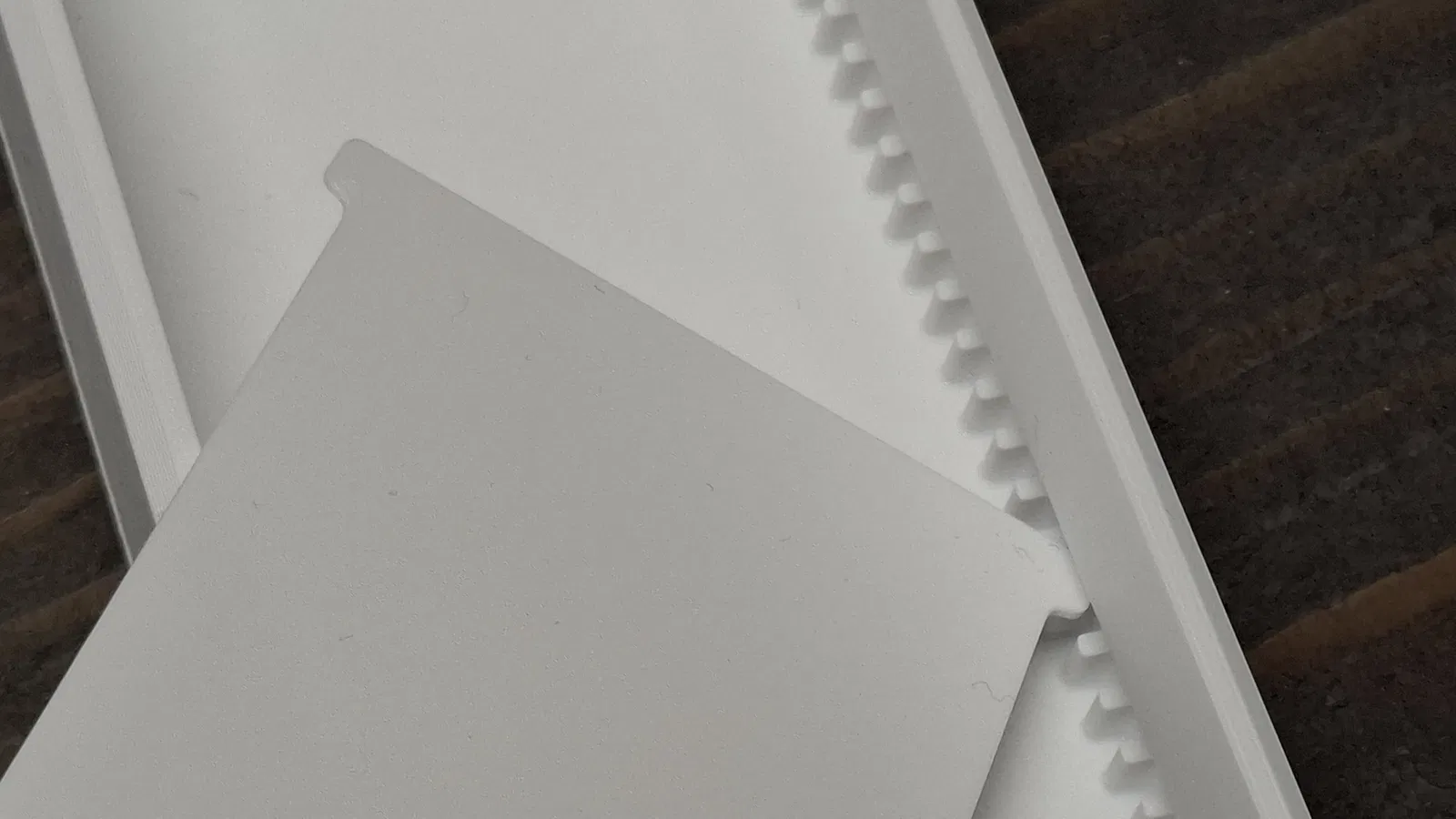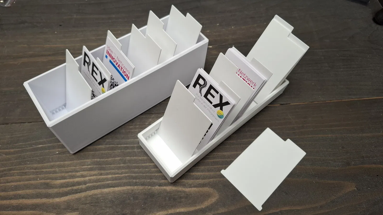 Hộp gom danh thiếp đặt đứng, dạng chia ngăn (Fächerbox). Thông số vách ngăn 4mm/5mm là độ dày phần gờ kẹp: 4mm dễ nhả để dời thường xuyên, 5mm phải nghiêng mới trượt, hợp dùng cố định.