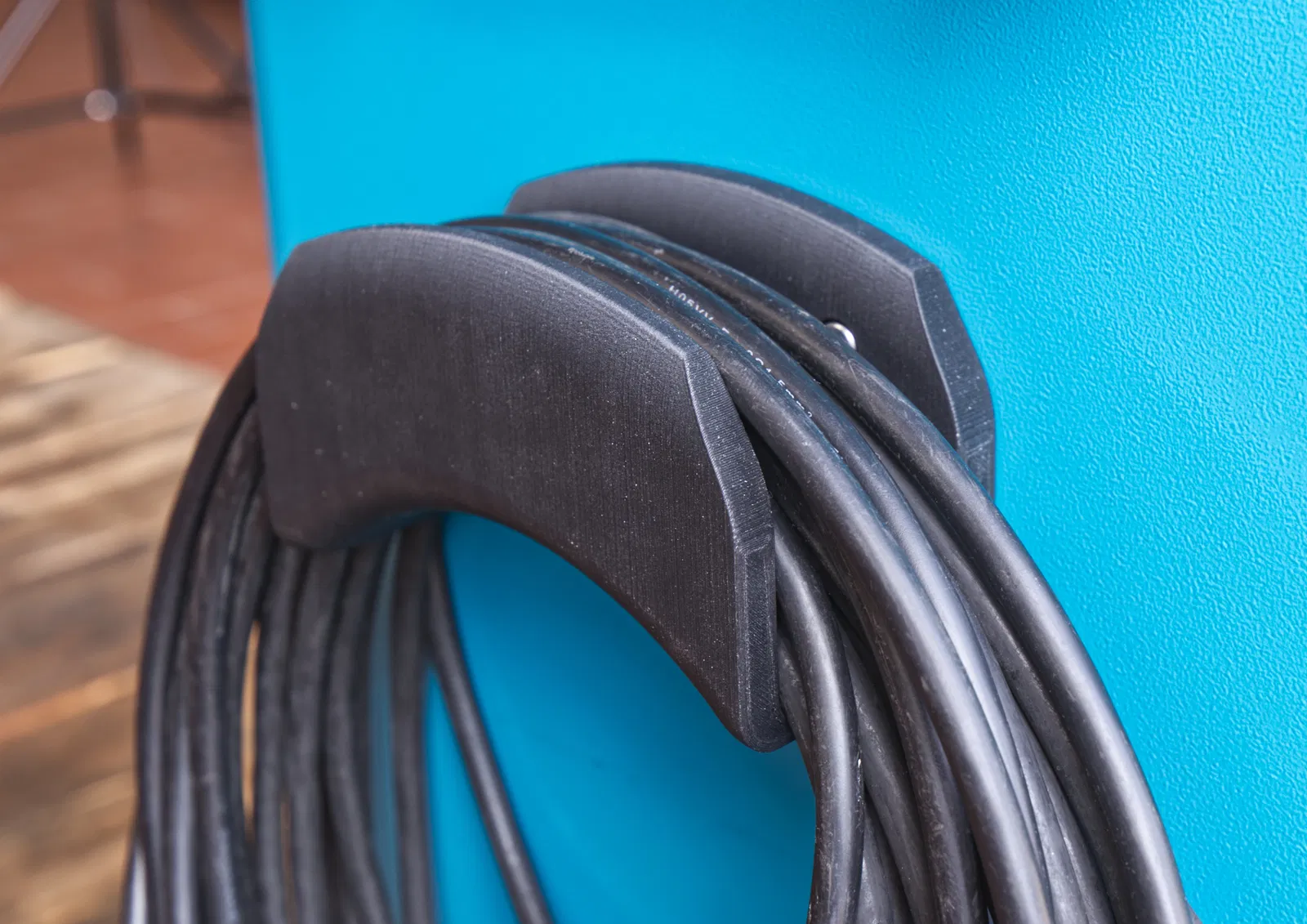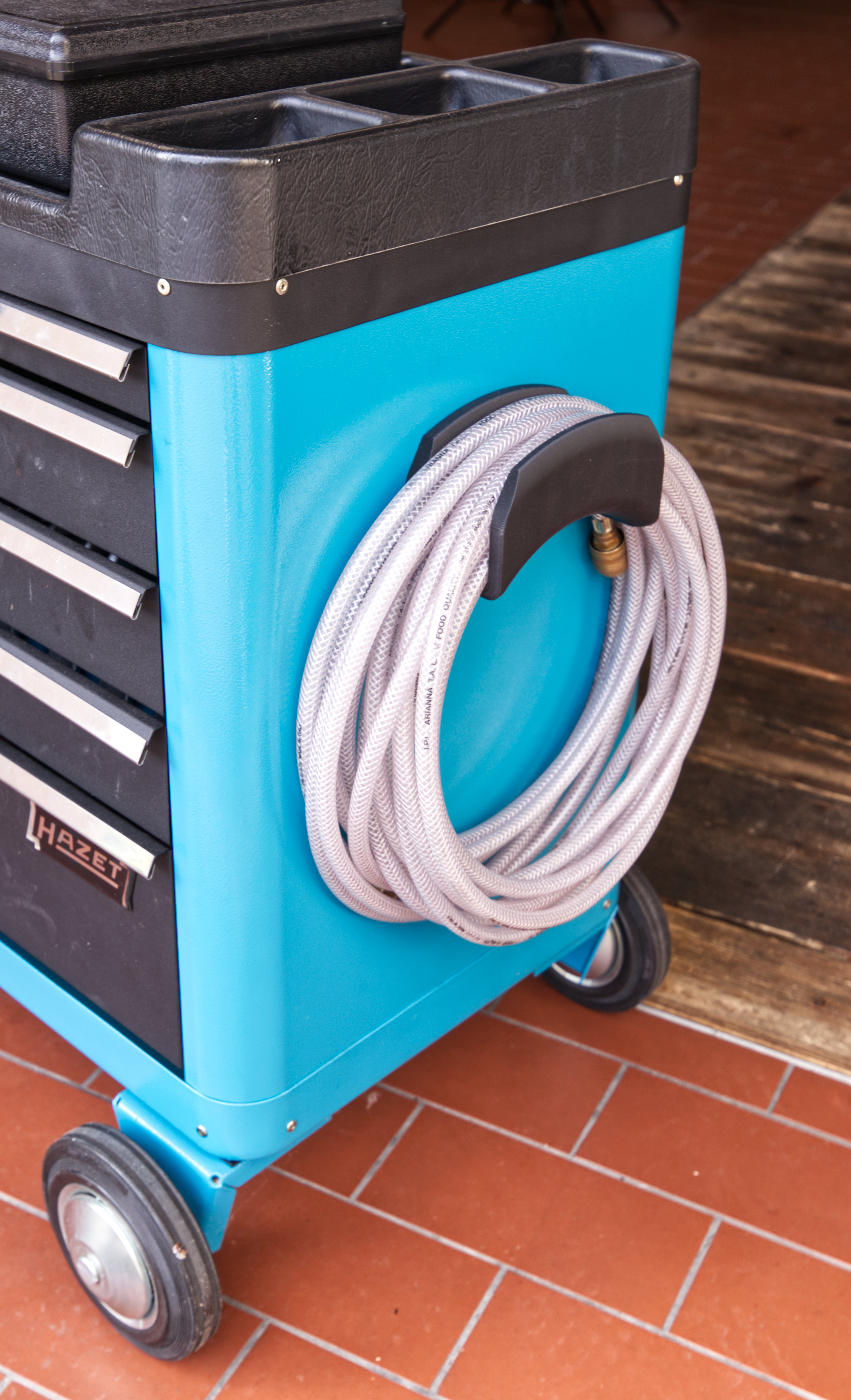 Giá đỡ dây cáp và ống khí nén gắn lên xe đẩy dụng cụ Hazet. Thiết kế đối xứng dùng được cả hai bên. Khuyến nghị in với support “touching build plate” và 5 wall lines để tăng độ bền.