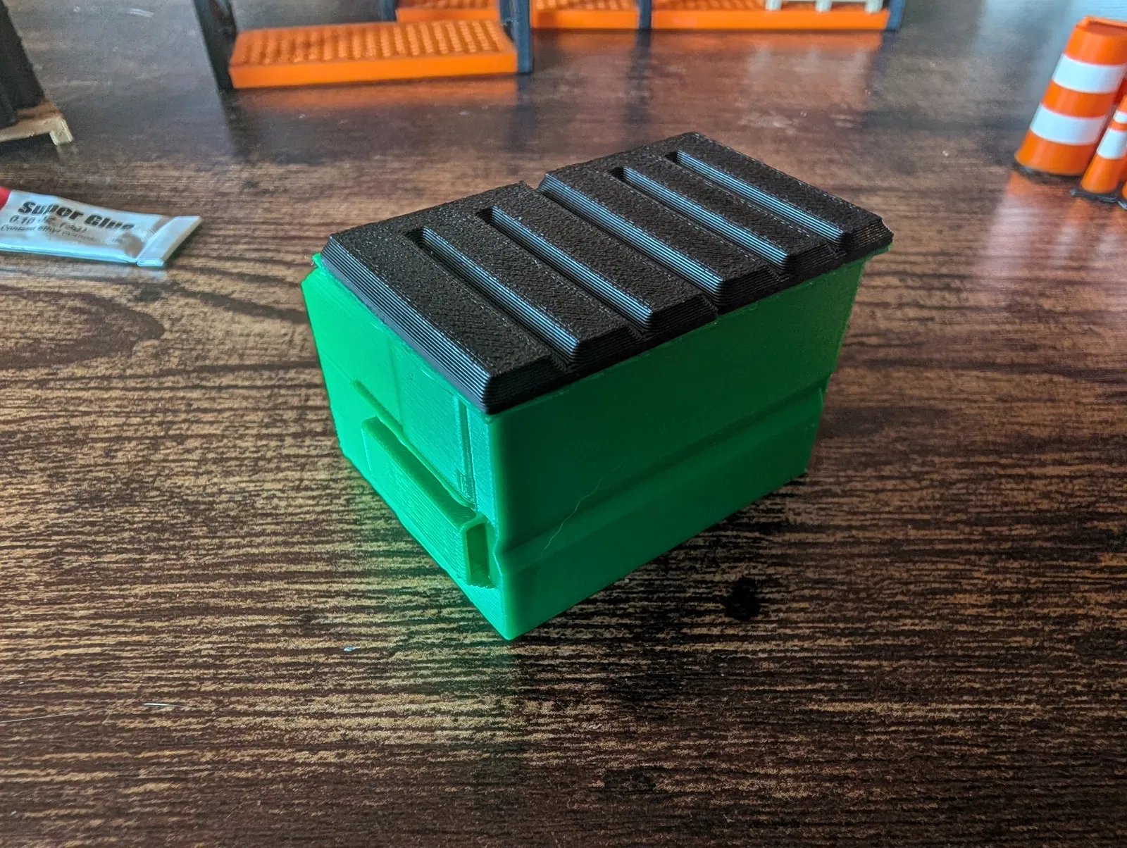 Mẫu 1:32 scale 4-yard dumpster dùng làm đạo cụ nền cho diorama và mô hình tỉ lệ. Có nắp rời; hiện khuyên dán keo cố định. In đẹp với PLA hoặc PETG, nên dùng Natural Tree Supports.