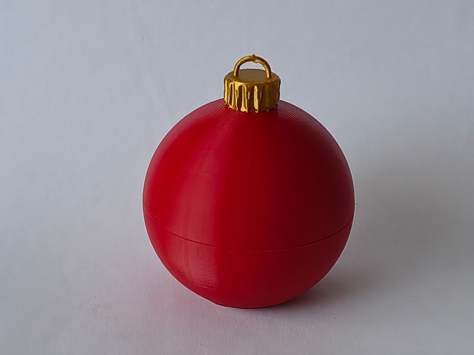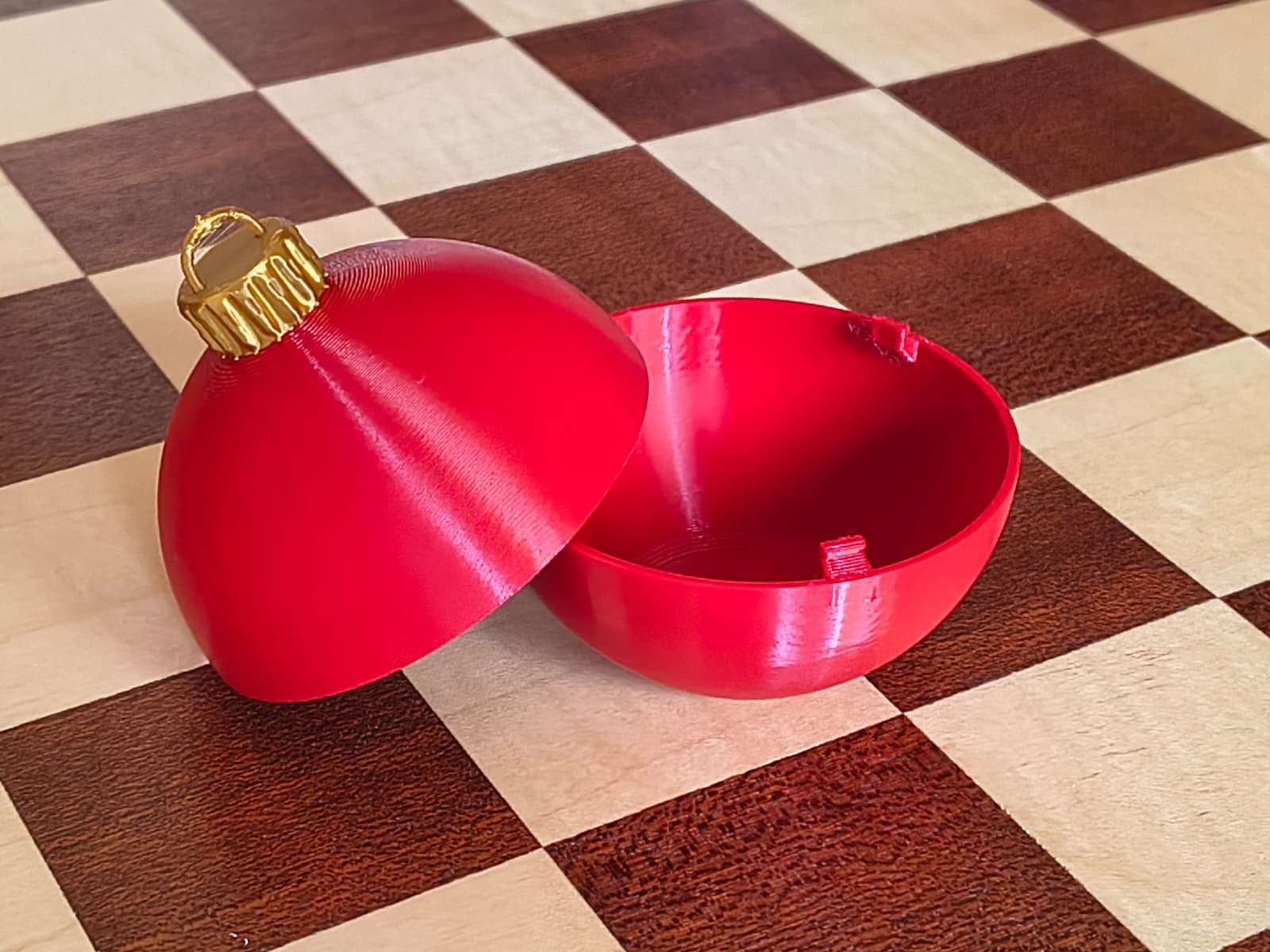 Quả châu Noel snap-fit in 3D, gồm 2 mảnh lắp “click” và có ngăn chứa bí mật để giấu kẹo, quà nhỏ hay lời nhắn. Dễ in, dễ ráp, không cần support; khuyến nghị dùng Arachne walls.