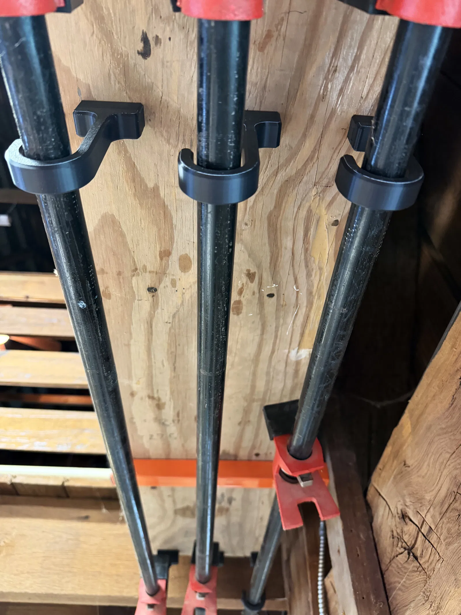 Mấy cái hook này được thiết kế để gắn kẹp ống 3/4" (3/4" pipe clamp) vào mặt dưới của một kệ dài trong xưởng của mình, nhưng cũng có thể dùng cho các loại ống/tube khác, hoặc dùng như một cái móc treo nói chung. Phần mount được cố định bằng hai con vít, và phần hook ăn khớp với một dovetail có rãnh (notched dovetail), giúp ngăn không cho hook bị trượt tuột ra phía sau.
