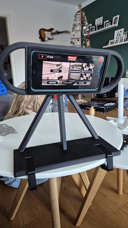 Đây là một giá đỡ để đặt smartphone cần thiết khi chơi Carrera Hybrid. Có thể kẹp/cố định lên mép mặt bàn để đứng vững hơn. Hướng dẫn lắp ráp thể hiện qua các hình ảnh. Giá đỡ này chứa được smartphone tối đa 166 mm x 85 mm (tính cả ốp bảo vệ). Những smartphone nhỏ hơn 160 mm x 80 mm sẽ không được khung giữ và sẽ không vừa.