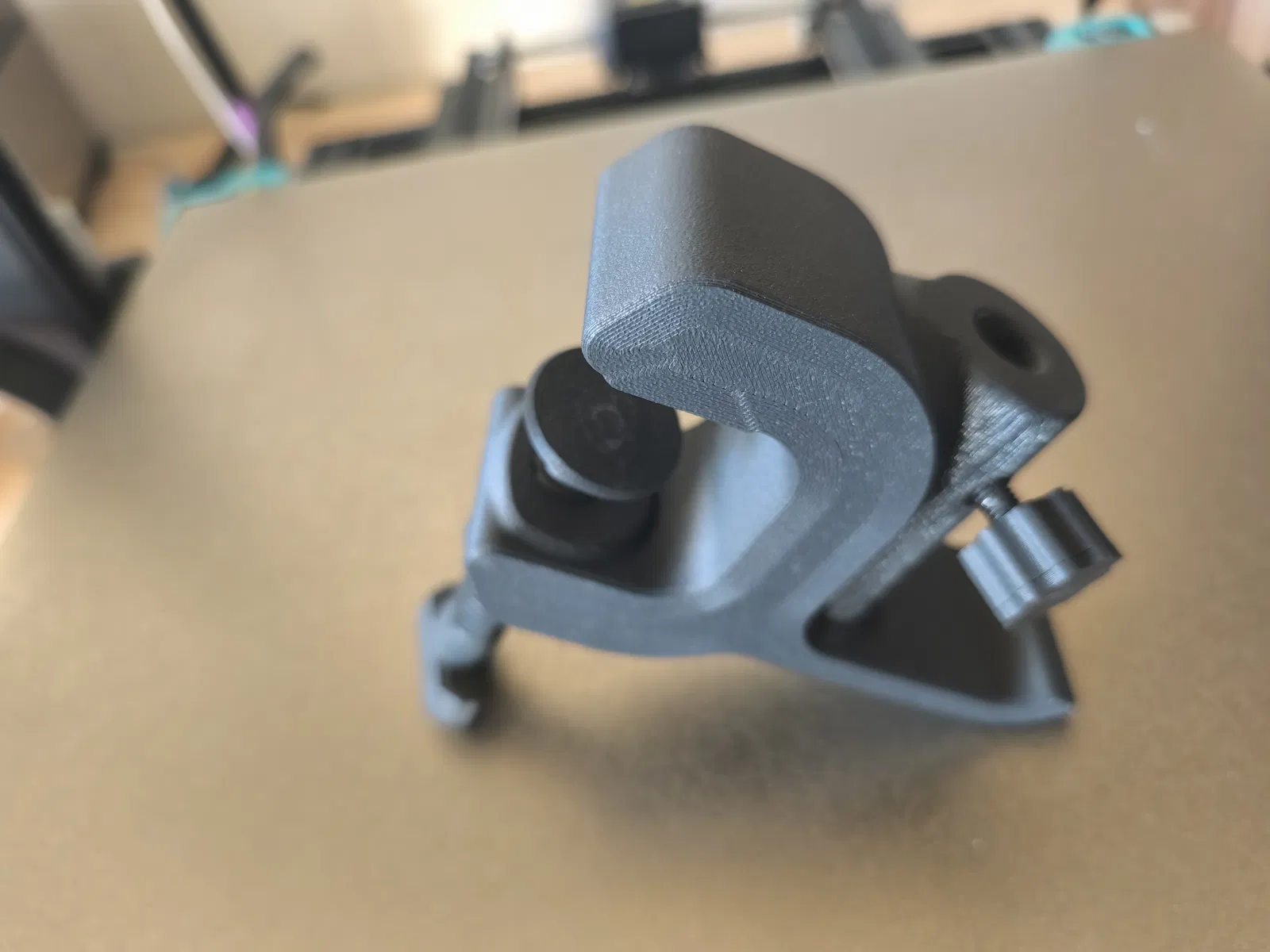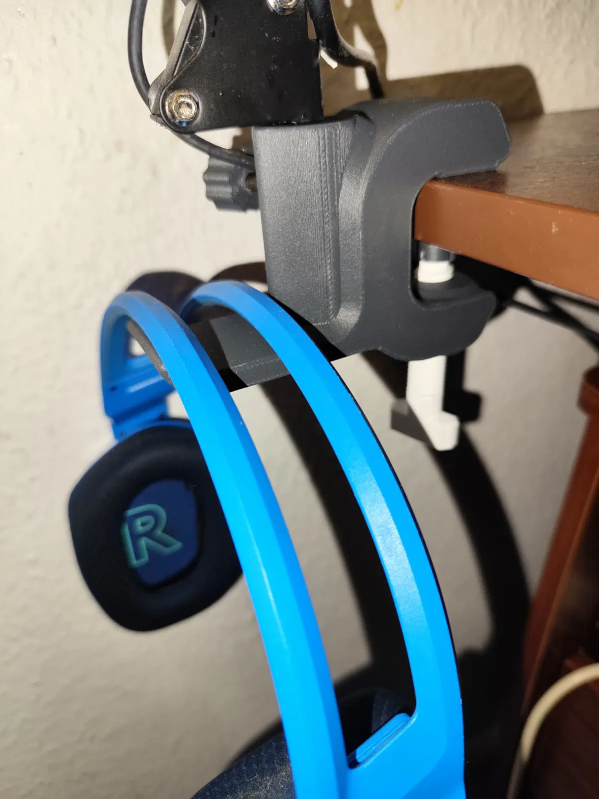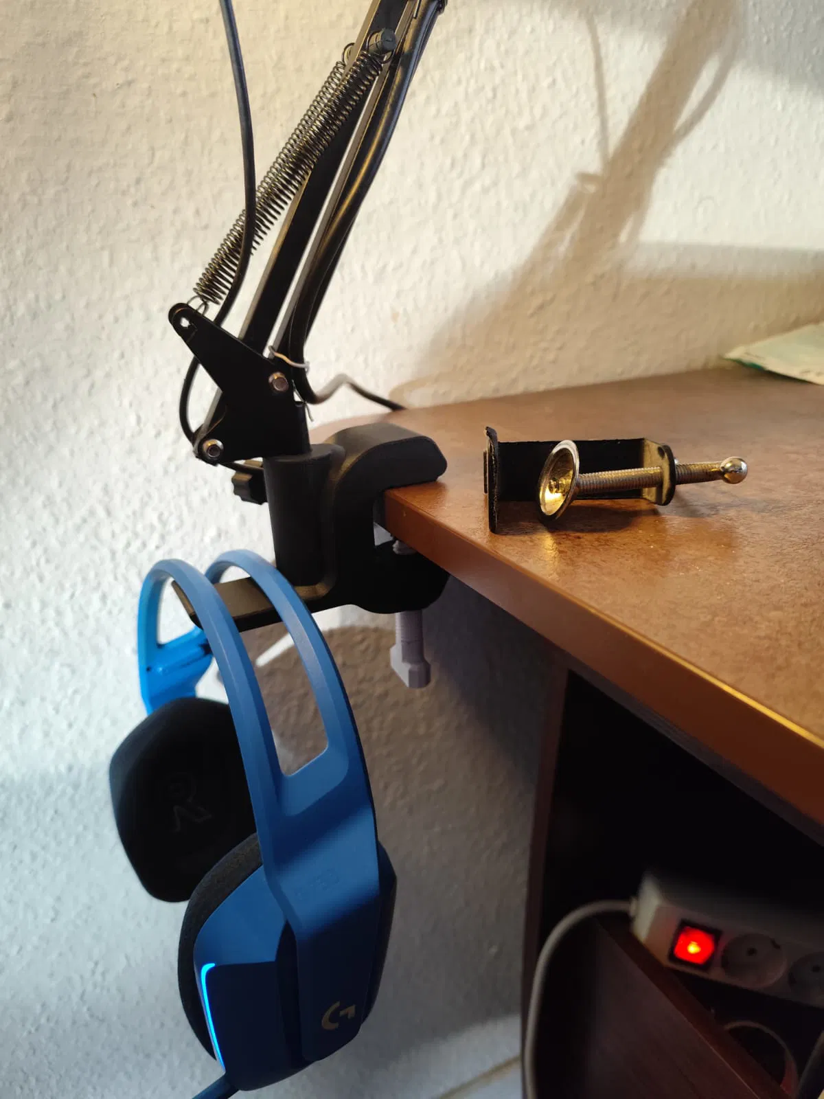 Đây là một giá đỡ micro và tai nghe rất chắc chắn. Đường kính lỗ lắp là 12 mm. Bạn cần một con ốc M6 dài 20 mm và một đai ốc cấy ren M6 (insert nut).