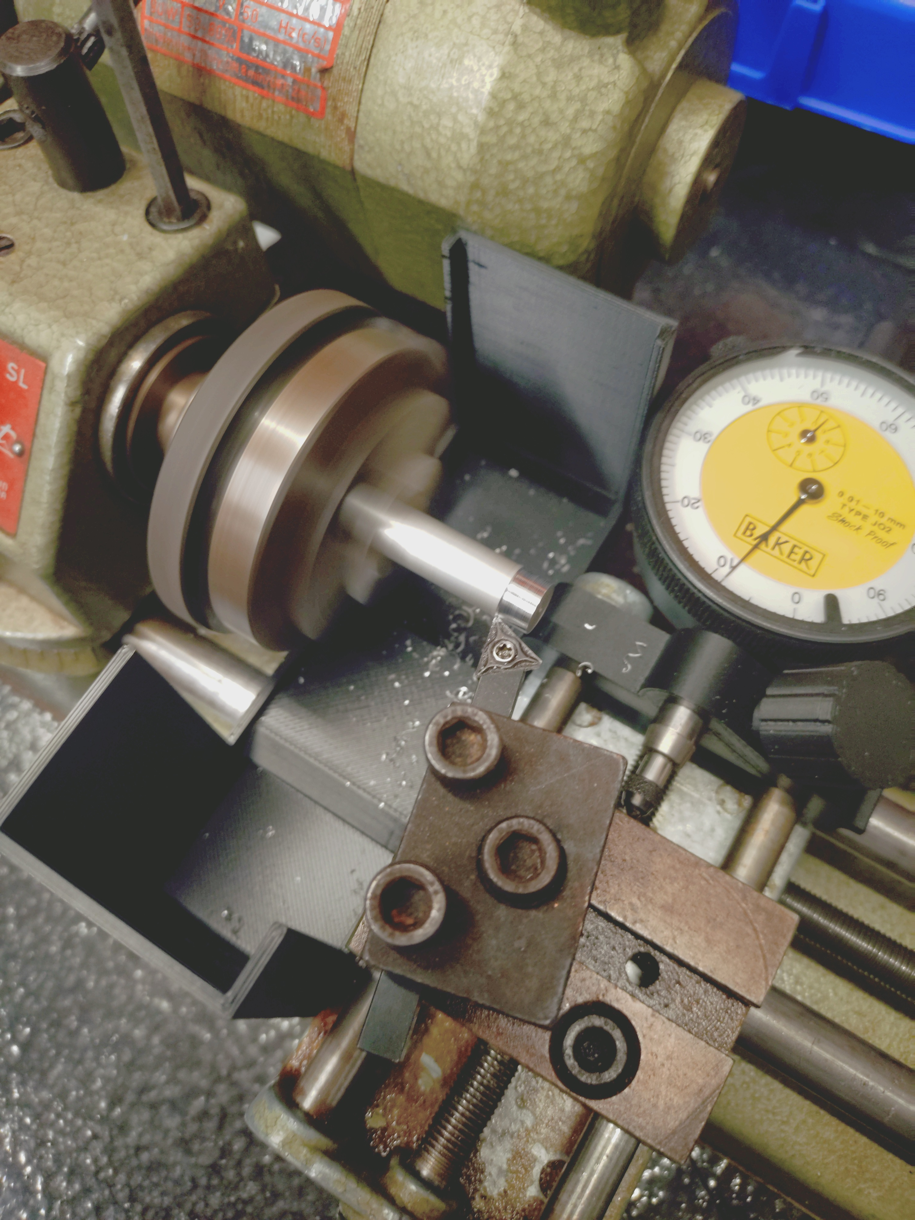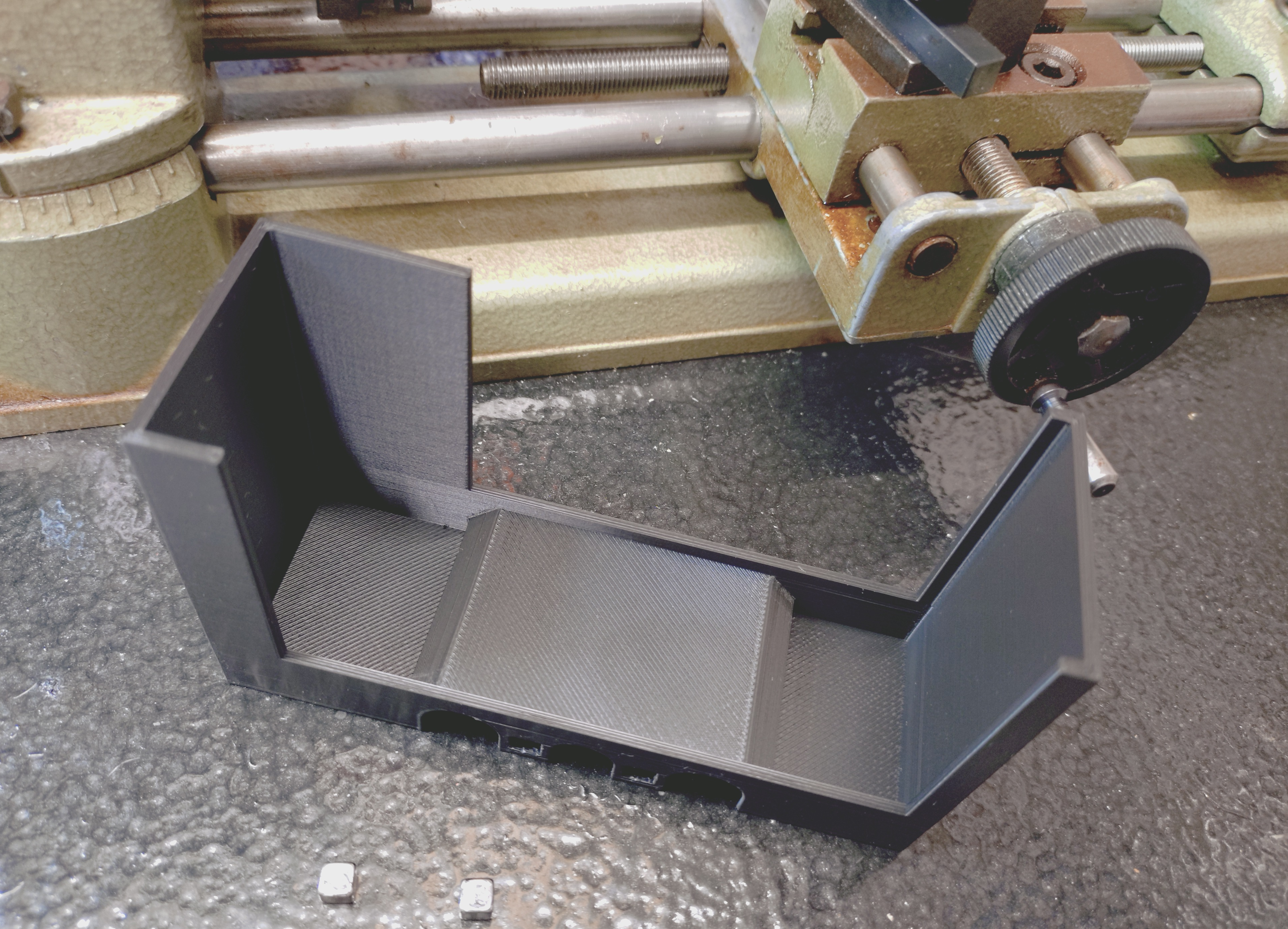 Mẫu khay hứng phoi nhỏ cho máy tiện Emco Unimat, giúp gom phoi gọn gàng khi gia công. Có thể gắn nam châm 5×5 mm để giữ khay chắc hơn, nhưng không bắt buộc. Lưu ý mâm cặp không chạm vào khay.